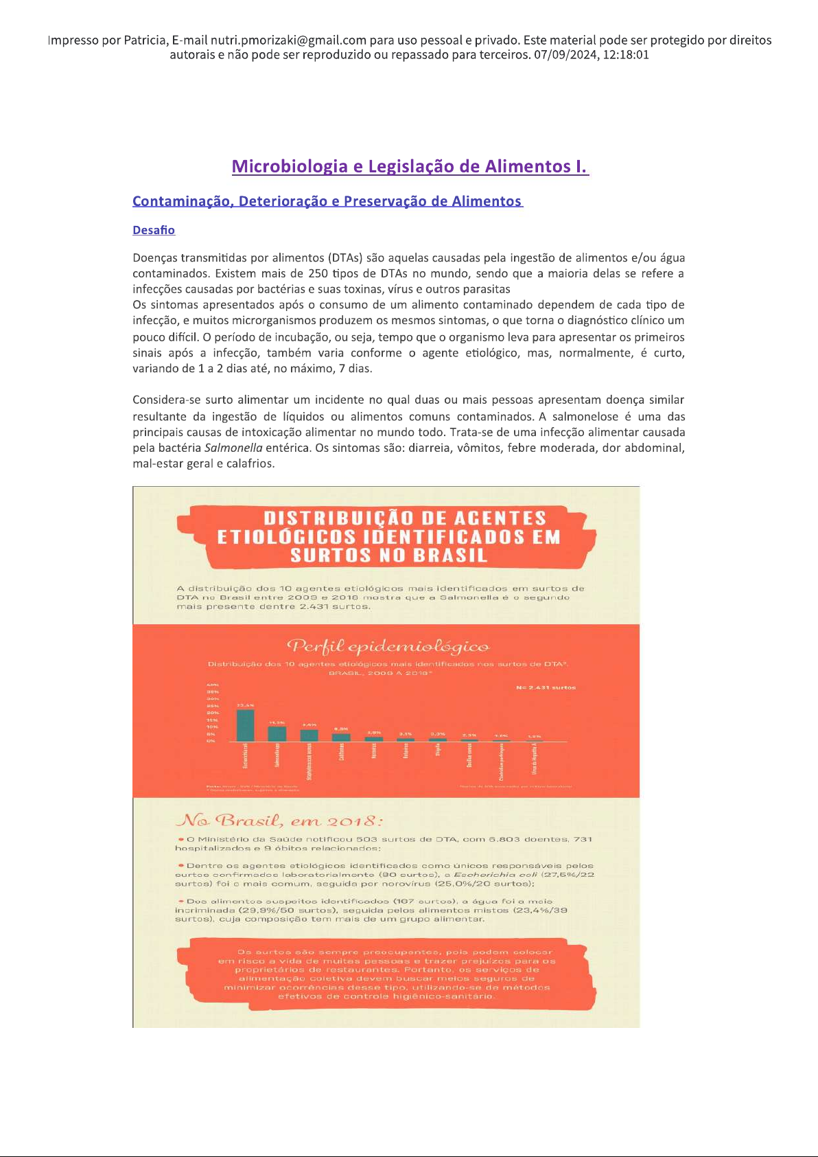 Impresso por Patricia, E-mail nutri.pmorizaki@gmail.com para uso pessoal e privado. Este material pode ser protegido por direitos autorais e não pode ser reproduzido ou repassado para terceiros. 07/09/2024, 12:18:01 Microbiologia e Legislação de Alimentos I. Contaminação, Deterioração e Preservação de Alimentos Desafio Doenças transmitidas por alimentos (DTAs) são aquelas causadas pela ingestão de alimentos e/ou água contaminados. Existem mais de 250 tipos de DTAs no mundo, sendo que a maioria delas se refere a infecções causadas por bactérias e suas toxinas, vírus e outros parasitas Os sintomas apresentados após o consumo de um alimento contaminado dependem de cada tipo de infecção, e muitos microrganismos produzem os mesmos sintomas, o que torna o diagnóstico clínico um pouco difícil. período de incubação, ou seja, tempo que o organismo leva para apresentar os primeiros sinais após a infecção, também varia conforme o agente etiológico, mas, normalmente, é curto, variando de 1 a 2 dias até, no máximo, 7 dias. Considera-se surto alimentar um incidente no qual duas ou mais pessoas apresentam doença similar resultante da ingestão de líquidos ou alimentos comuns contaminados. A salmonelose é uma das principais causas de intoxicação alimentar no mundo todo. Trata-se de uma infecção alimentar causada pela bactéria Salmonella entérica. Os sintomas são: diarreia, vômitos, febre moderada, dor abdominal, mal-estar geral e calafrios. DISTRIBUIÇÃO DE AGENTES ETIOLÓGICOS IDENTIFICADOS EM SURTOS NO BRASIL A distribuição dos 10 agentes etiológicos mais em surtos de DTA no Brasil entre 2009 e 2018 mostra que a Salmonella segundo mais presente dentre 2.431 surtos. Perfil epidemiológico Distribuição dos 10 agentes etiológicos mais identificados nos surtos de 2009 A 431 surtos No Brasil, em 2018: Ministério da Saúde notificou 503 surtos de com 6.803 731 hospitalizados e 9 óbitos relacionados; Dentre agentes etiológicos identificados como únicos responsáveis pelos surtos confirmados laboratorialmente (80 surtos), a Escherichia coli (27,5%/22 surtos) foi mais comum, seguida por (25,0%/20 Dos alimentos suspeitos identificados (167 surtos), a água foi a mais incriminada (29,9%/50 surtos), seguida pelos alimentos mistos (23,4%/39 cuja composição tem mais de um grupo alimentar. Os surtos são sempre pois podem colocer em risco a vida de muitas pessoas trazer prejuízos para proprietários de restaurantes. os serviços de alimentação coletiva devem buscar seguros de minimizar desse tipo, utilizando-se de métodos efetivos de controleImpresso por Patricia, E-mail para uso pessoal e privado. Este material pode ser protegido por direitos autorais e não pode ser reproduzido ou repassado para terceiros. 07/09/2024, 12:18:01 Foi constatado um surto por Salmonella, que atingiu 27 pessoas. Após a análise laboratorial, foi verificado que ele foi causado por peito de frango grelhado servido durante o almoço por um serviço de alimentação coletiva em uma pequena cidade do interior de Minas Gerais. Você foi contratado para descobrir qual a causa dessa intoxicação alimentar. Analise o quadro e explique para o proprietário do restaurante: a) A carne de frango já estava contaminada por Salmonella ou a contaminação aconteceu dentro da UAN? b) Qual a causa da contaminação? c) Quais são as medidas preventivas que devem ser tomadas para evitar novas contaminações? Cite, no mínimo, três dessas medidas. Padrão de resposta esperado. a) Por se tratar de frango grelhado, que foi submetido a um processamento térmico, e devido ao fato de que a Salmonella é uma bactéria que não resiste ao calor, constata-se que a contaminação ocorreu dentro do serviço de alimentação coletiva. Ressalta-se que, mesmo que a matéria-prima estivesse contaminada, se a manipulação tivesse sido feita de forma controlada, a bactéria seria eliminada durante o processo de cozimento. b) A contaminação foi causada pelos manipuladores, que não atentaram aos cuidados higiênicos sanitários durante a manipulação e não grelharam o frango até que ele atingisse a temperatura adequada. c) As medidas que devem ser tomadas para evitar novos episódios de contaminação são: 1. Cozinhar bem as aves, a carne moída e os ovos. 2. Não utilizar ovos crus ou leite cru (não pasteurizado) para o preparo de alimentos. 3. Lavar as mãos, as superfícies de trabalho da cozinha e os utensílios com água e sabão imediatamente após o contato com carne crua ou aves. 4. Ter cuidados redobrados com os alimentos preparados para bebês, idosos e imunocomprometidos. Exercícios 1. Alimentos deteriorados são aqueles indesejáveis ou inaceitáveis para o consumo humano, visto que apresentam alterações nas suas características organolépticas. Já os alimentos contaminados são aqueles que têm características normais, mas causam doenças. Sobre a deterioração e a contaminação dos alimentos, assinale a alternativa correta: Você acertou! B. São exemplos de alimentos perecíveis: leite, carne, ovos e frutas. São exemplos de alimentos não perecíveis: arroz, feijão, macarrão, enlatados e defumados. 2. As DTAs são causadas por diversos microrganismos e incluem sintomas como diarreia, tonturas, vômitos, desidratação, entre outros, e podem levar à morte. Sobre os microrganismos causadores de DTAs, assinale a alternativa correta:Impresso por Patricia, E-mail para uso pessoal e privado. Este material pode ser protegido por direitos autorais e não pode ser reproduzido ou repassado para terceiros. 07/09/2024, 12:18:01 Você acertou! D. A maioria dos bolores está envolvida na deterioração dos alimentos, porém seu uso na indústria de alimentos pode ocorrer principalmente na fabricação de queijos como o roquefort e o camembert 3. A deterioração pode ocorrer pela ação biológica, química e física de maneira conjunta. Por exemplo, bactérias, insetos e luz todos podem