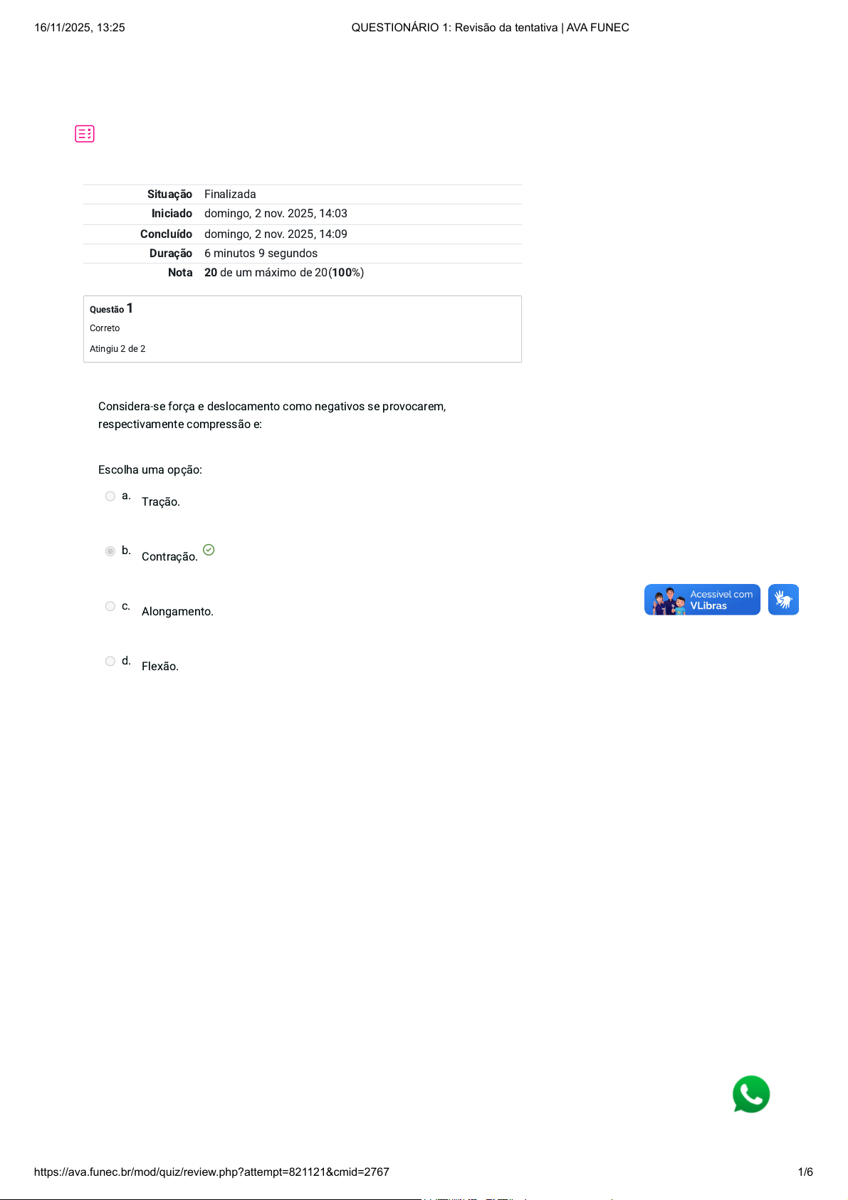 Situação Finalizada Iniciado domingo, 2 nov. 2025, 14:03 Concluído domingo, 2 nov. 2025, 14:09 Duração 6 minutos 9 segundos Nota 20 de um máximo de 20(100%) Questão 1 Correto Atingiu 2 de 2 Considera-se força e deslocamento como negativos se provocarem, respectivamente compressão e: Escolha uma opção: a. Tração. b. Contração. c. Alongamento. d. Flexão. 16/11/2025, 13:25 QUESTIONÁRIO 1: Revisão da tentativa | AVA FUNEC https://ava.funec.br/mod/quiz/review.php?attempt=821121&cmid=2767 1/6 Questão 2 Correto Atingiu 2 de 2 Questão 3 Correto Atingiu 2 de 2 Os materiais dúcteis são caracterizados por apresentarem escoamento a temperaturas normais. São exemplos destes materiais, exceto: Escolha uma opção: a. Aço. b. Alumínio. c. Vidro. d. Cobre. De acordo com a Primeira Lei de Newton, quando a resultante das forças que atuam sobre um corpo é nula, o corpo permanece em seu estado de repouso ou em movimento retilíneo uniforme. Para que um corpo esteja em equilíbrio é necessário que o somatório das forças atuantes e o somatório dos momentos em relação a um ponto qualquer sejam: Escolha uma opção: a. Nulos. b. Diferentes de 0. c. Iguais a 1. d. Menores que 0. 16/11/2025, 13:25 QUESTIONÁRIO 1: Revisão da tentativa | AVA FUNEC https://ava.funec.br/mod/quiz/review.php?attempt=821121&cmid=2767 2/6 Questão 4 Correto Atingiu 2 de 2 Questão 5 Correto Atingiu 2 de 2 O conjunto mostrado na figura consiste de um tubo de alumínio AB com área da seção transversal de 400 mm². Uma haste de aço de 10 mm de diâmetro está acoplada a um colar rígido que passa através do tubo. Se for aplicada uma carga de tração de 80 kN à haste, qual será o deslocamento da extremidade C? Supor que Eaço = 200 GPa e Eal = 70 GPa. Escolha uma opção: a. Δɭc = 6,20mm. b. Δɭc = 7,20mm. c. Δɭc = 5,20mm. d. Δɭc = 4,20mm. Uma barra de seção circular com 50 mm de diâmetro, é tracionada por uma carga normal de 24 kN. A tensão normal atuante na barra é: Escolha uma opção: a. 15,66 MPa. b. 11,77 MPa. c. 12,22 MPa. d. 18,33 MPa. 16/11/2025, 13:25 QUESTIONÁRIO 1: Revisão da tentativa | AVA FUNEC https://ava.funec.br/mod/quiz/review.php?attempt=821121&cmid=2767 3/6 https://ava.funec.br/mod/resource/view.php?id=17731 Questão 6 Correto Atingiu 2 de 2 Questão 7 Correto Atingiu 2 de 2 O Fator de Segurança é um número maior que __, a fim de evitar maior possibilidade de falha. A alternativa que completa a lacuna é: Escolha uma opção: a. 10 b. 0. c. 1. d. -1. No projeto de um elemento estrutural ou componente de máquina, deve-se considerar que a carga limite do material seja maior que o carregamento que este irá suportar em condições normais de utilização. Este carregamento menor é chamado de: Escolha uma opção: a. Admissível. b. Deformação. c. Normal. d. Tensão. 16/11/2025, 13:25 QUESTIONÁRIO 1: Revisão da tentativa | AVA FUNEC https://ava.funec.br/mod/quiz/review.php?attempt=821121&cmid=2767 4/6 Questão 8 Correto Atingiu 2 de 2 Questão 9 Correto Atingiu 2 de 2 Calcular a resultante das forças F1 = 80N, F2 = 30 N e F3 = 135 N aplicadas no bloco da figura. A resposta correta é: Escolha uma opção: a. 85. b. 185. c. 25. d. 125. Uma barra de alumínio de possui uma secção transversal quadrada com 60 mm de lado, o seu comprimento é de 0,8m. A carga axial aplicada na barra é de 50 kN. Determine o seu alongamento. Eal = 70 MPa. O valor do alongamento é: Escolha uma opção: a. 15,87mm x 10 b. 12,58mm x 10 c. 10,42mm x 10 d. 9,52mm x 10 Δɭ= -2 Δɭ= -2 Δɭ= -2 Δɭ= -2 16/11/2025, 13:25 QUESTIONÁRIO 1: Revisão da tentativa | AVA FUNEC https://ava.funec.br/mod/quiz/review.php?attempt=821121&cmid=2767 5/6 Questão 10 Correto Atingiu 2 de 2 --> As forças distribuídas ao longo de um comprimento são expressas com as unidades de força pelo: Escolha uma opção: a. Peso. b. Comprimento. c. Largura. d. Hélices. 16/11/2025, 13:25 QUESTIONÁRIO 1: Revisão da tentativa | AVA FUNEC https://ava.funec.br/mod/quiz/review.php?attempt=821121&cmid=2767 6/6