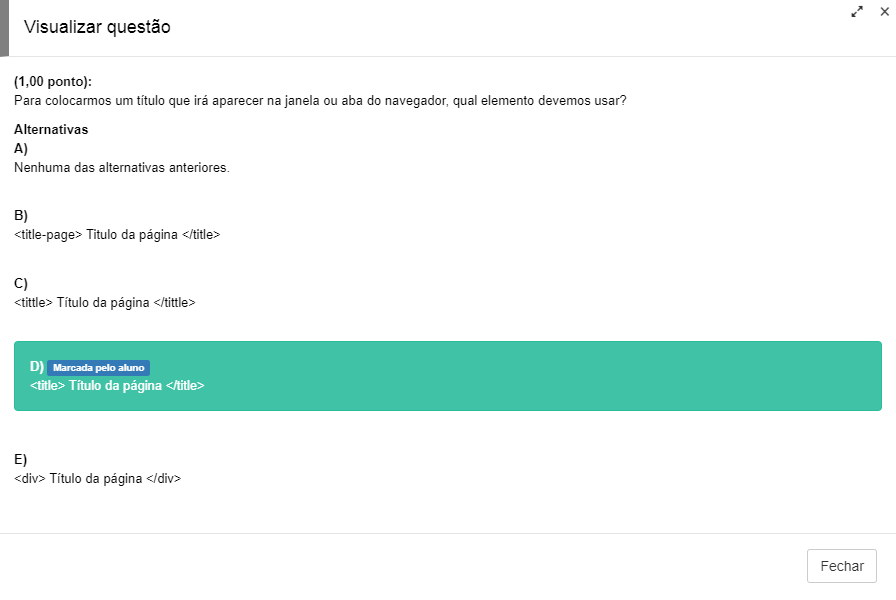 X Visualizar questão (1,00 ponto): Para colocarmos um que aparecer na janela ou aba do navegador, qual elemento devemos usar? Alternativas A) Nenhuma das alternativas B) Titulo da página C) da D) Marcada pelo aluno Título da página E) Título da Fechar