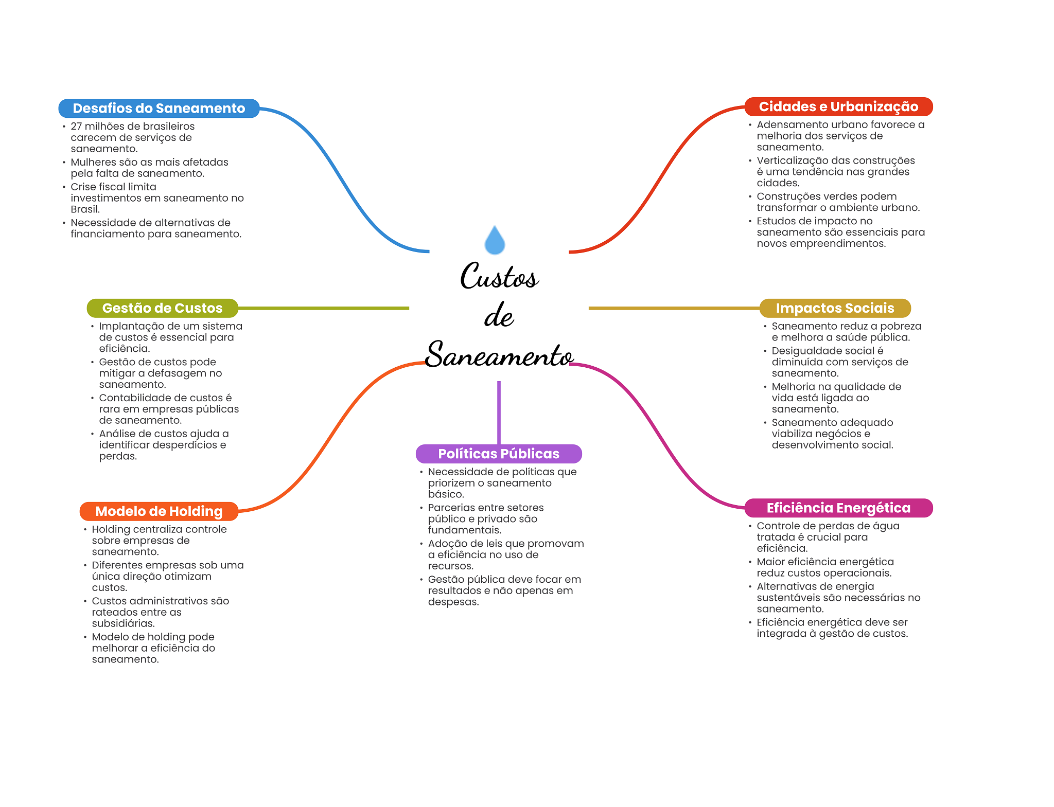 Desafios do Saneamento Cidades e Urbanização 27 milhões de brasileiros Adensamento urbano favorece a carecem de serviços de melhoria dos serviços de saneamento. saneamento. Mulheres são as mais afetadas Verticalização das construções pela falta de saneamento. é uma tendência nas grandes Crise fiscal limita cidades. investimentos em saneamento no Construções verdes podem Brasil. transformar ambiente urbano. Necessidade de alternativas de Estudos de impacto no financiamento para saneamento. saneamento são essenciais para novos empreendimentos. Custos Gestão de Custos de Impactos Sociais Implantação de um sistema Saneamento reduz a pobreza de custos é essencial para e melhora a saúde pública. eficiência. Saneamento Desigualdade social é Gestão de custos pode diminuída com serviços de mitigar a defasagem no saneamento. saneamento. Melhoria na qualidade de Contabilidade de custos é vida está ligada ao rara em empresas públicas saneamento. de saneamento. Saneamento adequado Análise de custos ajuda a viabiliza negócios e identificar desperdícios e desenvolvimento social. perdas. Políticas Públicas Necessidade de políticas que priorizem O saneamento básico. Modelo de Holding Parcerias entre setores Eficiência Energética público e privado são Holding centraliza controle fundamentais. Controle de perdas de água sobre empresas de tratada é crucial para Adoção de leis que promovam saneamento. eficiência. a eficiência no uso de Diferentes empresas sob uma recursos. Maior eficiência energética única direção otimizam reduz custos operacionais. Gestão pública deve focar em custos. resultados e não apenas em Alternativas de energia Custos administrativos são despesas. sustentáveis são necessárias no rateados entre as saneamento. subsidiárias. Eficiência energética deve ser Modelo de holding pode integrada à gestão de custos. melhorar a eficiência do saneamento.