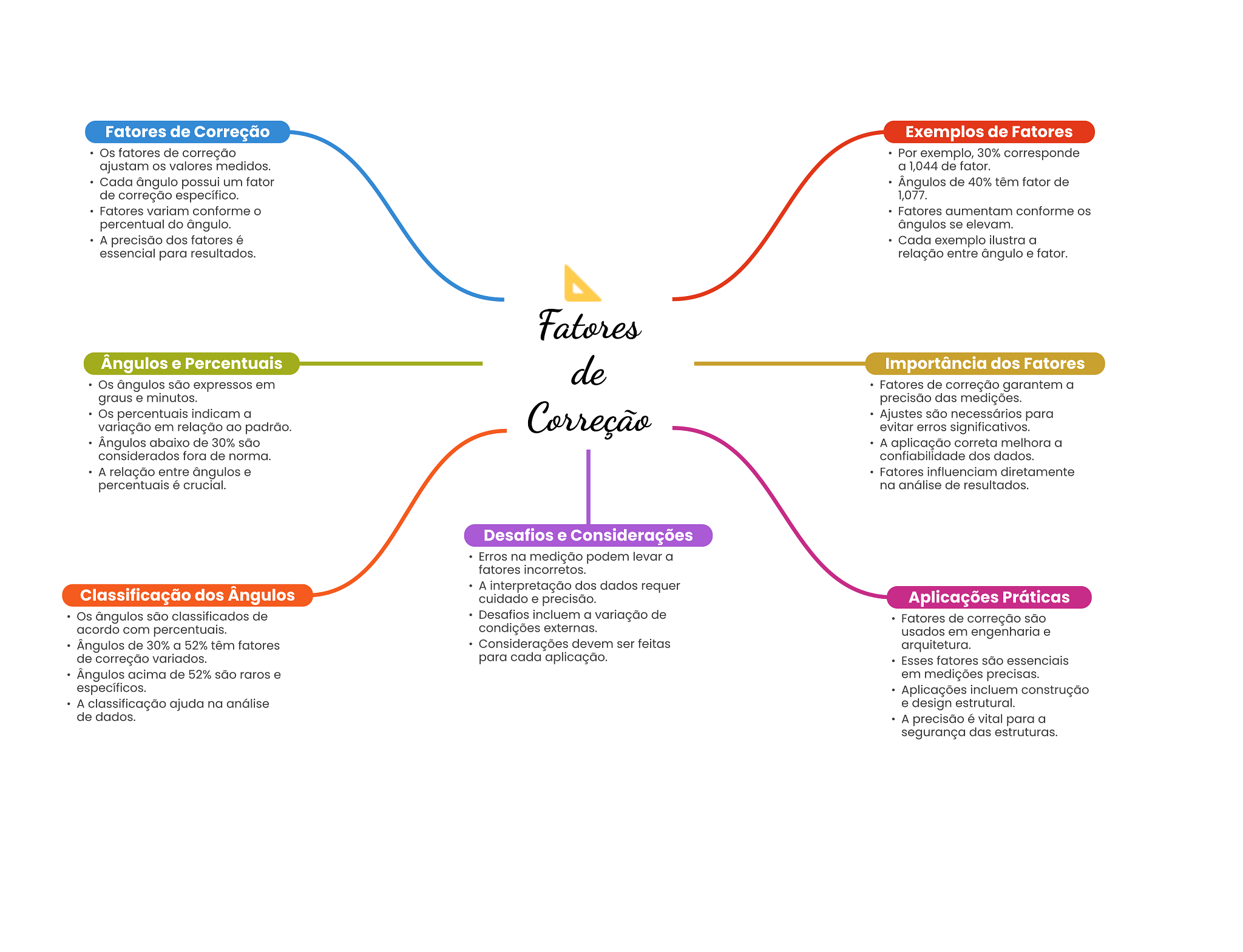 Fatores de Correção Exemplos de Fatores Os fatores de correção Por exemplo, 30% corresponde ajustam valores medidos. a 1,044 de fator. Cada ângulo possui um fator Ângulos de 40% têm fator de de correção específico. 1,077. Fatores variam conforme Fatores aumentam conforme percentual do ângulo. ângulos se elevam. A precisão dos fatores é Cada exemplo ilustra a essencial para resultados. relação entre ângulo e fator. Fatores Ângulos e Percentuais de Importância dos Fatores Os ângulos são expressos em Fatores de correção garantem a graus e minutos. precisão das medições. Os percentuais indicam a variação em relação ao padrão. Correção Ajustes são necessários para evitar erros significativos. Ângulos abaixo de 30% são A aplicação correta melhora a considerados fora de norma. confiabilidade dos dados. A relação entre ângulos e Fatores influenciam diretamente percentuais é crucial. na análise de resultados. Desafios e Considerações Erros na medição podem levar a fatores incorretos. A interpretação dos dados requer Classificação dos Ângulos cuidado e precisão. Aplicações Práticas Os ângulos são classificados de Desafios incluem a variação de Fatores de correção são acordo com percentuais. condições externas. usados em engenharia e Ângulos de 30% a 52% têm fatores Considerações devem ser feitas arquitetura. de correção variados. para cada aplicação. Esses fatores são essenciais Ângulos acima de 52% são raros e em medições precisas. específicos. Aplicações incluem construção A classificação ajuda na análise e design estrutural. de dados. A precisão é vital para a segurança das estruturas.