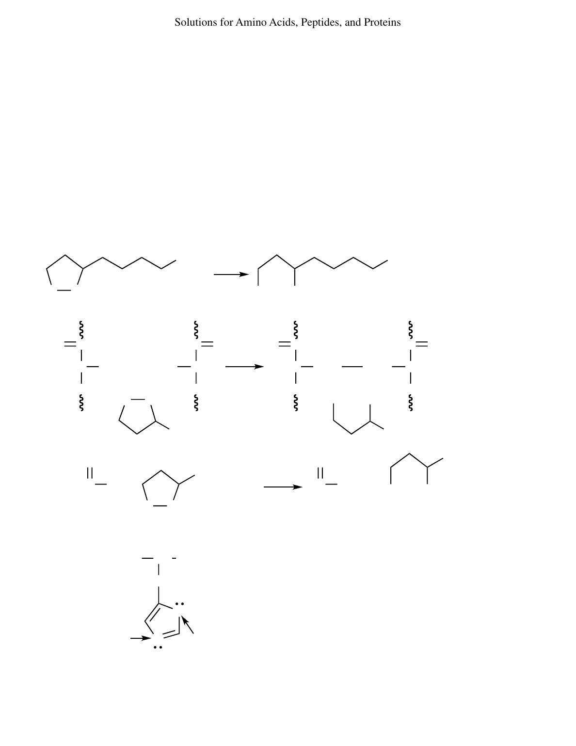 Solutions for Amino Acids, Peptides, and Proteins C HC O CH2SH HN S S COOH NH CHHSCH2 C O SS R RC O H (CH2)4COOH SS CH COOH CH2 H2N N NH HN HC CH2S CO RC OH O COOH SH SH R SH SH C CH O SCH2 NH SH SH (CH2)4COOH 46 (a) There are two possible sources of ammonia in the hydrolysate. The C-terminus could have been present as the amide instead of the carboxyl, or the glutamic acid could have been present as its amide, glutamine. (b) The C-terminus is present as the amide. The N-terminus is present as the lactam (cyclic amide) combining the amino group with the carboxyl group of the glutamic acid side chain. (c) The fact that hydrolysis does not release ammonia implies that the C-terminus is not an amide. Yet, carboxypeptidase treatment gives no reaction, showing that the C-terminus is not a free carboxyl group. Also, treatment with phenyl isothiocyanate gives no reaction, suggesting no free amine at the N-terminus. The most plausible explanation is that the N-terminus has reacted with the C-terminus to produce a cyclic amide, a lactam. (These large rings, called macrocycles, are often found in nature as hormones or antibiotics.) 47 (a) Lipoic acid is a mild oxidizing agent. In the process of oxidizing another reactant, lipoic acid is reduced. oxidized form reduced form (b) (c) H2O + + + basic not basic: pyrrole-type N 48 (a) histidine: See the solution to Problem 6. pyridine-type N 652
