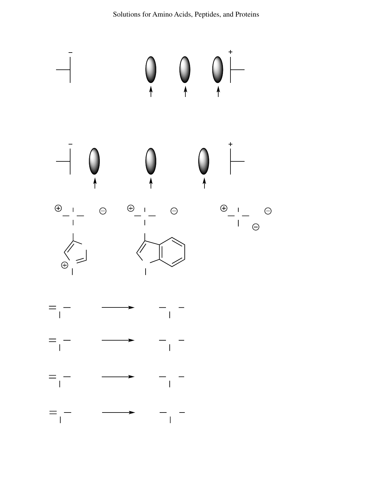 Solutions for Amino Acids, Peptides, and Proteins –1 7 At pH 9.7, alanine (isoelectric point (pI) 6.0) has a charge of –1 and will migrate to the anode. Lysine (pI 9.7) is at its isoelectric point and will not move. Aspartic acid (pI 2.8) has a charge of –2 and will also migrate to the anode, faster than alanine. –2 cathode anode lysine aspartic acid 0 alanine H3N C CH2S COO H H3N C CH2 COO N H H C COO CH2 H3N N NH H H (The SH is more acidic than the NH3 + group.) 8 At pH 6.0, tryptophan (pI 5.9) has a charge of zero and will not migrate. Cysteine (pI 5.0) has a partial negative charge and will move toward the anode. Histidine (pI 7.6) has a partial positive charge and will move toward the cathode. cysteinehistidine tryptophan cathode histidine (partially protonated imidazole ring) tryptophan cysteine (partially deprotonated sulfur) anode C COOH CH3 NH3 C CH2CH(CH3)2 COOH C COOH CH2OH C CH2CH2CONH2 COOH NH3 NH3 NH3 H2N CH CH3 COOH H2N CH CH2OH COOH CH COOH CH2CH(CH3)2 H2N CH COOH CH2CH2CONH2 H2N 9 (a) H2, Pd H2, Pd (b) (c) H2, Pd H2, Pd (d) O O O O 631