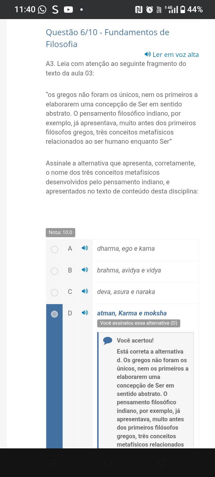 11:40 S N 44% Questão 6/10 Fundamentos de Filosofia Ler em voz alta Leia com atenção ao seguinte fragmento do texto da aula 03: "os gregos não foram os únicos, nem os primeiros a elaborarem uma concepção de Ser em sentido abstrato. 0 pensamento filosófico indiano, por exemplo, já apresentava, muito antes dos primeiros filósofos gregos, três conceitos metafísicos relacionados ao ser humano enquanto Ser" Assinale a alternativa que apresenta, corretamente, nome dos três conceitos metafísicos desenvolvidos pelo pensamento indiano, e apresentados no texto de conteúdo desta disciplina: Nota: 10.0 A dharma, ego e kama B brahma, avidya e vidya C deva, asura e naraka D atman, Karma e moksha Você assinalou essa alternativa (D) Você acertou! Está correta a alternativa d. Os gregos não foram os únicos, nem os primeiros a elaborarem uma concepção de Ser em sentido abstrato. pensamento filosófico indiano, por exemplo, já apresentava, muito antes dos primeiros filósofos gregos, três conceitos metafísicos relacionados