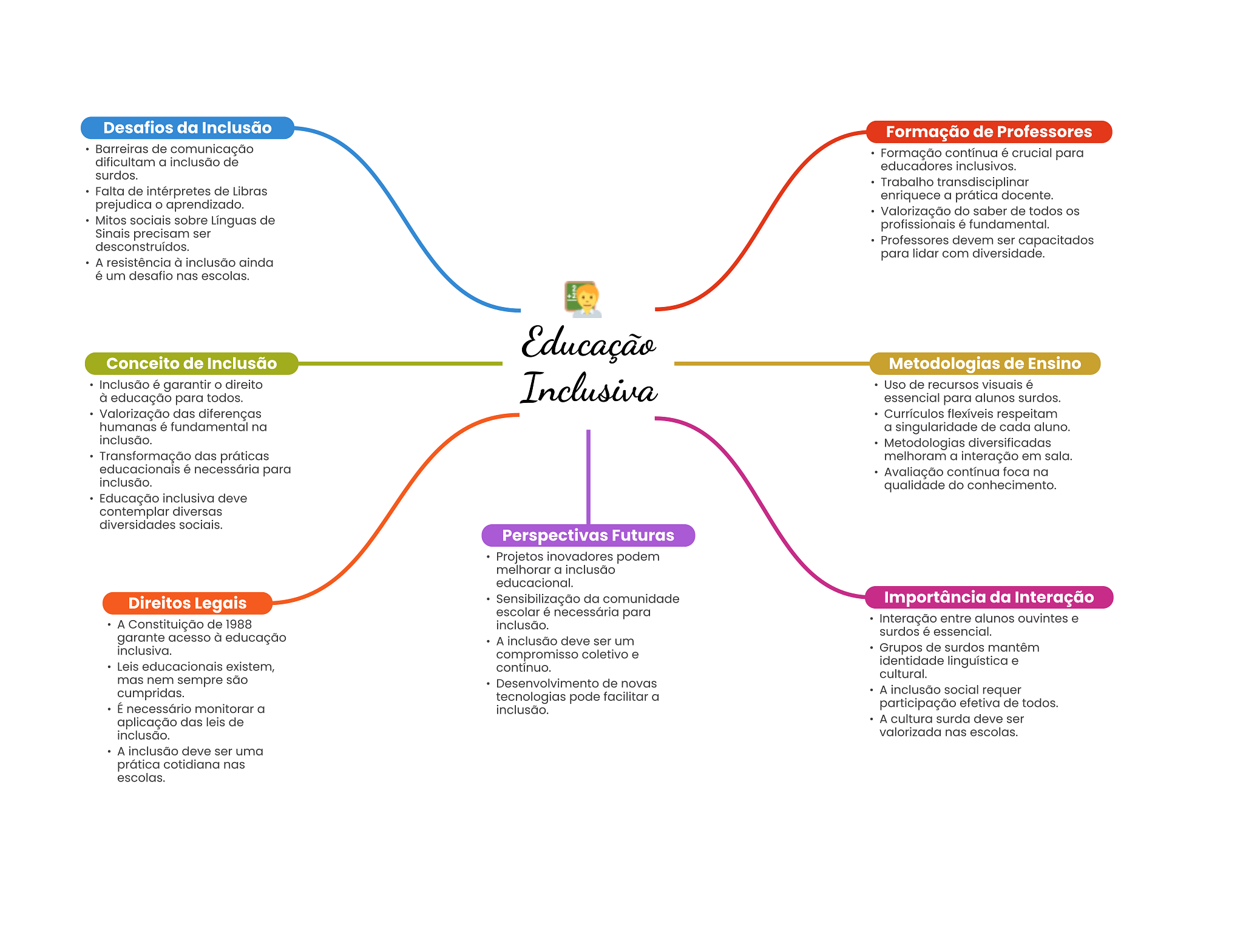 Desafios da Inclusão Formação de Professores Barreiras de comunicação Formação contínua é crucial para dificultam a inclusão de educadores inclusivos. surdos. Trabalho transdisciplinar Falta de intérpretes de Libras enriquece a prática docente. prejudica aprendizado. Valorização do saber de todos os Mitos sociais sobre Línguas de profissionais é fundamental. Sinais precisam ser desconstruídos. Professores devem ser capacitados para lidar com diversidade. A resistência à inclusão ainda é um desafio nas escolas. Educação Conceito de Inclusão Metodologias de Ensino Inclusão é garantir direito Inclusiva Uso de recursos visuais é à educação para todos. essencial para alunos surdos. Valorização das diferenças Currículos flexíveis respeitam humanas é fundamental na a singularidade de cada aluno. inclusão. Metodologias diversificadas Transformação das práticas melhoram a interação em sala. educacionais é necessária para Avaliação contínua foca na inclusão. qualidade do conhecimento. Educação inclusiva deve contemplar diversas diversidades sociais. Perspectivas Futuras Projetos inovadores podem melhorar a inclusão educacional. Direitos Legais Sensibilização da comunidade Importância da Interação escolar é necessária para A Constituição de 1988 inclusão. Interação entre alunos ouvintes e surdos é essencial. garante acesso à educação A inclusão deve ser um inclusiva. Grupos de surdos mantêm compromisso coletivo e Leis educacionais existem, contínuo. identidade linguística e cultural. mas nem sempre são Desenvolvimento de novas cumpridas. tecnologias pode facilitar a A inclusão social requer É necessário monitorar a inclusão. participação efetiva de todos. aplicação das leis de A cultura surda deve ser inclusão. valorizada nas escolas. A inclusão deve ser uma prática cotidiana nas escolas.