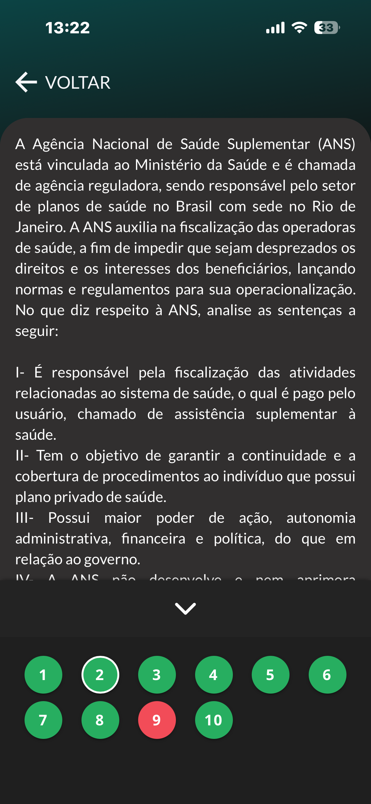 13:22 33 VOLTAR A Agência Nacional de Saúde Suplementar (ANS) está vinculada ao Ministério da Saúde e é chamada de agência reguladora, sendo responsável pelo setor de planos de saúde no Brasil com sede no Rio de Janeiro. A ANS auxilia na fiscalização das operadoras de saúde, a fim de impedir que sejam desprezados os direitos e os interesses dos beneficiários, lançando normas e regulamentos para sua operacionalização. No que diz respeito à ANS, analise as sentenças a seguir: I- É responsável pela fiscalização das atividades relacionadas ao sistema de saúde, qual é pago pelo usuário, chamado de assistência suplementar à saúde. II- Tem objetivo de garantir a continuidade e a cobertura de procedimentos ao indivíduo que possui plano privado de saúde. III- Possui maior poder de ação, autonomia administrativa, financeira e política, do que em relação ao governo. IV_ não 1 2 3 4 5 6 7 8 9 10
