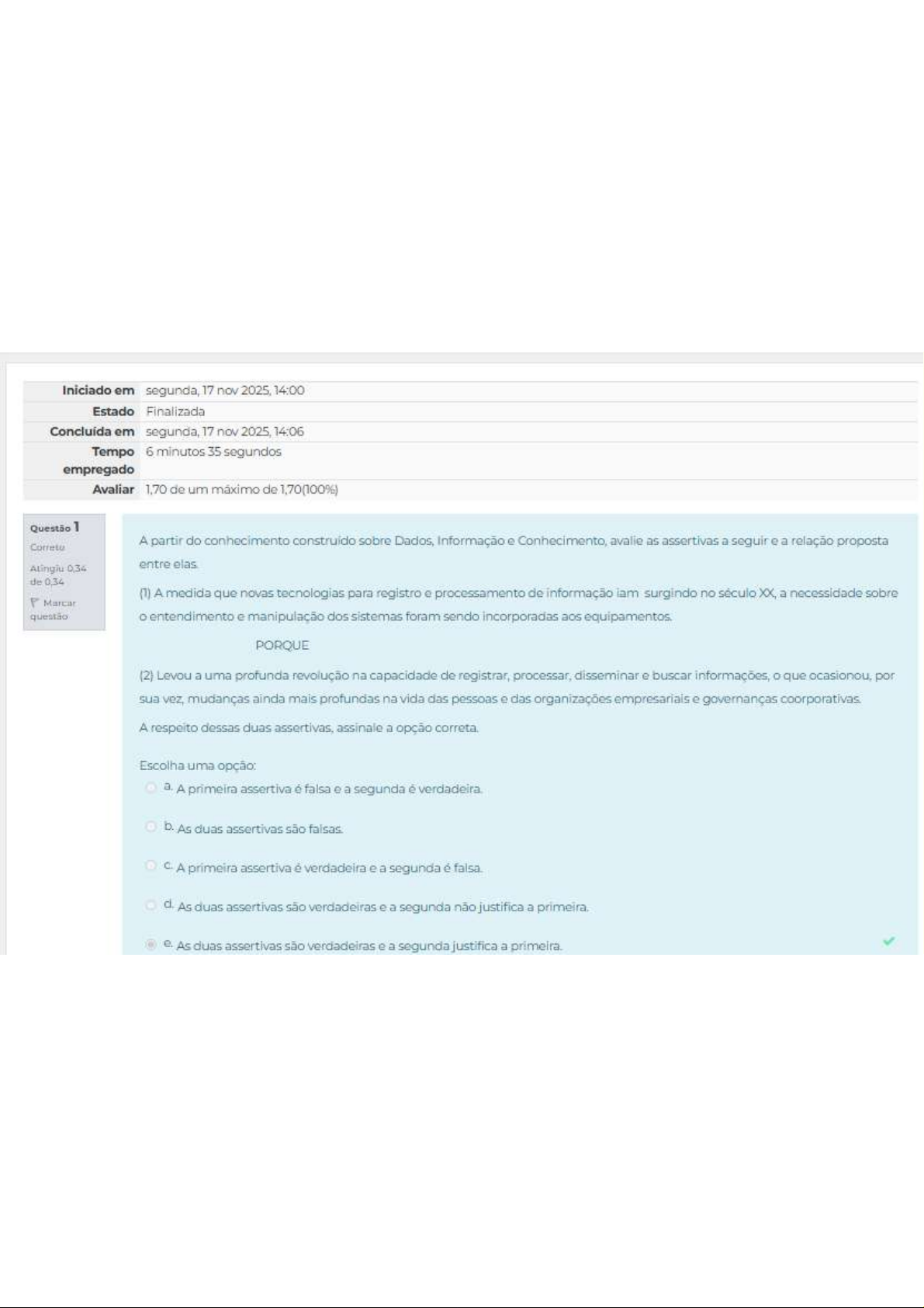Iniciado em segunda, 17 nov 2025, 14:00 Estado Finalizada em segunda, 17 nov 2025, 14:06 Tempo 6 minutos 35 segundos empregado Avaliar 1,70 de um máximo de 1,70(100%) Questão 1 Correto A partir do conhecimento construído sobre Dados, Informação e Conhecimento, avalie as assertivas a seguir e a relação proposta 0,34 entre de 0,34 (1) A medida que novas tecnologias para registro e processamento de informação iam surgindo no século XX, a necessidade sobre Marcar questão o entendimento e manipulação dos sistemas foram sendo incorporadas aos equipamentos. PORQUE (2) Levou a uma profunda revolução na capacidade de registrar, processar, disseminar e buscar informações, o que ocasionou, por sua vez, mudanças ainda mais profundas na vida das pessoas e das organizações empresariais e governanças coorporativas. A respeito dessas duas assertivas, assinale a opção Escolha uma opção: a. A primeira assertiva é falsa e a segunda é verdadeira. b. As duas assertivas são A primeira assertiva è verdadeira e a segunda é falsa. d. As duas assertivas são verdadeiras e a segunda não justifica a primeira. e. As duas assertivas são verdadeiras e a segunda justifica a primeira.Questão 2 A partir dos conhecimentos adquiridos sobre Sistemas de Informação, analise as afirmativas: Correto Atingiu 0,34 de 0,34 I Os sistemas de informação baseados em computador visam melhorar os processos de conhecimento, avaliação e gestão. F Marcar questão Os Sistemas de informação computadorizados bem-sucedidos agregam informações da empresa e as organizam de maneira a permitir o acesso e a geração de relatórios tais como padrão de comportamento e perfil de clientes e tendências de III Os sistemas de informação são projetados para trabalhar a integração das informações, se limitando a executar funções específicas como processamento de pedidos e de dados. Após a avaliação, assinale a resposta correta. Escolha uma opção: a. As afirmativas e estão certas. b. As afirmativas e estão certas. Apenas a afirmativa está certa. d. As afirmativas I e estão Apenas a afirmativa está certa.Questão 3 A evolução dos sistemas da informação foi um grande passo para 0 mundo tecnológico, analise as assertivas a seguir e a relação Correto Atingiu 0,34 proposta entre elas. de 0,34 (7) Com a evolução tecnológica, a abordagem sistêmica da informação começou a ser uma tendência e uma necessidade nas Marcar questão organizações. PORQUE (2) Os Sistemas de Informação vieram a dar ao computador uma nova dimensão, transformando-o de mero processador de dados em elemento preponderante na racionalização e na dinamização do trabalho na empresa. A respeito dessas duas assertivas, assinale a opção correta. Escolha uma opção: a. A primeira assertiva é verdadeira e a segunda é falsa. b. A primeira assertiva é falsa e a segunda é verdadeira. As duas assertivas são verdadeiras e a segunda não justifica a primeira. d. As duas assertivas são verdadeiras e a segunda justifica a primeira. e. As duas assertivas são falsas.Questão 4 Os sistemas de informação apresentam aspectos internos e externos. Neste sentido, analise as afirmativas a seguir que dizem Correto respeito exclusivamente aos aspectos internos dos Sistemas de Informação implantados em uma organização: Atinglu 0,34 de 0,34 I Os aspectos internos referem-se especificamente às questões de tecnologia e Marcar questão Software e hardware são exemplos de aspectos internos. III processo de tomada de decisão e de definição de preço, como referem-se aos aspectos internos, dependem da estrutura montada pela empresa para suportar um sistema de informação e suas funcionalidades. Após a análise, assinale a opção correta. Escolha uma opção: a. As afirmativas e III estão b. Apenas a afirmativa I está certa. As afirmativas e estão d. As afirmativas e estão e. Apenas a afirmativa III está certa.Questão 5 Sistema de Informação é um processo ou conjunto de componentes que coleta, processa, armazena, analisa e discrimina Correto informações para uma finalidade e, para que isto acontecer, necessário que haja um fluxo de informação e uma Atingiu 0,34 de 0,34 retroalimentação do sistema. Esses sistemas são em sua grande maioria apoiado por computadores. Os sistemas de informação Marcar têm como marco cronológico de evolução, a década de 1950 do século XX, no entanto, grande salto evolutivo nos sistemas de questão informação Escolha uma opção: a. Nos anos 1980, com a popularização dos computadores. b. Nos anos 1980, com a popularização dos sistemas de cálculo numérico. C. Nos anos 1980, com a popularização dos sistemas de informações gerenciais. d. Nos anos 1970, com a popularização dos novos padrões de qualidade da e. Nos anos 1970, com a popularização doa internet.