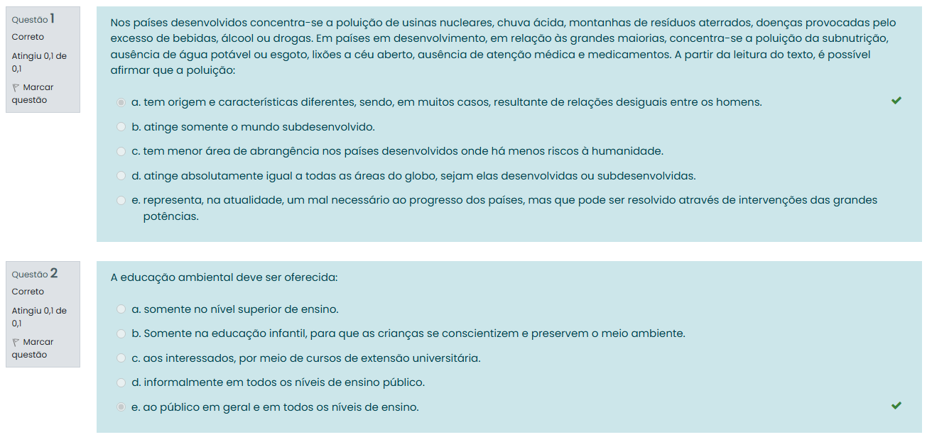 Questão 1 Nos países desenvolvidos concentra-se a poluição de usinas nucleares, chuva ácida, montanhas de resíduos aterrados, doenças provocadas pelo Correto excesso de bebidas, álcool ou drogas. Em países em desenvolvimento, em relação às grandes maiorias, concentra-se a poluição da subnutrição, Atingiu 0,1 de ausência de água potável ou esgoto, lixões a céu aberto, ausência de atenção médica e medicamentos. A partir da leitura do texto, é possível 0,1 afirmar que a poluição: Marcar questão a. tem origem e características diferentes, sendo, em muitos casos, resultante de relações desiguais entre OS homens. b. atinge somente O mundo subdesenvolvido. C. tem menor área de abrangência nos países desenvolvidos onde menos riscos à humanidade. d. atinge absolutamente igual a todas as áreas do globo, sejam elas desenvolvidas ou subdesenvolvidas. e. representa, na atualidade, um mal necessário ao progresso dos países, mas que pode ser resolvido através de intervenções das grandes potências. Questão 2 A educação ambiental deve ser oferecida: Correto Atingiu 0,1 de a. somente no nível superior de ensino. 0,1 b. Somente na educação infantil, para que as crianças se conscientizem e preservem O meio ambiente. Marcar questão C. aos interessados, por meio de cursos de extensão universitária. d. informalmente em todos de ensino público. e. ao público em geral e em todos OS níveis de ensino.
