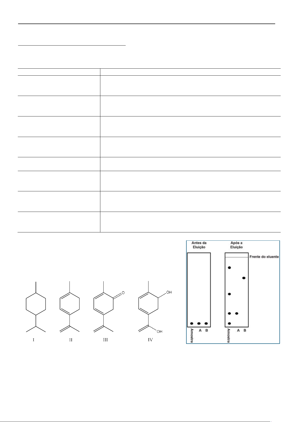 LISTA DE EXERCÍCIOS COMPLEMENTARES 03 – QUÍMICA ANALÍTICA E ANÁLISE INSTRUMENTAL – M53/25 Profª Drª Simone B. S. Sebold MÉTODOS CROMATOGRÁFICOS (Unidade 06) 01. RELACIONE cada uma das técnicas cromatográficas de acordo com a sua descrição. TÉCNICA CROMATOGRÁFICA DESCRIÇÃO 1. Cromatografia planar ( ) Técnica utilizada principalmente para a separação de compostos voláteis, onde a fase móvel é um gás e a fase estacionária é um líquido ou sólido. 2. Cromatografia em coluna ( ) Método que separa íons ou moléculas polares com base em sua carga, utilizando uma fase estacionária carregada que interage com as moléculas da amostra. 3. Cromatografia líquida de alta eficiência (CLAE) ( ) Processo que separa moléculas com base em suas interações com uma fase estacionária que possui grupos específicos que se ligam a certas moléculas, como enzimas ou anticorpos. 4. Cromatografia gasosa (CG) ( ) Técnica que separa moléculas com base em seu tamanho, utilizando uma coluna com material poroso que permite a passagem de pequenas moléculas e retém as maiores. 5. Cromatografia por exclusão ( ) Técnica que utiliza uma coluna onde a fase estacionária é quiral, permitindo a separação de enantiômeros. 6. Cromatografia por afinidade ( ) Método onde a separação ocorre em uma camada delgada de adsorvente aplicada em uma placa, sendo a fase móvel um solvente que migra através da placa por capilaridade. 7. Cromatografia quiral ( ) Técnica altamente eficiente que utiliza altas pressões para forçar a fase móvel líquida através de uma coluna cheia de partículas finas, permitindo a separação de compostos complexos. 8. Cromatografia de troca iônica ( ) Método que utiliza uma coluna preenchida com um adsorvente, através da qual a amostra é passada, sendo separada pela afinidade dos compostos com a fase estacionária. 02. Considerando a imagem ao lado, e as estruturas dos compostos abaixo, pertencentes à amostra analisada, JULGUE as afirmativas em Verdadeiras ou Falsas, considerando que a frente do solvente apolar hexano:éter de petróleo (4:1) mede 10 cm e que a fase estacionária utilizada foi Sílica Gel. ( ) O composto IV pode ser considerado um composto polar, devido à existência de grupos -OH na estrutura e, portanto, é a mancha mais retida da amostra com Rf = 0. ( ) O composto mais apolar corresponde ao I, devido à sua cadeia alifática (de hidrocarboneto) e, portanto, interagiu muito melhor com a fase móvel. ( ) Os compostos II e III diferem na existência de um heteroátomo e, então, a mancha que interage melhor com a fase estacionária corresponde à estrutura que possui o heteroátomo. 03. ESPECIFIQUE qual é o tipo de fase estacionária (normal ou reversa) mais adequada para separar: a) uma mistura de três álcoois. b) uma mistura de dois açúcares. c) uma mistura de parafinas. 04. ELENQUE quais os gases de arraste mais comuns utilizados em cromatografia a gás e ESCREVA qual é a finalidade do gás nesse método. 05. Na análise por cromatografia gasosa de uma mistura contendo os compostos na tabela abaixo foi realizada. a) Escolha e justifique a ordem de eluição em uma coluna C18. b) Escolha e justifique a ordem de eluição em uma coluna de Sílica fundida. c) Esboce o cromatograma que poderia ser obtido dessa separação nos itens a) e b). MÉTODOS ELETROANALÍTICOS (Unidade 07) 06. EVIDENCIE a diferença entre a eletrogravimetria e a coulometria. 07. DEFINA queda ôhmica observada na eletrogravimetria. 08. Um pesquisador está investigando a presença de íons de chumbo (Pb²⁺) em uma amostra de tecido estomacal. Ele decide utilizar a eletrogravimetria para quantificar a concentração de Pb²⁺ na amostra. Qual seria o potencial inicial necessário para gerar uma corrente de 0,2 A na célula eletrolítica se essa célula tiver uma resistência de 5,00 Ω? Pb2+(aq) + 2e → Pb(s) E0 = -0,13 V Zn2+(aq) + 2e → Zn(s) E0= -076 V Pb(s) | Pb2+ 2,0 mol/L || Zn2+ 1,0 mol/L | Zn(s) 09. O Cl- presente em 0,1500 g de uma amostra de urina foi determinado pela redução coulométrica a Cl2 em um cátodo de platina. Calcule a massa de cloreto (M = 35,5 g/mol) na amostra se 206,4 C forem necessários para promover a redução. 10. PESQUISE duas aplicações das titulações coulométrica.