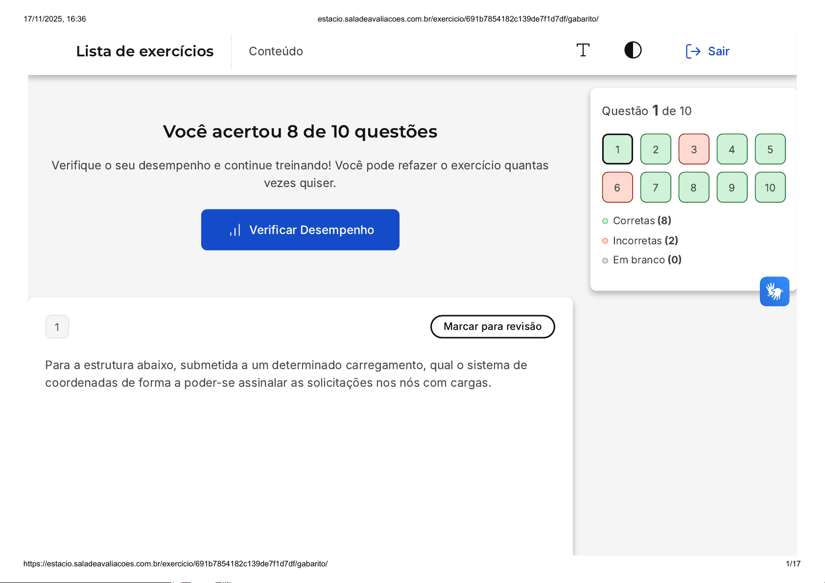 Você acertou 8 de 10 questões Verifique o seu desempenho e continue treinando! Você pode refazer o exercício quantas vezes quiser. Verificar Desempenho 1 Marcar para revisão Para a estrutura abaixo, submetida a um determinado carregamento, qual o sistema de coordenadas de forma a poder-se assinalar as solicitações nos nós com cargas. Questão 1 de 10 Corretas (8) Incorretas (2) Em branco (0) 1 2 3 4 5 6 7 8 9 10 Lista de exercícios Conteúdo Sair 17/11/2025, 16:36 estacio.saladeavaliacoes.com.br/exercicio/691b7854182c139de7f1d7df/gabarito/ https://estacio.saladeavaliacoes.com.br/exercicio/691b7854182c139de7f1d7df/gabarito/ 1/17 A B R = [52 -56 0 0 -83 -71 -29 -79 -200] R = [52 -56 0 0 -83 -71 -29 79 200] 17/11/2025, 16:36 estacio.saladeavaliacoes.com.br/exercicio/691b7854182c139de7f1d7df/gabarito/ https://estacio.saladeavaliacoes.com.br/exercicio/691b7854182c139de7f1d7df/gabarito/ 2/17 C D E R = [52 -56 0 0 -83 -71 -29 -79 200] R = [-52 -56 0 0 -83 -71 -29 -79 200] R = [52 56 0 0 -83 -71 -29 -79 200] Resposta correta Parabéns, você selecionou a alternativa correta. Confira o gabarito comentado! Gabarito Comentado Verificar o Sistema de Coordenadas Arbitrário 2 Marcar para revisão Os métodos de análise estrutural podem ser divididos em quantos grupos? 17/11/2025, 16:36 estacio.saladeavaliacoes.com.br/exercicio/691b7854182c139de7f1d7df/gabarito/ https://estacio.saladeavaliacoes.com.br/exercicio/691b7854182c139de7f1d7df/gabarito/ 3/17 A B C D E 01. 02. 03. 04. 05. Resposta correta Parabéns, você selecionou a alternativa correta. Confira o gabarito comentado! Gabarito Comentado Os métodos de análise estrutural podem ser divididos em dois (02) grupos. ----- 17/11/2025, 16:36 estacio.saladeavaliacoes.com.br/exercicio/691b7854182c139de7f1d7df/gabarito/ https://estacio.saladeavaliacoes.com.br/exercicio/691b7854182c139de7f1d7df/gabarito/ 4/17 A B C D E 3 Marcar para revisão A viga abaixo está sujeita a uma carga normal. Determinar as reações de apoios da viga. Dados: E = 1 x 10 kN/m I = Seção da viga 0,25m x 0,50m 8 2 HA = -54,33 kN e HB = 55,67 kN HA = 54,33 kN e HB = 55,67 kN HA = 54,33 kN e HB = -55,67 kN HA = -54,33 kN e HB = -55,67 kN HA = 59,33 kN e HB = 55,67 kN 17/11/2025, 16:36 estacio.saladeavaliacoes.com.br/exercicio/691b7854182c139de7f1d7df/gabarito/ https://estacio.saladeavaliacoes.com.br/exercicio/691b7854182c139de7f1d7df/gabarito/ 5/17 Resposta incorreta Opa! A alternativa correta é a letra B. Confira o gabarito comentado! Gabarito Comentado Usar 5 casas decimais 4 Marcar para revisão Para a estrutura abaixo, submetida a um determinado carregamento, qual o sistema de coordenadas de forma a poder-se assinalar as solicitações nos nós com cargas. 17/11/2025, 16:36 estacio.saladeavaliacoes.com.br/exercicio/691b7854182c139de7f1d7df/gabarito/ https://estacio.saladeavaliacoes.com.br/exercicio/691b7854182c139de7f1d7df/gabarito/ 6/17 A B C D E R = [265 0 0 0 -278 0 0 0 -650] R = [265 0 0 0 278 0 0 0 -650] R = [265 0 0 0 -278 0 0 0 650] R = [-265 0 0 0 -278 0 0 0 -650] R = [-265 0 0 0 278 0 0 0 650] Resposta correta Parabéns, você selecionou a alternativa correta. Confira o gabarito comentado! 17/11/2025, 16:36 estacio.saladeavaliacoes.com.br/exercicio/691b7854182c139de7f1d7df/gabarito/ https://estacio.saladeavaliacoes.com.br/exercicio/691b7854182c139de7f1d7df/gabarito/ 7/17 Gabarito Comentado Verificar o Sistema de Coordenadas Arbitrário 5 Marcar para revisão Para a estrutura abaixo, submetida a um determinado carregamento, qual o sistema de coordenadas de forma a poder-se assinalar as solicitações nos nós C, D e E. A estrutura abaixo é um Sistema de Coordenadas Arbitrário: 17/11/2025, 16:36 estacio.saladeavaliacoes.com.br/exercicio/691b7854182c139de7f1d7df/gabarito/ https://estacio.saladeavaliacoes.com.br/exercicio/691b7854182c139de7f1d7df/gabarito/ 8/17 A B C D E R = [ -15 0 12 -13] R = [ 15 0 12 -13] R = [ -15 0 -12 -13] R = [ -15 0 12 13] R = [ 15 0 -12 -13] 17/11/2025, 16:36 estacio.saladeavaliacoes.com.br/exercicio/691b7854182c139de7f1d7df/gabarito/ https://estacio.saladeavaliacoes.com.br/exercicio/691b7854182c139de7f1d7df/gabarito/ 9/17 Resposta correta Parabéns, você selecionou a alternativa correta. Confira o gabarito comentado! Gabarito Comentado Verificar o Sistema de Coordenadas Arbitrário 6 Marcar para revisão A viga abaixo está sujeita a uma carga distribuída. Determinar as reações de apoios da viga. Dados: E = 1 x 10 kN/m I = Seção da viga 0,25m x 0,50m 8 2 17/11/2025, 16:36 estacio.saladeavaliacoes.com.br/exercicio/691b7854182c139de7f1d7df/gabarito/ https://estacio.saladeavaliacoes.com.br/exercicio/691b7854182c139de7f1d7df/gabarito/ 10/17 A B C D E VA = 85,05 kN ; VB = 215,89 kN e VC = 51,06 kN VA = 75,05 kN ; VB = 215,89 kN e VC = 51,06 kN VA = 75,05 kN ; VB = 315,89 kN e VC = 51,06 kN VA = 75,05 kN ; VB = 215,89 kN e VC = 61,06 kN VA = 75,05 kN ; VB = 255,89 kN e VC = 51,06 kN Resposta incorreta Opa! A alternativa correta é a letra B. Confira o gabarito comentado! Gabarito Comentado Usar 5 casas decimais 7 Marcar para revisão 17/11/2025, 16:36 estacio.saladeavaliacoes.com.br/exercicio/691b7854182c139de7f1d7df/gabarito/ https://estacio.saladeavaliacoes.com.br/exercicio/691b7854182c139de7f1d7df/gabarito/ 11/17 A B C D E Atualmente, os sistemas computacionais comerciais de análise de estruturas fazem uso de qual método? Atualmente, os sistemas computacionais comerciais de análise de estruturas fazem uso do método clássico. Atualmente, os sistemas computacionais comerciais de análise de estruturas fazem uso do método da rigidez direta. Atualmente, os sistemas computacionais comerciais de análise de estruturas fazem uso do método numérico. Atualmente, os sistemas computacionais comerciais de análise de estruturas fazem uso do método da rigidez indireta. Atualmente, os sistemas computacionais comerciais de análise de estruturas fazem uso do método clássico direto. Resposta correta Parabéns, você selecionou a alt