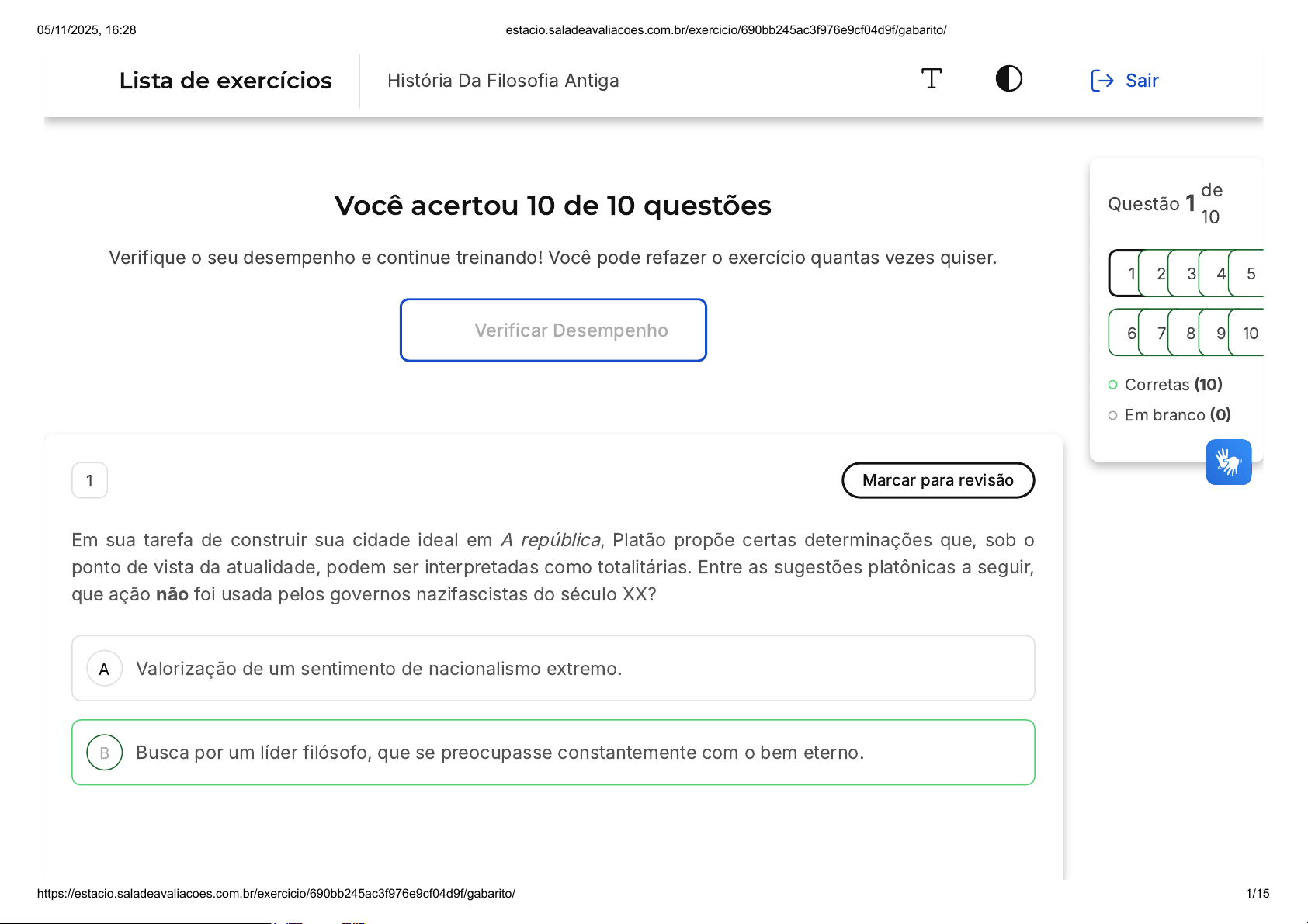 Você acertou 10 de 10 questões Verifique o seu desempenho e continue treinando! Você pode refazer o exercício quantas vezes quiser. Verificar Desempenho A B 1 Marcar para revisão Em sua tarefa de construir sua cidade ideal em A república, Platão propõe certas determinações que, sob o ponto de vista da atualidade, podem ser interpretadas como totalitárias. Entre as sugestões platônicas a seguir, que ação não foi usada pelos governos nazifascistas do século XX? Valorização de um sentimento de nacionalismo extremo. Busca por um líder filósofo, que se preocupasse constantemente com o bem eterno. Questão 1 de 10 Corretas (10) Em branco (0) 1 2 3 4 5 6 7 8 9 10 Lista de exercícios História Da Filosofia Antiga Sair 05/11/2025, 16:28 estacio.saladeavaliacoes.com.br/exercicio/690bb245ac3f976e9cf04d9f/gabarito/ https://estacio.saladeavaliacoes.com.br/exercicio/690bb245ac3f976e9cf04d9f/gabarito/ 1/15 C D E Eugenia, ou seja, controle da procriação para atingir uma raça ¿superior¿. Perseguição à liberdade artística, considerando certas artes como degeneradas. Propaganda política para lavagem cerebral dos cidadãos. Resposta correta Parabéns, você selecionou a alternativa correta. Confira o gabarito comentado! Gabarito Comentado A resposta correta é: Busca por um líder filósofo, que se preocupasse constantemente com o bem eterno. A resposta correta é B porque a busca por um líder filósofo não foi uma característica dos governos nazifascistas do século XX. Os governos nazifascistas eram caracterizados por um forte nacionalismo, uma perseguição à liberdade artística e uma propaganda política para lavagem cerebral dos cidadãos. 2 Marcar para revisão (FCC/2018) Adaptada Democracia é uma forma de governo que nasceu na Grécia antiga. Para os gregos, os interesses dos cidadãos e da cidade eram decididos em assembleia em praça pública. Os cidadãos eram 05/11/2025, 16:28 estacio.saladeavaliacoes.com.br/exercicio/690bb245ac3f976e9cf04d9f/gabarito/ https://estacio.saladeavaliacoes.com.br/exercicio/690bb245ac3f976e9cf04d9f/gabarito/ 2/15 A B C D E convocados para votar quando havia um assunto que fosse de interesse comum. Com isso, os gregos exerciam um tipo de democracia na qual todos os cidadãos votavam em um grupo seleto previamente indicado que dava a palavra final sobre temas específicos. o conjunto dos cidadãos convocados a votar variava conforme a gravidade do assunto e os interesses em disputa. os eleitores podiam recorrer da decisão quando era realizada a votação de um assunto de interesse comum. eram considerados cidadãos os homens adultos e livres da comunidade ateniense. todos os cidadãos, inclusive estrangeiros, tinham participação direta em todas as decisões que fossem de interesse comum. Resposta correta Parabéns, você selecionou a alternativa correta. Confira o gabarito comentado! Gabarito Comentado Por volta do século V a.C., ou talvez no século seguinte, aconteceu, na região do Peloponeso, provavelmente um fenômeno único na história: os habitantes de determinada cidade-Estado, chamada de Atenas, decidiram que a melhor maneira de se organizar como sociedade era distribuir os poderes de 05/11/2025, 16:28 estacio.saladeavaliacoes.com.br/exercicio/690bb245ac3f976e9cf04d9f/gabarito/ https://estacio.saladeavaliacoes.com.br/exercicio/690bb245ac3f976e9cf04d9f/gabarito/ 3/15 A B C decisão sobre as questões comunitárias por todos os homens adultos e livres da comunidade ateniense. Isso não incluía as mulheres, os estrangeiros e os escravos. Eles chamaram essa forma de governo de "democracia" (dêmos = povo + kratía = poder), e criaram mais uma palavra-conceito que influenciaria todo o mundo ao longo dos séculos e milênios. 3 Marcar para revisão Em sua obra Ética a Nicômaco, Aristóteles admitiu que o propósito da vida é ser feliz. Entretanto, ele afastou de si qualquer explicação mais rápida e vazia dessa felicidade, buscando uma resposta que seja bem mais estável e segura. Qual seria ela? Os prazeres momentâneos ou a mera satisfação de um desejo há muito esperado. A aquisição de um bem físico, que lhe daria um status de superioridade dentro da comunidade em que se vive. A descoberta das verdades eternas, que nos retiram do mundo das degradações morais para um estado de completa contemplação. 05/11/2025, 16:28 estacio.saladeavaliacoes.com.br/exercicio/690bb245ac3f976e9cf04d9f/gabarito/ https://estacio.saladeavaliacoes.com.br/exercicio/690bb245ac3f976e9cf04d9f/gabarito/ 4/15 D E A eleição para ser o governante de uma cidade-Estado, que daria a estabilidade necessária ao equilíbrio da vida. Algo que demonstrasse a excelência específica humana, sua virtude, seu bem viver ou seu viver bem. Resposta correta Parabéns, você selecionou a alternativa correta. Confira o gabarito comentado! Gabarito Comentado Aristóteles, em sua obra "Ética a Nicômaco", defende que a verdadeira felicidade não está em prazeres momentâneos, aquisição de bens físicos, descoberta de verdades eternas ou em posições de poder, mas sim na excelência específica humana, na virtude e no bem viver. Portanto, a alternativa correta é: "Algo que demonstrasse a excelência específica humana, sua virtude, seu bem viver ou seu viver bem". 4 Marcar para revisão A dialética socrática opera inicialmente através de um questionamento das crenças habituais de um interlocutor, interrogando-o, provocando-o a dar respostas e a explicitar o conteúdo e o sentido dessas crenças. Em seguida, frequentemente utilizando-se de ironia, problematiza essas crenças, fazendo com que o interlocutor caia em contradição, perceba a insuficiência delas, sinta-se perplexo e reconheça sua ignorância [...]. É este o sentido da célebre fórmula socrática "Só sei que nada sei", a ideia de que o reconhecimento da ignorância é o princípio da sabedoria. A partir daí, o indivíduo tem o caminho aberto para encontrar o verdadeiro conhecimen