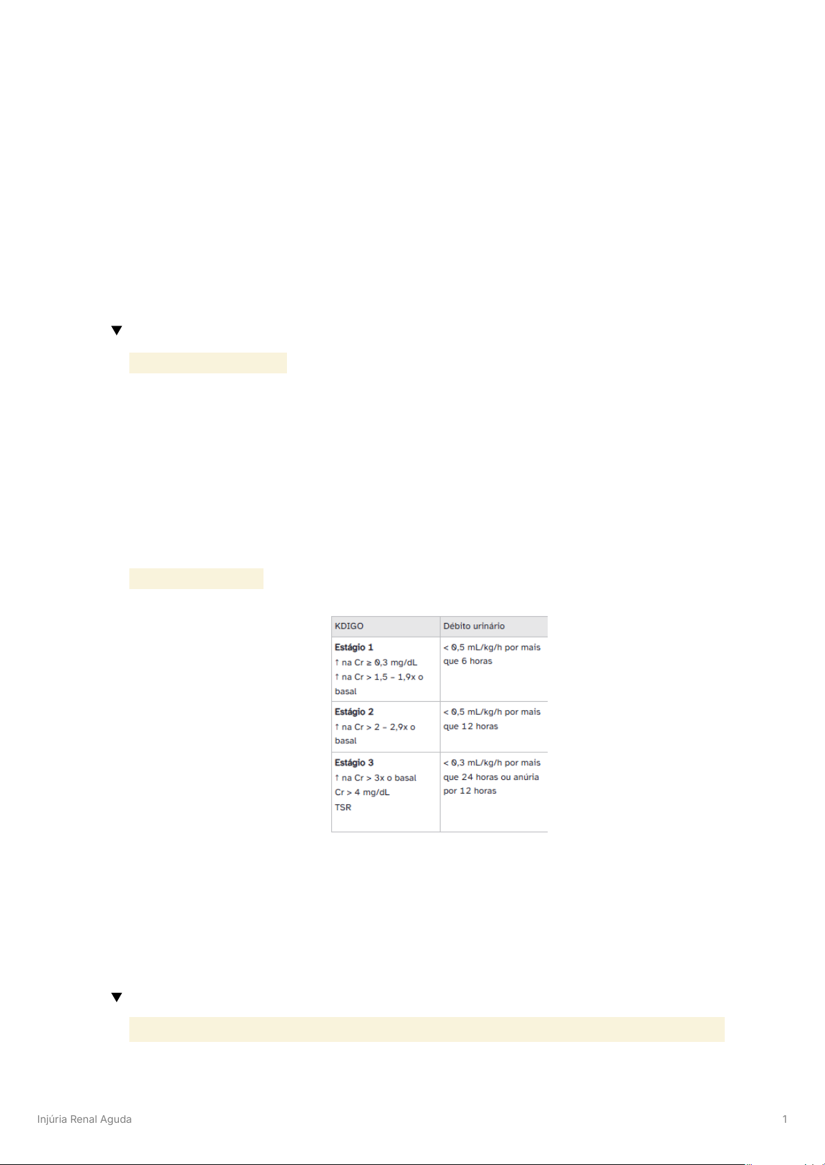 Injúria Renal Aguda medicina de emergência usp aula medcurso DEFINIÇÕES KDIGO CRITÉRIOS Elevação absoluta na creatinina 0,3 mg/dL dentro de 48 horas; ou Aumento relativo 1,5x a creatinina basal sabida ou presumidamente ocorrida na última semana; ou Redução no débito urinário 0,5 mL/kg/hora por um período maior que 6 horas. CLASSIFICAÇÃO *Existem novos biomarcadores que podem se alterar antes da Cr e do débito urinário; ainda são necessários estudos ETIOLOGIAS E FISIOPATOLOGIA PRÉ RENAL 55% Injúria Renal Aguda 1 Fisiopatologia: Função tubular preservada - aumenta reabsorção de água e sódio para restaurar a volemia Urina com baixo conteúdo de sódio e água FENa reduzida Aumento de osmolaridade e densidade urinária Aumento de reasborção passiva de ureia (junto com Na no túbulo proximal) FEUr reduzida Aumento desproporcional da ureia em relação à creatinina (ur/cr 40 Imagem Hipoperfusão renal ou LRA pré-renal principal causa Injúria Renal Aguda 2 causas: hipovolemia, vasodilatação sistêmica, aumento de resistência vascular mecanismo: ativação de SRAA se persistente, pode causar necrose tubular aguda Sepse mecanismo: vasodilatação → ativação de SRAA e vasoconstrição renal também há mecanismo de inflamação que gera dano tubular Síndrome cardiorrenal #Síndrome Cardiorrenal Síndrome hepatorrenal IRA em hepatopatas Cirurgia de grande porte por perda sanguínea, para 3º espaço efeito de anestésicos Cirurgia cardíaca Hipertensão intra-abdominal diminuição de perfusão renal INTRÍNSECA 40% VASOS GRANDES VASOS estenose de a. renal e trombose de veia renal MICROVASCULARES microangiopatias trombóticas MAT síndrome hemolítico-urêmica SHU típica faz parte do grupo das microangiopatias trombóticas MAT mais frequente em crianças 5 anos Injúria Renal Aguda 3 https://www.notion.so/S-ndrome-Cardiorrenal-46abcafb03144a5d92b2a0b34f202a5f?pvs=21 https://www.notion.so/IRA-em-hepatopatas-297baae64d2a41688a3fe6141b9b7985?pvs=21 a lesão endotelial de vasos de pequeno calibre através da oclusão total ou parcial do lúmen do vaso por agregados de plaquetas Etiologia: Escherichia coli, produtora de toxina Shiga (sorotipo O 157H7 Clínica: plaquetopenia + anemia normocítica com provas de hemólise positivas (aumento de DHL, aumento de bilirrubina indireta, aumento de reticulócitos, consumo de haptoglobina e presença de esquizócitos em sangue periférico) + lesão renal aguda ocorrem após quadro de diarreia sanguinolenta tratamento de suporte embolia por colesterol. por ruptura de placa a aterosclerótica de colesterol em geral após CATE ou cirurgia vascular ou após início de anticoagulação clínica disfunção renal progressiva sintomas sistêmicos embólicos, aumento de provas inflamatórias consumo de complemento e eosinofilia tríade clássica: livedo reticular, eosinofilia e lesão renal aguda tratamento de suporte. GLOMÉRULO Patognomônicos de lesão glomerular Hematúria de origem glomerular: caracterizada pela presença de dismorfismo eritrocitário, cilindros hemáticos ou acantócitos no exame de urina Proteinúria em níveis nefróticos: 3,5g/dia em adultos ou 50mg/kg/dia em crianças Injúria Renal Aguda 4 Glomerulonefrite rapidamente progressiva resposta autoimune pode ser primária ou secundária usualmente associada a glomerulonefrites crescênticas - profileração extracapilar em 70% dos glomérulos Causas pauci-imunes - por vasculite de pequenos vasos 5080% 6º década de vida pode ser limitada ao rim GNRP idiopática) ou associada a doença sistêmica (granulomatose com poliangeíte, doença de Churg-Strauss ou poliangeite microscópica) 90% possui ANCA positivo tratamento com pulsoterapia com metilprednisolona 0,5 a 1,0 g/dia por 3 dias e depois prednisona 60 a 80 mg/dia e ciclofosfamida 2 mg/kg de peso via oral ou em pulsos mensais de 0,5 a 1,0 g. Síndrome nefrótica Sindrome nefrítica TÚBULOINTERSTICIAL Necrose tubular aguda NTA causada por uma lesão prolongada das células tubulares, que leva à necrose dessas células túbulos renais sem capacidade reabsortiva - excreções de solutos elevadas e urina diluída FORMA NÃO OLIGÚRICA imagem - fisiopatologia Injúria Renal Aguda 5 ETIOLOGIA isquemia renal: hipoperfusão prolongada (como sepse, choque e desidratação), anemia severa, hipotensão prolongada, estresse cirúrgico com uso de CEC ou clampeamento de vasos pode ter 2 formas: necrose cortical e necrose de papilar renal Necrose cortical: forma grave de lesão isquêmica microvascular (destruição parcial ou total do córtex renal) anúria, hematúria, dor lombar e hipotensão imagem com hipocaptação de contraste na camada cortical etiologia: choque séptico, síndrome hemolítico- urêmica, complicações obstétricas, coagulação intravascular disseminada, picadas de animais peçonhentos, rejeição de enxerto renal, pancreatite, poliarterite nodosa e dissecção da aorta. Necrose de papila renal Injúria Renal Aguda 6 injúrias isquêmicas ao tecido renal na região da medula renal hematúria macroscópica indolor, porém pode estar associada à ocorrência de dor lombar em cólica, hematúria microscópica, sintomas de infecção urinária e lesão renal aguda imagem pielografia excretora =padrão ouro; falta de enchimento das pirâmides renais garra de lagosta calcificação da região medular hidronefrose sem fator obstrutivo Etiologias: anemia falciforme, nefropatia por analgésicos, uso de anti-inflamatórios, vasculites, diabetes mellitus, amiloidose, pielonefrite aguda, pós-transplante renal, tuberculose renal, uso de álcool e doença hepática crônica nefrotoxicidade: agentes exógenos (medicamentos e uso de contrastes) ou endógenos (como a mioglobina na rabdomiólise) Medicamentos Rabdomiólise após trauma, overdose de narcóticos, embolia arterial ou uso de medicamentos que podem induzir grande lesão muscular obstrução tubular por cilindros de mioglobina Síndrome de Lise Tumo
