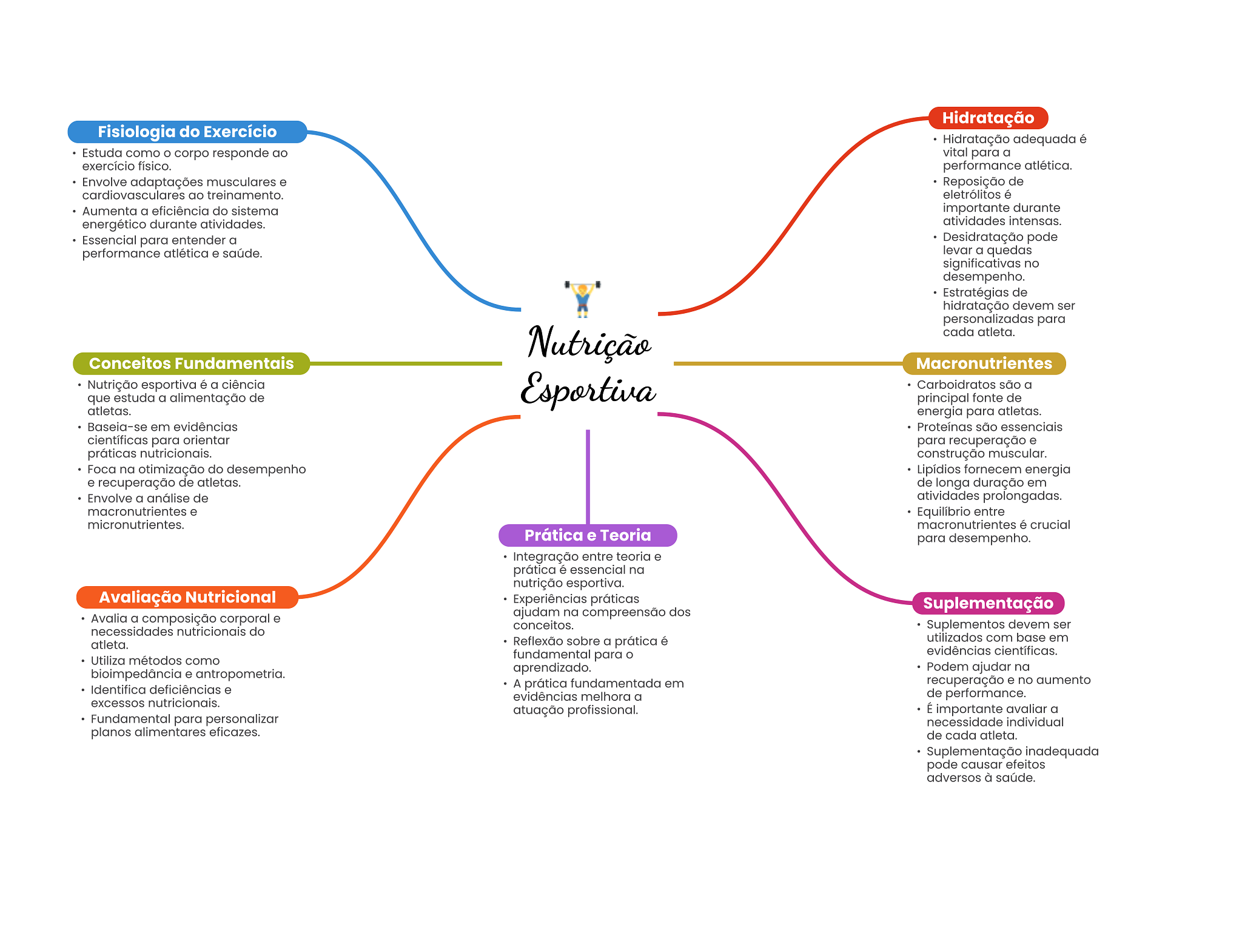 Hidratação Fisiologia do Exercício Hidratação adequada é Estuda como corpo responde vital para a exercício físico. performance atlética. Envolve adaptações musculares e Reposição de cardiovasculares ao treinamento. eletrólitos é Aumenta a eficiência do sistema importante durante energético durante atividades. atividades intensas. Essencial para entender a Desidratação pode performance atlética e saúde. levar a quedas significativas no desempenho. Estratégias de hidratação devem ser personalizadas para Nutrição cada atleta. Conceitos Fundamentais Macronutrientes Nutrição esportiva é a ciência que estuda a alimentação de Esportiva Carboidratos são a principal fonte de atletas. energia para atletas. Baseia-se em evidências Proteínas são essenciais científicas para orientar para recuperação e práticas nutricionais. construção muscular. Foca na otimização do desempenho Lipídios fornecem energia e recuperação de atletas. de longa duração em Envolve a análise de atividades prolongadas. macronutrientes e Equilíbrio entre micronutrientes. macronutrientes é crucial Prática e Teoria para desempenho. Integração entre teoria e prática é essencial na nutrição esportiva. Avaliação Nutricional Experiências práticas Suplementação Avalia a composição corporal e ajudam na compreensão dos necessidades nutricionais do conceitos. Suplementos devem ser atleta. Reflexão sobre a prática é utilizados com base em fundamental para O evidências científicas. Utiliza métodos como bioimpedância e antropometria. aprendizado. Podem ajudar na Identifica deficiências e A prática fundamentada em recuperação e no aumento evidências melhora a de performance. excessos nutricionais. atuação profissional. É importante avaliar a Fundamental para personalizar necessidade individual planos alimentares eficazes. de cada atleta. Suplementação inadequada pode causar efeitos adversos à saúde.