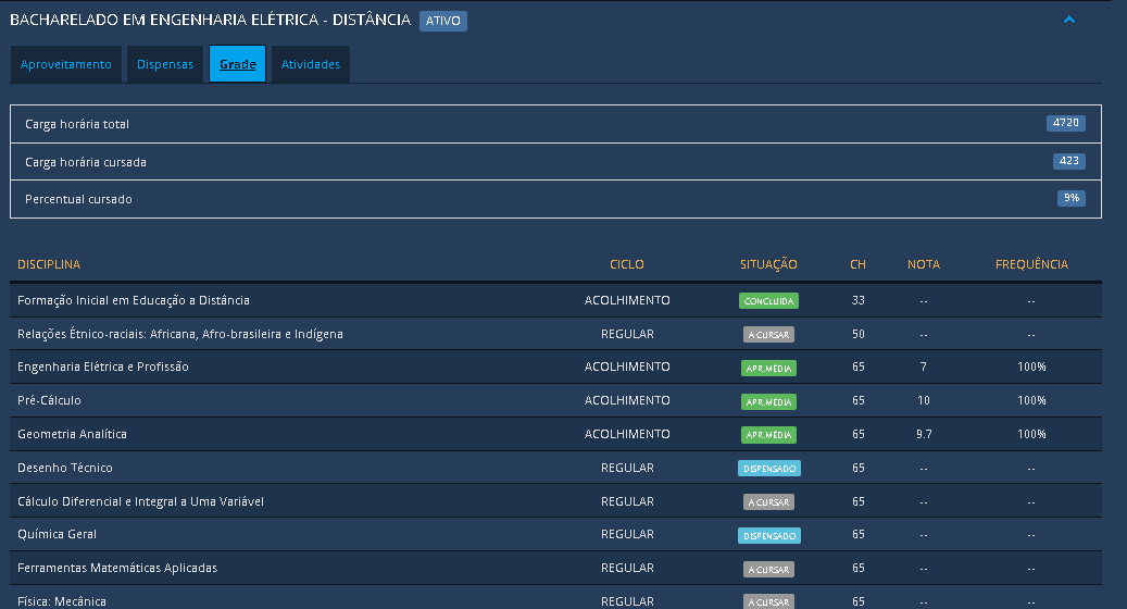 BACHARELADO EM ENGENHARIA ELÉTRICA - DISTÂNCIA ATIVO Aproveitamento Dispensas Grade Atividades Carga horária total 4720 Carga horária cursada 423 Percentual cursado 9% DISCIPLINA CICLO SITUAÇÃO CH NOTA FREQUÊNCIA Formação Inicial em Educação a Distância ACOLHIMENTO CONCLUIDA 33 Relações Étnico-raciais: Africana, Afro-brasileira e REGULAR 50 Engenharia Elétrica e Profissão ACOLHIMENTO 65 7 100% Pré-Cálculo ACOLHIMENTO 65 10 100% Geometria Analítica ACOLHIMENTO APR.MEDIA 65 9.7 100% Desenho Técnico REGULAR DISPENSADO 65 Cálculo Diferencial e Integral a Uma REGULAR 65 Química Geral REGULAR DISPENSADO 65 Ferramentas Matemáticas Aplicadas REGULAR 65 Fisica: Mecânica REGULAR ACURSAR 65