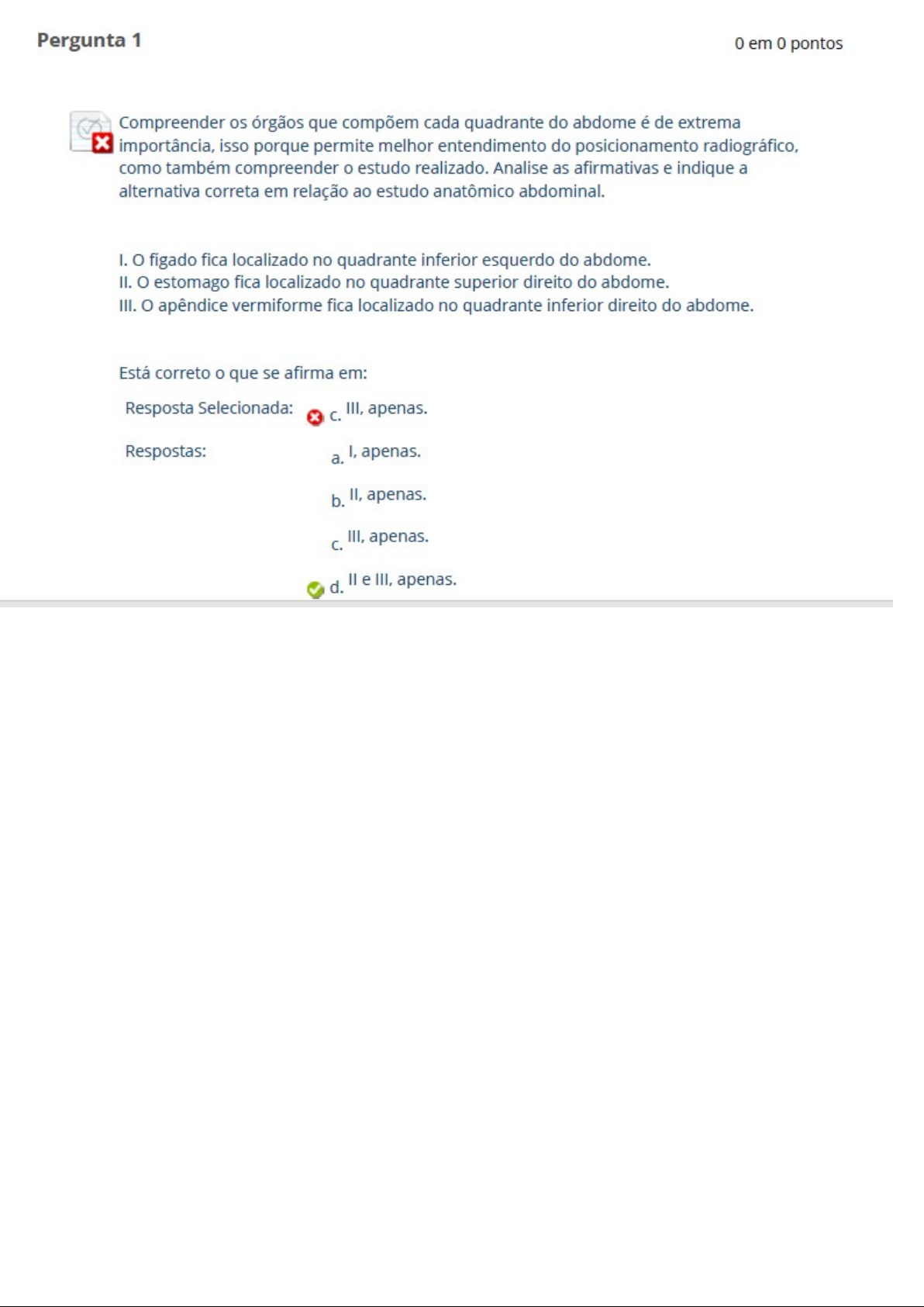 Pergunta 1 0 em 0 pontos Compreender os órgãos que compõem cada quadrante do abdome é de extrema importância, isso porque permite melhor entendimento do posicionamento radiográfico, como também compreender 0 estudo realizado. Analise as afirmativas e indique a alternativa correta em relação ao estudo anatômico abdominal. I. figado fica localizado no quadrante inferior esquerdo do abdome. II. estomago fica localizado no quadrante superior direito do abdome. III. apêndice vermiforme fica localizado no quadrante inferior direito do abdome. Está correto o que se afirma em: Resposta Selecionada: C. III, apenas. Respostas: a. I, apenas. b. II, apenas. C. III, apenas. d. e III, apenas.