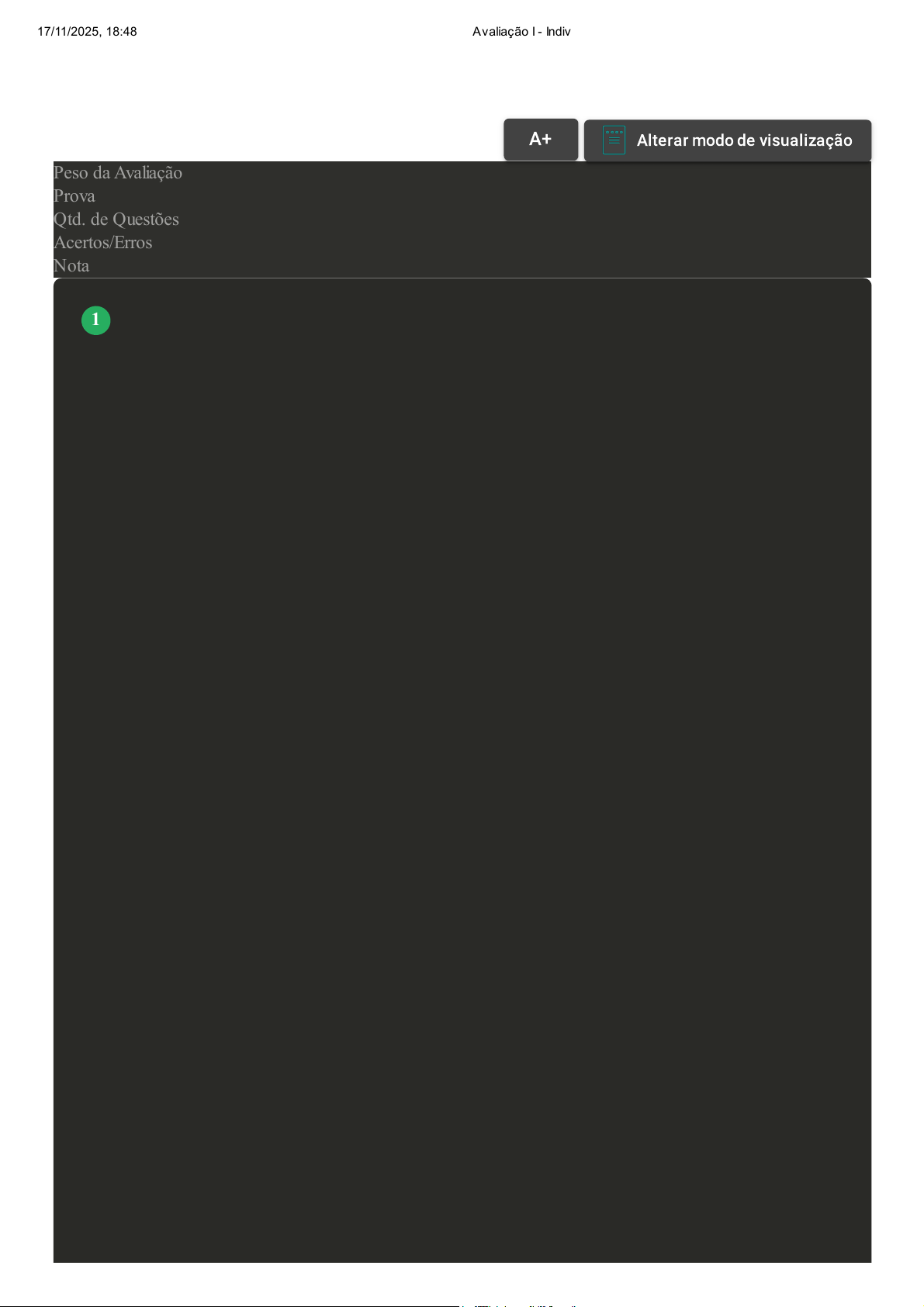 Prova Impressa GABARITO | Avaliação I - Individual (Cod.:1522661) Peso da Avaliação 2,00 Prova 110074321 Qtd. de Questões 10 Acertos/Erros 10/0 Nota 10,00 Considere o caso hipotético a seguir: O estudo investigou os efeitos da cafeína sobre o desempenho cognitivo, com foco específico na atenção e no tempo de resposta. A pesquisa foi conduzida com 50 voluntários saudáveis, divididos aleatoriamente em dois grupos: um recebeu uma dose de 200 mg de cafeína, e o outro, um placebo. Após um período de 30 minutos, todos os participantes foram submetidos a testes em computador que avaliavam a atenção e a rapidez de resposta. Os resultados indicaram que os indivíduos que consumiram cafeína apresentaram desempenho superior, com respostas mais rápidas e maior precisão nas tarefas propostas. Com base nesses dados, concluiu-se que a cafeína, em doses moderadas, pode favorecer a cognição, especialmente em situações que exigem maior concentração. Este achado reforça o entendimento sobre os efeitos estimulantes da cafeína e seu possível uso como recurso para a melhora do desempenho mental em curto prazo. Com base no texto e nas características do conhecimento científico, analise as afirmativas a seguir: I. É subjetivo, mas pode ser comprovado por diferentes pessoas. II. É resultado de fatos que se julgam e da percepção individual, sendo, portanto, uma questão de interpretação e ponto de vista. III. É quantitativo, pois envolve medidas, padrões e critérios de comparação e avaliação, mesmo para elementos que aparentam ser diferentes. IV. É resultado de experimentos que não podem ser generalizados, pois o conhecimento científico rejeita a replicação dos estudos em contextos semelhantes. É correto o que se afirma em: A III e IV, apenas. B I, II, III e IV. VOLTAR A+ Alterar modo de visualização 1 17/11/2025, 18:48 Avaliação I - Individual about:blank 1/8 C II e IV, apenas. D I, II e III, apenas. E III, apenas. “[...] afirmar que construir uma psicanálise científica foi um projeto explícito de Freud é como chover no molhado: importa delinear, a partir de uma diversidade de ângulos possíveis, como se deu seu percurso para a concretização desse ideal de cientificidade, sem deixar de lado o modo nada modesto com que Freud situa sua contribuição na "História da Humanidade", ao lado de Copérnico e Darwin. Como se sabe, das três feridas sofridas pela humanidade, com os golpes cosmológico, biológico e psicológico, Freud considerava que a última, provocada pela psicanálise, talvez tenha sido a mais dolorosa” (Loffredo, 2006). Fonte: LOFFREDO, A. M. Parábolas freudianas: as narcísicas feridas e o arqueólogo. Jornal de Psicanálise, v. 39, n. 70, p. 289–308, 2006. Disponível em: https://pepsic.bvsalud.org/scielo.php? pid=S0103-58352006000100019&script=sci_arttext. Acesso em: 7 set. 2025. Com base no texto apresentado e a respeito das contribuições da filosofia e das "feridas narcísicas" para o desenvolvimento da Psicologia como ciência, assinale a alternativa correta: A A ferida provocada por Freud considerava que sua contribuição para a Psicologia era modesta, dado que apenas reforçava concepções já amplamente aceitas sobre o funcionamento da mente consciente. B O golpe cosmológico proposto por Copérnico confirmou o modelo geocêntrico e fortaleceu a aliança entre ciência e dogmas religiosos. C A teoria freudiana representou a terceira ferida narcísica, ao propor que o ser humano não é senhor de sua própria razão, uma vez que parte de seus desejos e comportamentos é regida por conteúdos inconscientes. D A ferida provocada por Freud refere-se à descoberta de que o comportamento humano pode ser inteiramente compreendido por meio da lógica racional e da consciência plena, dispensando a noção de inconsciente. E As feridas narcísicas, segundo Freud, reafirmam a centralidade do homem no universo ao desconsiderar os impactos das descobertas científicas na constituição do sujeito moderno. 2 17/11/2025, 18:48 Avaliação I - Individual about:blank 2/8 No dia a dia, é comum ouvirmos conselhos transmitidos de geração em geração. Entre eles, destaca-se a crença de que "tomar chá de camomila cura qualquer tipo de nervosismo". Essa afirmação faz parte do senso comum, pois reflete uma sabedoria popular construída a partir de experiências vividas e compartilhadas, mas que nem sempre encontra respaldo científico. Com base no texto e nas características do senso comum, assinale a alternativa correta: A O senso comum é baseado em estudos experimentais rigorosos e revisões sistemáticas. B O senso comum depende de interpretações subjetivas e experiências individuais, nem sempre comprovadas cientificamente. C O senso comum rejeita interpretações qualitativas e busca dados numéricos para validação. D O senso comum é homogêneo, buscando leis gerais para todos os fenômenos observados. E A construção do conhecimento no senso comum exige comprovação empírica por meio de ensaios controlados. Wundt, considerado o fundador da psicologia moderna, utilizava a introspecção como método de estudo da experiência consciente. No entanto, ele implementou um rigoroso controle experimental sobre as condições de execução da introspecção, diferenciando-se dos métodos utilizados na filosofia. Wundt treinava seus observadores para realizarem até 10 mil observações introspectivas individuais antes de considerá-los preparados para fornecer dados significativos à pesquisa. Esse treinamento repetitivo tinha como objetivo capacitá-los a realizar as observações de forma rápida e automática, minimizando a interferência de pensamentos ou reflexões pessoais no processo. Com base nas informações apresentadas, avalie as asserções a seguir e a relação proposta entre elas: I. Wundt utilizava a introspecção como método para acessar os conteúdos inconscientes dos indivíduos, buscando compreender as m