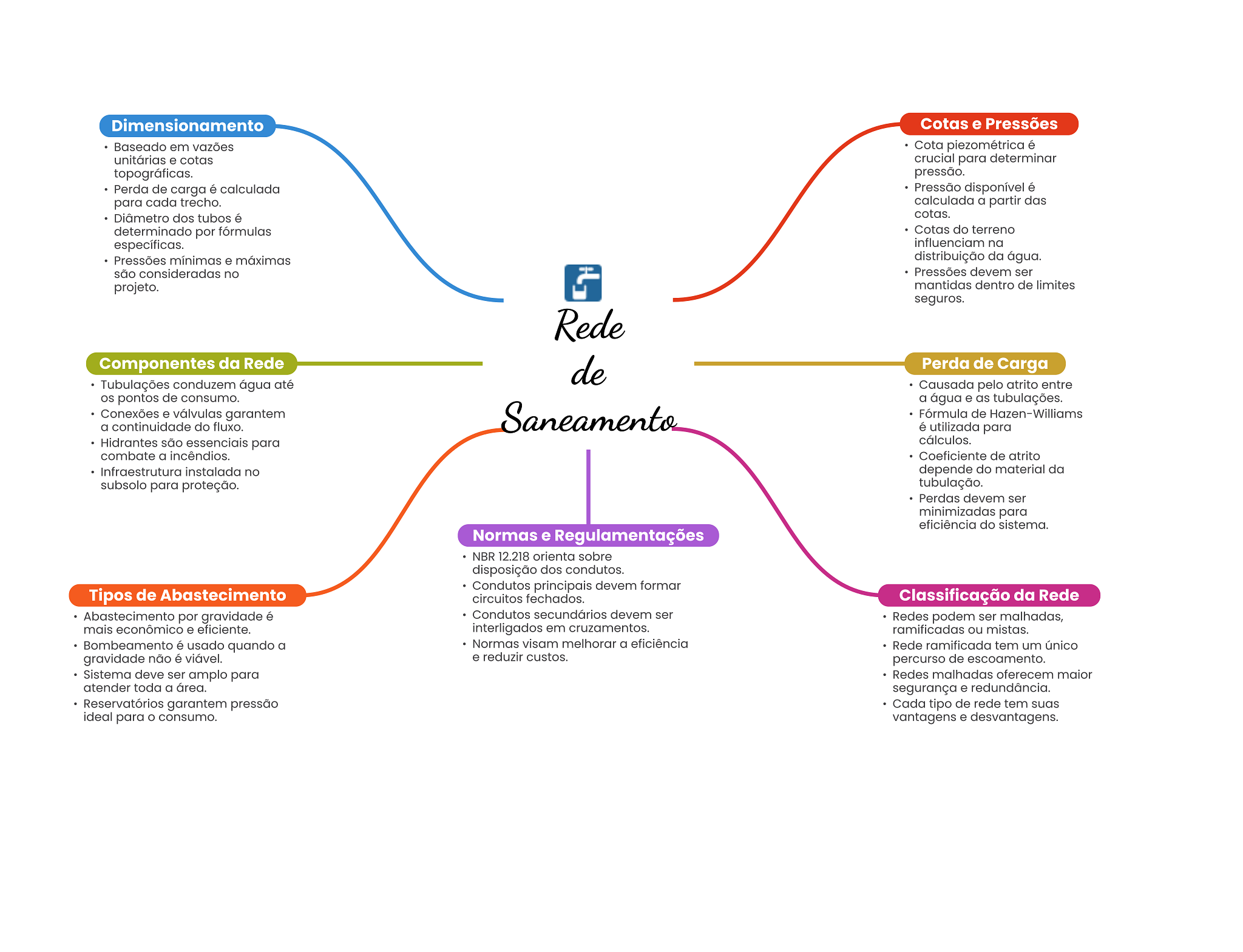 Cotas e Pressões Baseado em vazões Cota piezométrica é unitárias e cotas crucial para determinar topográficas. pressão. Perda de carga é calculada Pressão disponível é para cada trecho. calculada a partir das Diâmetro dos tubos é cotas. determinado por fórmulas Cotas do terreno específicas. influenciam na Pressões mínimas e máximas distribuição da água. são consideradas no Pressões devem ser projeto. mantidas dentro de limites seguros. Rede Componentes da Rede de Perda de Carga Tubulações conduzem água até Causada pelo atrito entre pontos de consumo. a água e as tubulações. Conexões e válvulas garantem a continuidade do fluxo. Saneamento Fórmula de Hazen-Williams é utilizada para Hidrantes são essenciais para cálculos. combate a incêndios. Coeficiente de atrito Infraestrutura instalada no depende do material da subsolo para proteção. tubulação. Perdas devem ser minimizadas para eficiência do sistema. Normas e Regulamentações NBR 12.218 orienta sobre disposição dos condutos. Condutos principais devem formar Tipos de Abastecimento circuitos fechados. Classificação da Rede Abastecimento por gravidade é Condutos secundários devem ser Redes podem ser malhadas, mais econômico e eficiente. interligados em cruzamentos. ramificadas ou mistas. Bombeamento é usado quando a Normas visam melhorar a eficiência Rede ramificada tem um único gravidade não é viável. e reduzir custos. percurso de escoamento. Sistema deve ser amplo para Redes malhadas oferecem maior atender toda a área. segurança e redundância. Reservatórios garantem pressão Cada tipo de rede tem suas ideal para consumo. vantagens e desvantagens.