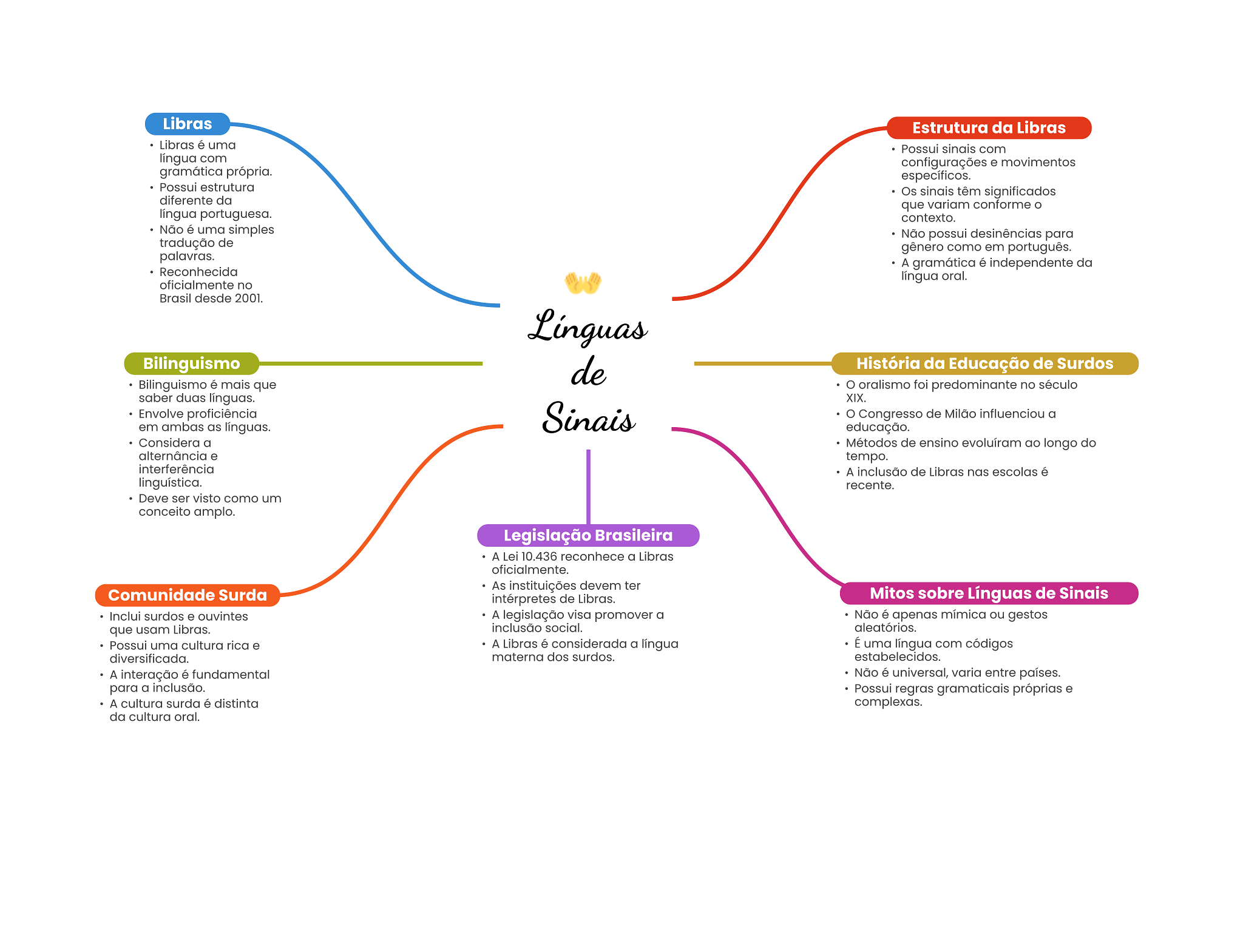 Libras Estrutura da Libras Libras é uma Possui sinais com língua com configurações e movimentos gramática própria. específicos. Possui estrutura Os sinais têm significados diferente da que variam conforme língua portuguesa. contexto. Não é uma simples Não possui desinências para tradução de gênero como em português. palavras. A gramática é independente da Reconhecida língua oral. oficialmente no Brasil desde 2001. Bilinguismo de História da Educação de Surdos Bilinguismo é mais que oralismo foi predominante no século saber duas línguas. XIX. Envolve proficiência em ambas as línguas. Sinais O Congresso de Milão influenciou a educação. Considera a Métodos de ensino evoluíram ao longo do alternância e tempo. interferência A inclusão de Libras nas escolas é linguística. recente. Deve ser visto como um conceito amplo. Legislação Brasileira A Lei 10.436 reconhece a Libras oficialmente. As instituições devem ter Comunidade Surda intérpretes de Libras. Mitos sobre Línguas de Sinais Inclui surdos e ouvintes A legislação visa promover a Não é apenas mímica ou gestos que usam Libras. inclusão social. aleatórios. Possui uma cultura rica e A Libras é considerada a língua É uma língua com códigos diversificada. materna dos surdos. estabelecidos. A interação é fundamental Não é universal, varia entre países. para a inclusão. Possui regras gramaticais próprias e A cultura surda é distinta complexas. da cultura oral.