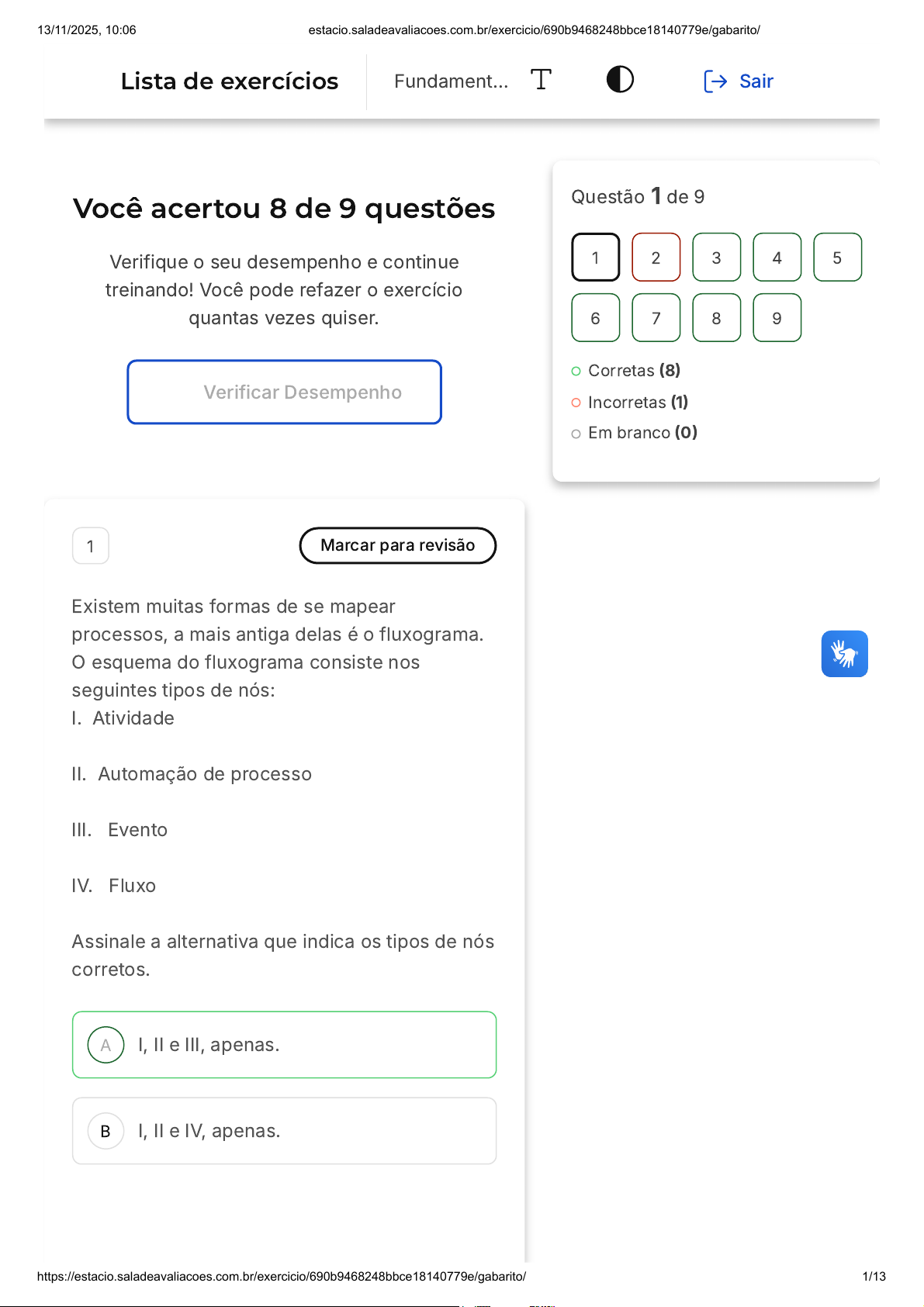 Você acertou 8 de 9 questões Verifique o seu desempenho e continue treinando! Você pode refazer o exercício quantas vezes quiser. Verificar Desempenho A B 1 Marcar para revisão Existem muitas formas de se mapear processos, a mais antiga delas é o fluxograma. O esquema do fluxograma consiste nos seguintes tipos de nós: I. Atividade II. Automação de processo III. Evento IV. Fluxo Assinale a alternativa que indica os tipos de nós corretos. I, II e III, apenas. I, II e IV, apenas. Questão 1 de 9 Corretas (8) Incorretas (1) Em branco (0) 1 2 3 4 5 6 7 8 9 Lista de exercícios Fundament… Sair 13/11/2025, 10:06 estacio.saladeavaliacoes.com.br/exercicio/690b9468248bbce18140779e/gabarito/ https://estacio.saladeavaliacoes.com.br/exercicio/690b9468248bbce18140779e/gabarito/ 1/13 C D E I, III e IV, apenas. II, III e IV, apenas. I, II, III e IV. Resposta correta Parabéns, você selecionou a alternativa correta. Confira o gabarito comentado! Gabarito Comentado Existem muitas técnicas para modelar processos de negócios em diagramas. A mais antiga e conhecida é o fluxograma. Na sua forma básica, os fluxogramas consistem em retângulos, que representam atividades, e losangos, que representam pontos no processo em que uma decisão é tomada. O modelo de processo esquemático geralmente consiste nos seguintes tipos de nó: Atividade: Descrevem unidades de trabalho que podem ser realizadas por indivíduos, aplicativos de computador, ou uma combinação dos dois. Automação de processos: Capturam o fluxo de execução entre atividades. Eventos: Um nó de evento identifica algo que pode acontecer no processo, requerendo uma reação, como a chegada de uma mensagem de um cliente pedindo 13/11/2025, 10:06 estacio.saladeavaliacoes.com.br/exercicio/690b9468248bbce18140779e/gabarito/ https://estacio.saladeavaliacoes.com.br/exercicio/690b9468248bbce18140779e/gabarito/ 2/13 A B C para aumentar ou cancelar seu pedido de compra. 2 Marcar para revisão Em relação ao BPM, é correto afirmar: Nem todas as técnicas de fluxogramas atendem aos requisitos da análise de processo e, nesse aspecto, as únicas técnicas aplicáveis são as do fluxograma de blocos e do fluxograma de procedimento. Excetuando-se os processos primários, que não exigem a modelagem, os processos de suporte e de gestão devem ser cobertos e contemplados com a modelagem completa (ponta a ponta). Na fase de análise de negócio, a modelagem TO BE permite obter entendimento suficiente pelos membros da equipe de projeto e de negócios sobre os processos de negócio atuais e habilitar o início da fase de transformação de processo. 13/11/2025, 10:06 estacio.saladeavaliacoes.com.br/exercicio/690b9468248bbce18140779e/gabarito/ https://estacio.saladeavaliacoes.com.br/exercicio/690b9468248bbce18140779e/gabarito/ 3/13 D E Na fase de análise de negócio, a modelagem AS IS permite obter entendimento suficiente pelos membros da equipe de projeto e de negócios sobre os processos de negócio atuais e habilitar o início da fase de transformação de processo. A simulação é uma etapa importante da automação, pois é nela que os processos são descobertos e desenhados. Resposta incorreta Opa! A alternativa correta é a letra D. Confira o gabarito comentado! Gabarito Comentado A alternativa correta é a D. A modelagem AS IS, na fase de análise de negócio, é uma ferramenta crucial para entender os processos de negócio atuais. Essa compreensão é fundamental para a equipe de projeto e de negócios, pois permite que eles iniciem a fase de transformação de processo com uma base sólida de conhecimento. Essa modelagem fornece uma visão clara do estado atual dos processos, o que é essencial para identificar áreas de melhoria e planejar mudanças efetivas. 3 Marcar para revisão O modelo BPMN é amplamente utilizado para mapear processo organizacionais. Esse modelo 13/11/2025, 10:06 estacio.saladeavaliacoes.com.br/exercicio/690b9468248bbce18140779e/gabarito/ https://estacio.saladeavaliacoes.com.br/exercicio/690b9468248bbce18140779e/gabarito/ 4/13 A B C D E consistem em etapas, são elas: I. Captura de alto nível de abstração II. Identificação e análise de problemas III. Ajustes IV. Degradação do processo Assinale a alternativa que indica as etapas corretas. I, II e III, apenas. I, II e IV, apenas. I, III e IV, apenas. II, III e IV, apenas. I, II, III e IV. Resposta correta Parabéns, você selecionou a alternativa correta. Confira o gabarito comentado! Gabarito Comentado As três etapas do modelo BPMN são: captura de alto nível de abstração, identificação e análise de problema e ajuste. 13/11/2025, 10:06 estacio.saladeavaliacoes.com.br/exercicio/690b9468248bbce18140779e/gabarito/ https://estacio.saladeavaliacoes.com.br/exercicio/690b9468248bbce18140779e/gabarito/ 5/13 A B C D E 4 Marcar para revisão O ciclo de vida do BPM (Business Process Management) deve ser entendido como circular, um ciclo contínuo. Ou seja, o fim da fase de monitoração é o início das fases de implementação e refinamento do processo, por exemplo. Assinale a alternativa que indica corretamente uma atividade vinculada à fase da implementação do processo. Os processos relevantes para a empresa são identificados, delimitados e inter-relacionados. Dados relevantes são coletados e medidas de desempenho são analisadas para determinar o desempenho do processo implementado. As mudanças necessárias para passar da situação atual do processo (AS IS) para o processo redesenhado (TO BE) são implementadas. Os processos relevantes para a empresa são desenhados. Os problemas associados ao processo são identificados, documentados e, sempre que possível, quantificados usando medidas de desempenho. Resposta correta 13/11/2025, 10:06 estacio.saladeavaliacoes.com.br/exercicio/690b9468248bbce18140779e/gabarito/ https://estacio.saladeavaliacoes.com.br/exercicio/690b9468248bbce18140779e/gabarito/ 6/13 A B C D E Parabéns, você selecionou a alternativ