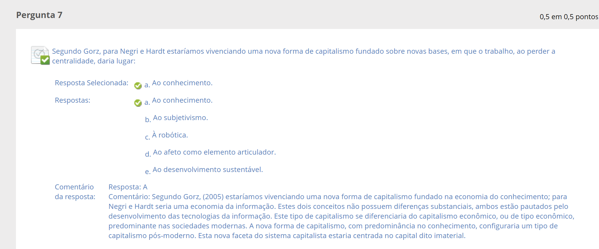Pergunta 7 0,5 em 0,5 pontos Segundo Gorz, para Negri e Hardt estaríamos vivenciando uma nova forma de capitalismo fundado sobre novas bases, em que trabalho, ao perder a centralidade, daria lugar: Resposta Selecionada: a. Ao conhecimento. Respostas: a. Ao conhecimento. b. Ao subjetivismo. C. À robótica. d. Ao afeto como elemento articulador. e. Ao desenvolvimento sustentável. Comentário Resposta: A da resposta: Comentário: Segundo Gorz, (2005) estaríamos vivenciando uma nova forma de capitalismo fundado na economia do conhecimento; para Negri e Hardt seria uma economia da informação. Estes dois conceitos não possuem diferenças substanciais, ambos estão pautados pelo desenvolvimento das tecnologias da informação. Este tipo de capitalismo se diferenciaria do capitalismo econômico, ou de tipo econômico, predominante nas sociedades modernas. A nova forma de capitalismo, com predominância no conhecimento, configuraria um tipo de capitalismo pós-moderno. Esta nova faceta do sistema capitalista estaria centrada no capital dito imaterial.