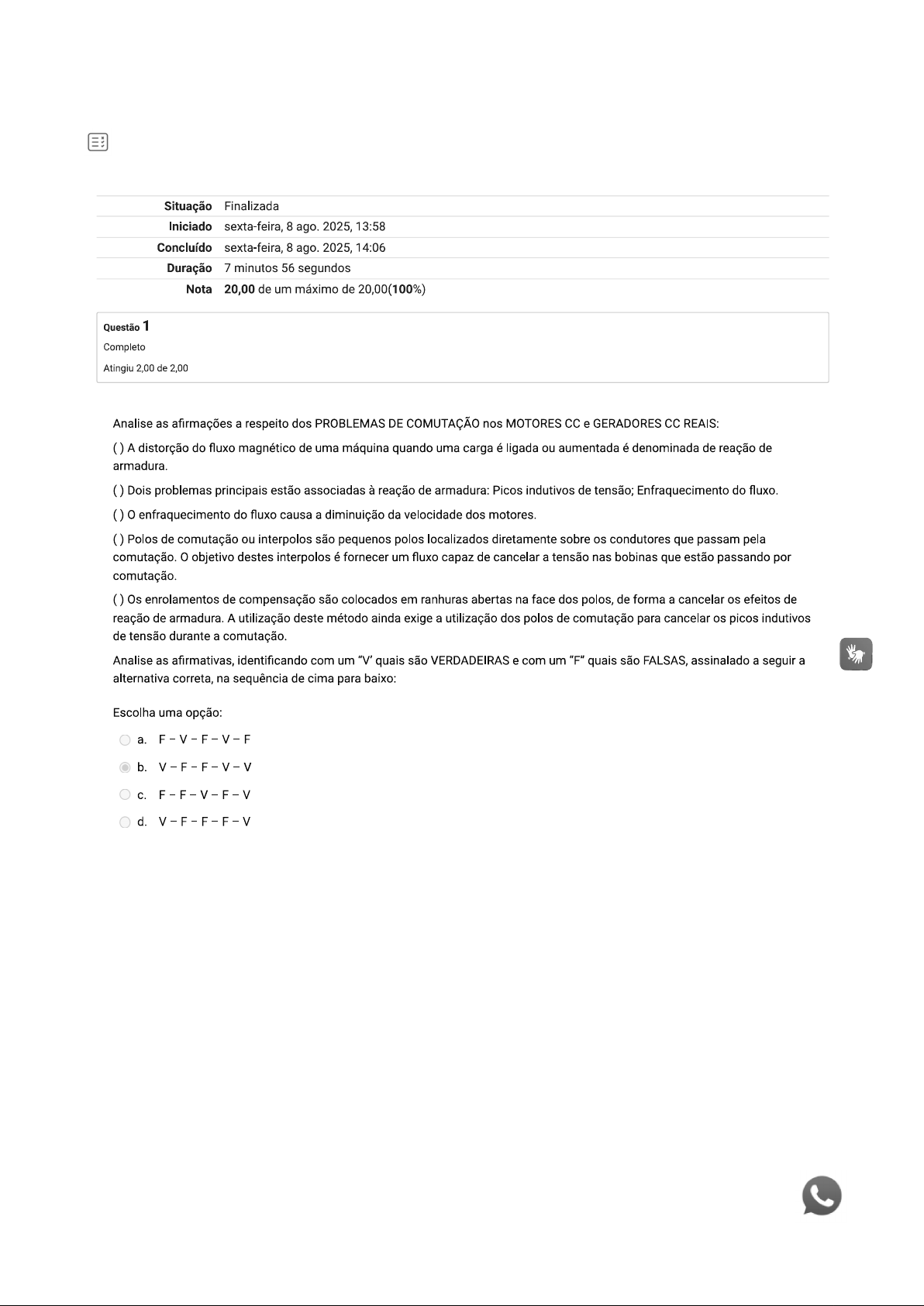 Situação Finalizada Iniciado sexta-feira, 8 ago. 2025, 13:58 Concluído sexta-feira, 8 ago. 2025, 14:06 Duração 7 minutos 56 segundos Nota 20,00 de um máximo de 20,00(100%) Questão 1 Completo Atingiu 2,00 de 2,00 Analise as afirmações a respeito dos PROBLEMAS DE COMUTAÇÃO nos MOTORES CC e GERADORES CC REAIS: () A distorção do fluxo magnético de uma máquina quando uma carga é ligada ou aumentada é denominada de reação de armadura. () Dois problemas principais estão associadas à reação de armadura: Picos indutivos de tensão; Enfraquecimento do fluxo. () enfraquecimento do fluxo causa a diminuição da velocidade dos motores. () Polos de comutação ou interpolos são pequenos polos localizados diretamente sobre os condutores que passam pela comutação. objetivo destes interpolos é fornecer um fluxo capaz de cancelar a tensão nas bobinas que estão passando por comutação. () Os enrolamentos de compensação são colocados em ranhuras abertas na face dos polos, de forma a cancelar os efeitos de reação de armadura. A utilização deste método ainda exige a utilização dos polos de comutação para cancelar os picos indutivos de tensão durante a comutação. Analise as afirmativas, identificando com um "V' quais são VERDADEIRAS e com um "F" quais são FALSAS, assinalado a seguir a alternativa correta, na sequência de cima para baixo: Escolha uma opção: a. F-V-F-V-F F-F-V-F-VQuestão 2 Completo Atingiu 2,00 de 2,00 Considere as afirmativas a seguir sobre as máquinas de indução: I. Em funcionamento normal, os campos magnéticos do rotor e do estator giram juntos na velocidade síncrona, porém rotor gira em uma velocidade menor. II. Durante a partida, um motor de indução opera com velocidade menor do que a velocidade síncrona. Gradativamente, o motor vai aumentando a velocidade até alcançar a velocidade síncrona, sem escorregamento, onde opera com o conjugado máximo. III. Em um motor de indução de rotor bobinado, ao aumentar a resistência elétrica do rotor, o conjugado máximo é atingido em uma velocidade de rotação menor, porém o valor do conjugado máximo não se altera. IV. Um gerador de indução operando em paralelo com um sistema de potência não necessita ser acionado continuamente com velocidade fixa. Enquanto a rotação da máquina for superior à velocidade síncrona do sistema ao qual está ligado, este dispositivo irá operar como gerador. V. A tensão a vazio de um gerador de indução é controlada pelo ajuste da corrente do circuito de campo. Conclui-se que: Escolha uma opção: a. Apenas as afirmativas I, III e IV estão corretas; b. Apenas as afirmativas le III estão corretas; C. Apenas as afirmativas e IV estão corretas; d. Todas as afirmativas estão INCORRETAS; Questão 3 Completo Atingiu 2,00 de 2,00 Considere as afirmativas a seguir sobre MOTORES PARA APLICAÇÕES ESPECIAIS: I. Neste tipo de motor, quando a velocidade de rotação é menor do que a rotação síncrona, as correntes parasitas ajudam a incrementar o conjugado produzido. Na velocidade síncrona o rotor passa a se comportar como um ímã permanente e o conjugado será proporcional ao ângulo entre os campos magnéticos do estator e do rotor. II. São motores muito úteis em sistemas de controle e posicionamento pois permitem conhecer tanto a velocidade quanto a posição exata do motor. É projetado para girar um número específico de graus a cada pulso elétrico recebido em sua unidade de controle. III. Neste tipo de motor o campo externo induz um campo magnético interno no material ferromagnético e, dessa forma, surge um conjugado que tende a alinhar o objeto com o campo magnético externo. IV. Este tipo de motor possui um sensor de posição que permitirá ao circuito de controle desligar uma bobina e ligar outra de forma a manter um conjugado para que o motor possa girar. Com esse tipo de motor podem ser conseguidas velocidades muito elevadas. Assinale a alternativa que relaciona as afirmativas, na ordem em que foram apresentadas, com seu respectivo tipo de motor: () Motor de relutância; () Motor de histerese; () Motor de passo; () Motor CC sem escovas; Escolha uma opção: a. I, III, IV e b. IV, III, e C. III, I, e IV d. II, IV, III eQuestão 4 Completo Atingiu 2,00 de 2,00 A figura a seguir mostra um pequeno motor CC de dois polos com oito bobinas no rotor e 10 espiras por bobina. 0 fluxo dessa máquina é 0,006 Wb. 2 3 6' a 7' 1 b 4 8 N g S 8 5 3 e 2 7 6 Se esse motor for ligado a uma bateria de 12 Vcc de um automóvel e receber uma carga tal que consuma 720W da bateria, marque a opção que representa, respectivamente, a velocidade angular em regime permanente e o conjugado induzido no motor. Escolha uma opção: a. = 262,0 rad/s; Tind = 2,29 N.m b. = 154,2 rad/s; Tind = 84,61 N.m C. Wm = 78,5 rad/s; Tind = 9,16 N.m d. = 75,0 rad/s; Tind = 12,40 N.mQuestão 5 Completo Atingiu 2,00 de 2,00 Considere as afirmativas a seguir sobre os MOTORES MONOFÁSICOS: I. 0 motor universal é uma extensão imediata do motor CC série e, portanto, pode funcionar tanto com uma fonte de tensão CC como uma fonte de tensão CA. II. Um motor de indução monofásico não possui conjugado de partida, no entanto, quando o rotor começa a girar em um dos sentidos surgirá um conjugado líquido que tende a frear e girar rotor no sentido contrário ao movimento. III. Um motor de indução monofásico com enrolamento de fase dividida possui um enrolamento auxiliar posicionado com um distanciamento angular de 90° do enrolamento principal. Dessa forma, com uma corrente adiantada devido a uma maior relação em relação ao enrolamento principal, haverá a rotação do campo magnético e surgirá um conjugado de partida. IV. Nos motores de indução monofásicos com dois capacitores, um capacitor de valor menor estará presente no circuito do enrolamento auxiliar apenas durante a partida. Quando o motor atinge certa velocidade de operação, a chave centrífuga abre e ap