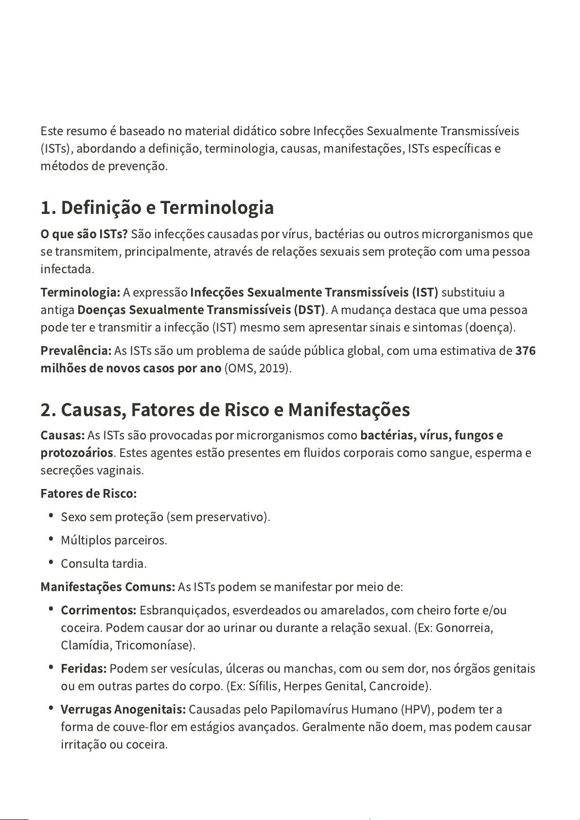 Resumo: Infecções Sexualmente Transmissíveis (ISTs) Este resumo é baseado no material didático sobre Infecções Sexualmente Transmissíveis (ISTs), abordando a definição, terminologia, causas, manifestações, ISTs específicas e métodos de prevenção. 1. Definição e Terminologia O que são ISTs? São infecções causadas por vírus, bactérias ou outros microrganismos que se transmitem, principalmente, através de relações sexuais sem proteção com uma pessoa infectada. Terminologia: A expressão Infecções Sexualmente Transmissíveis (IST) substituiu a antiga Doenças Sexualmente Transmissíveis (DST). A mudança destaca que uma pessoa pode ter e transmitir a infecção (IST) mesmo sem apresentar sinais e sintomas (doença). Prevalência: As ISTs são um problema de saúde pública global, com uma estimativa de 376 milhões de novos casos por ano (OMS, 2019). 2. Causas, Fatores de Risco e Manifestações Causas: As ISTs são provocadas por microrganismos como bactérias, vírus, fungos e protozoários. Estes agentes estão presentes em fluidos corporais como sangue, esperma e secreções vaginais. Fatores de Risco: • Sexo sem proteção (sem preservativo). • Múltiplos parceiros. • Consulta tardia. Manifestações Comuns: As ISTs podem se manifestar por meio de: • Corrimentos: Esbranquiçados, esverdeados ou amarelados, com cheiro forte e/ou coceira. Podem causar dor ao urinar ou durante a relação sexual. (Ex: Gonorreia, Clamídia, Tricomoníase). • Feridas: Podem ser vesículas, úlceras ou manchas, com ou sem dor, nos órgãos genitais ou em outras partes do corpo. (Ex: Sífilis, Herpes Genital, Cancroide). • Verrugas Anogenitais: Causadas pelo Papilomavírus Humano (HPV), podem ter a forma de couve-flor em estágios avançados. Geralmente não doem, mas podem causar irritação ou coceira. 3. ISTs Específicas IST Agente Causal Sintomas Principais Diagnóstico Tratamento Clamídia Bactéria (Chlamydia trachomatis) Dor ao urinar, corrimento incomum, dor na barriga (mulheres), dor e inchaço nos testículos (homens). Coleta de amostras de secreções ou urina. Antibióticos. Não cria imunidade. HPV Vírus (Papilomavírus Humano) Verrugas genitais, alterações celulares que podem levar ao câncer. Muitas vezes assintomático. Exames clínicos (urológico, ginecológico) e laboratoriais (Papanicolau, colposcopia, peniscopia). Individualizado para as verrugas (laser, eletrocauterizaç ão, ATA). Não há tratamento específico para eliminar o vírus. HIV Vírus (Vírus da Imunodeficiênci a Humana) Fase inicial: sintomas de gripe (febre, mal-estar). Fase sintomática: febre, diarreia, suores noturnos, emagrecimento. Estágio AIDS: aparecimento de doenças oportunistas (tuberculose, pneumonia, cânceres). Testes rápidos (30 minutos) ou laboratoriais (sangue/fluido oral) para detectar anticorpos. Medicamentos Antirretrovirais (ARV) para impedir a multiplicação do vírus e evitar o enfraqueciment o do sistema imunológico. Sífilis Bactéria (Treponema pallidum) Feridas/úlceras indolores (cancro duro), erupção vermelha (palmas/solas), Teste rápido de sífilis (SUS), seguido de teste laboratorial Penicilina benzatina (Benzetacil). Tratamento deve ser estendido crescimentos na pele, febre, dores nas articulações. para confirmação. ao(s) parceiro(s). Hepatites B e C Vírus (HBV e HCV) Cansaço, mal- estar, dor abdominal, febre, pele e olhos amarelados (icterícia), urina clara e fezes escuras. Exames de sangue. Necessário intervalo de 60 dias para detecção. A Hepatite B não tem cura, mas o tratamento (SUS) visa reduzir a progressão e complicações. A Hepatite C tem cura com tratamento. Herpes Vírus (Herpesvírus tipo 1 e 2) Formigamento, coceira, ardor, dor, vermelhidão, bolhas e feridas. Análise de amostra da ulceração ou exames de sangue para anticorpos. Medicamentos antivirais (Aciclovir, Valaciclovir) para aliviar sintomas. Tricomoníase Protozoário (Trichomonas vaginalis) Corrimento vaginal amarelo- esverdeado/cinz a, bolhoso e espumoso, com mau cheiro (peixe). Coceira, sangramento e dor após relação sexual. Relato de sintomas e observação do parasita no microscópio. Antibióticos. Tratamento simultâneo do parceiro. Gonorreia Bactéria (Neisseria gonorrhoeae) Dor/ardor ao urinar, corrimento branco- amarelado (pus), inflamação das glândulas de Bartholin. Pode causar infertilidade se não tratada. Relato de sintomas e observação do agente no microscópio. Antibióticos (Azitromicina e Ceftriaxona). 4. Prevenção O método mais eficaz para evitar a transmissão das ISTs é o uso de camisinha (masculina ou feminina) em todas as relações sexuais. Outras medidas complementares de prevenção incluem: • Imunização para Hepatite A, Hepatite B e HPV. • Testagem regular para HIV e outras ISTs. • Tratamento como Prevenção (TcP) para Pessoas Vivendo com HIV (PVHIV) (I=I: Indetectável = Intransmissível). • Realização de exames preventivos (colpocitologia oncótica). • Uso de Profilaxia Pré-Exposição (PrEP) e Profilaxia Pós-Exposição (PEP), quando indicados.