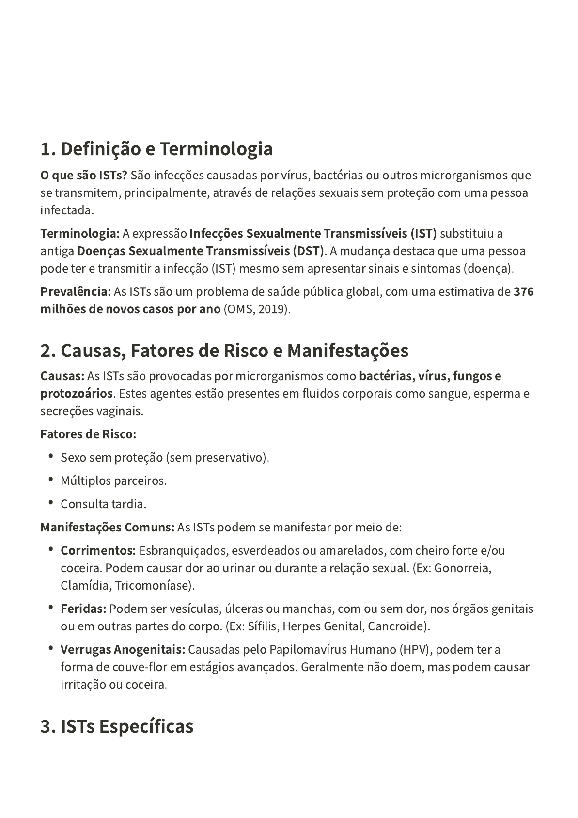 Resumo: Infecções Sexualmente Transmissíveis (ISTs) 1. Definição e Terminologia O que são ISTs? São infecções causadas por vírus, bactérias ou outros microrganismos que se transmitem, principalmente, através de relações sexuais sem proteção com uma pessoa infectada. Terminologia: A expressão Infecções Sexualmente Transmissíveis (IST) substituiu a antiga Doenças Sexualmente Transmissíveis (DST). A mudança destaca que uma pessoa pode ter e transmitir a infecção (IST) mesmo sem apresentar sinais e sintomas (doença). Prevalência: As ISTs são um problema de saúde pública global, com uma estimativa de 376 milhões de novos casos por ano (OMS, 2019). 2. Causas, Fatores de Risco e Manifestações Causas: As ISTs são provocadas por microrganismos como bactérias, vírus, fungos e protozoários. Estes agentes estão presentes em fluidos corporais como sangue, esperma e secreções vaginais. Fatores de Risco: • Sexo sem proteção (sem preservativo). • Múltiplos parceiros. • Consulta tardia. Manifestações Comuns: As ISTs podem se manifestar por meio de: • Corrimentos: Esbranquiçados, esverdeados ou amarelados, com cheiro forte e/ou coceira. Podem causar dor ao urinar ou durante a relação sexual. (Ex: Gonorreia, Clamídia, Tricomoníase). • Feridas: Podem ser vesículas, úlceras ou manchas, com ou sem dor, nos órgãos genitais ou em outras partes do corpo. (Ex: Sífilis, Herpes Genital, Cancroide). • Verrugas Anogenitais: Causadas pelo Papilomavírus Humano (HPV), podem ter a forma de couve-flor em estágios avançados. Geralmente não doem, mas podem causar irritação ou coceira. 3. ISTs Específicas IST Agente Causal Sintomas Principais Diagnóstico Tratamento Clamídia Bactéria (Chlamydia trachomatis) Dor ao urinar, corrimento incomum, dor na barriga (mulheres), dor e inchaço nos testículos (homens). Coleta de amostras de secreções ou urina. Antibióticos. Não cria imunidade. HPV Vírus (Papilomavírus Humano) Verrugas genitais, alterações celulares que podem levar ao câncer. Muitas vezes assintomático. Exames clínicos (urológico, ginecológico) e laboratoriais (Papanicolau, colposcopia, peniscopia). Individualizado para as verrugas (laser, eletrocauterizaç ão, ATA). Não há tratamento específico para eliminar o vírus. HIV Vírus (Vírus da Imunodeficiênci a Humana) Fase inicial: sintomas de gripe (febre, mal-estar). Fase sintomática: febre, diarreia, suores noturnos, emagrecimento. Estágio AIDS: aparecimento de doenças oportunistas (tuberculose, pneumonia, cânceres). Testes rápidos (30 minutos) ou laboratoriais (sangue/fluido oral) para detectar anticorpos. Medicamentos Antirretrovirais (ARV) para impedir a multiplicação do vírus e evitar o enfraqueciment o do sistema imunológico. Sífilis Bactéria (Treponema pallidum) Feridas/úlceras indolores (cancro duro), erupção vermelha (palmas/solas), crescimentos na pele, febre, Teste rápido de sífilis (SUS), seguido de teste laboratorial para confirmação. Penicilina benzatina (Benzetacil). Tratamento deve ser estendido ao(s) parceiro(s). dores nas articulações. Hepatites B e C Vírus (HBV e HCV) Cansaço, mal- estar, dor abdominal, febre, pele e olhos amarelados (icterícia), urina clara e fezes escuras. Exames de sangue. Necessário intervalo de 60 dias para detecção. A Hepatite B não tem cura, mas o tratamento (SUS) visa reduzir a progressão e complicações. A Hepatite C tem cura com tratamento. Herpes Vírus (Herpesvírus tipo 1 e 2) Formigamento, coceira, ardor, dor, vermelhidão, bolhas e feridas. Análise de amostra da ulceração ou exames de sangue para anticorpos. Medicamentos antivirais (Aciclovir, Valaciclovir) para aliviar sintomas. Tricomoníase Protozoário (Trichomonas vaginalis) Corrimento vaginal amarelo- esverdeado/cinz a, bolhoso e espumoso, com mau cheiro (peixe). Coceira, sangramento e dor após relação sexual. Relato de sintomas e observação do parasita no microscópio. Antibióticos. Tratamento simultâneo do parceiro. Gonorreia Bactéria (Neisseria gonorrhoeae) Dor/ardor ao urinar, corrimento branco- amarelado (pus), inflamação das glândulas de Bartholin. Pode causar infertilidade se não tratada. Relato de sintomas e observação do agente no microscópio. Antibióticos (Azitromicina e Ceftriaxona). 4. Prevenção O método mais eficaz para evitar a transmissão das ISTs é o uso de camisinha (masculina ou feminina) em todas as relações sexuais. Outras medidas complementares de prevenção incluem: • Imunização para Hepatite A, Hepatite B e HPV. • Testagem regular para HIV e outras ISTs. • Tratamento como Prevenção (TcP) para Pessoas Vivendo com HIV (PVHIV) (I=I: Indetectável = Intransmissível). • Realização de exames preventivos (colpocitologia oncótica). • Uso de Profilaxia Pré-Exposição (PrEP) e Profilaxia Pós-Exposição (PEP), quando indicados.