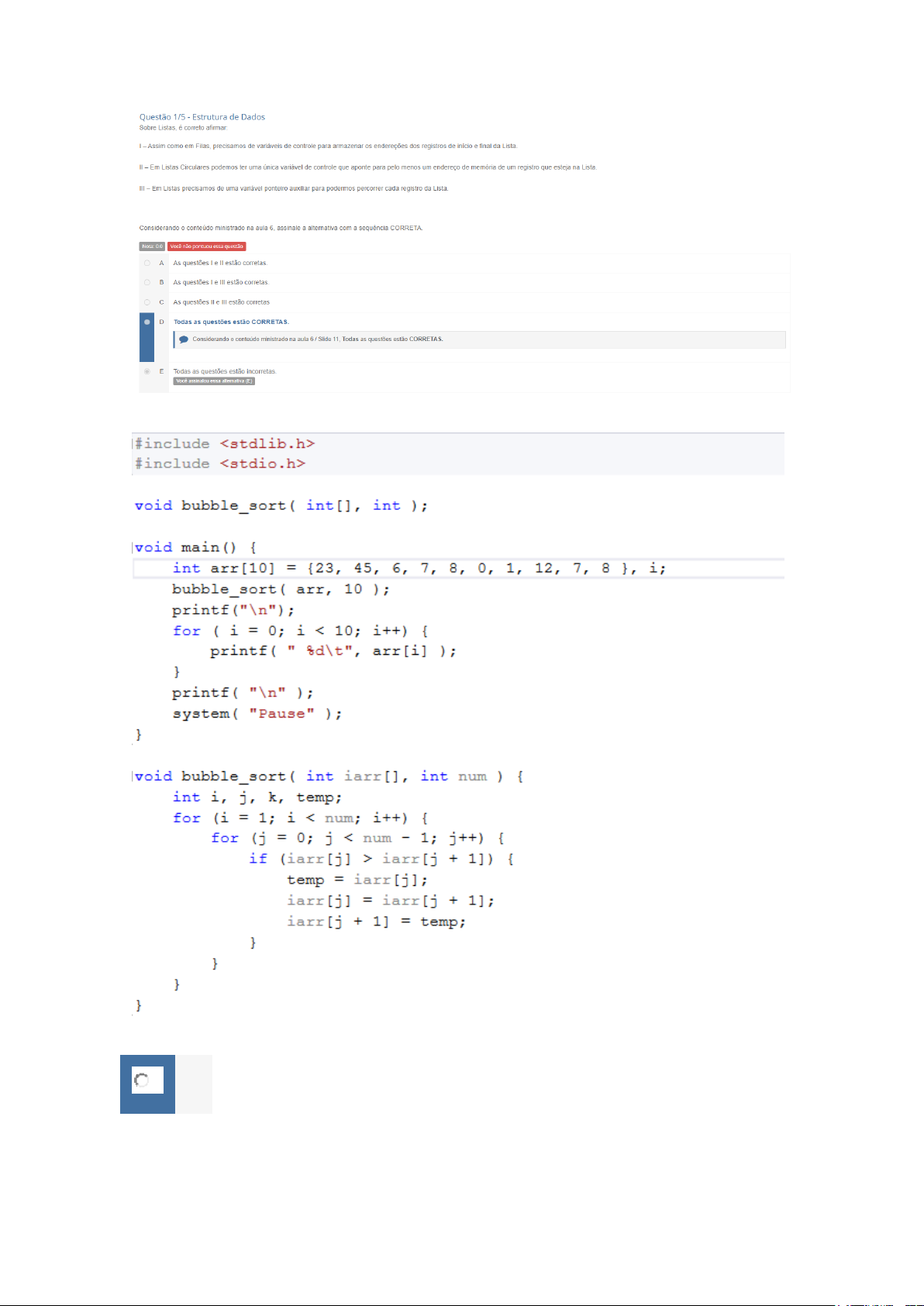 APOL 05 APOL 05 Questão 2/5 - Estrutura de Dados Considerando o código a seguir: Indique qual das opções a seguir apresenta o resultado que será visto na janela do console caso este programa seja executado. A 0 1 6 7 7 8 8 12 23 45 Pressione qualquer tecla para continuar. . . APOL 05 APOL 05 Questão 3/5 - Estrutura de Dados Lista é um conceito de trabalho, uma metodologia com regras, similar a Pilhas e Filas. Para a montagem das Listas utilizamos alocação dinâmica de memória, ponteiros e registros. Com base nisso e com as afirmações a seguir, responda: I – Assim como Pilhas e Filas, em Listas somente podemos incluir no início ou no final de uma lista. II – Diferente de Pilhas e Filas, em Listas podemos incluir no meio de uma Lista. III – Em Listas podemos incluir de forma ordenada as informações. Deste modo, podemos em uma mesma Lista incluir no início, no final ou no meio (entre dois registros). Considerando o conteúdo ministrado na aula 6, assinale a alternativa CORRETA E Estão corretas as questões II e III Questão 5/5 - Estrutura de Dados Sobre registros utilizados em Listas Duplamente Encadeadas, qual das questões está incorreta. Considerando o conteúdo ministrado na aula 6, assinale a alternativa INCORRETA E Os registros possuem duas variáveis ponteiros do mesmo tipo do registro, para armazenar o endereço do próprio registro e do próximo da Lista APOL 05 APOL 05 Questão 4/5 - Estrutura de Dados Na tentativa de criar um programa para testar os conceitos de filas, você escreveu o seguinte código: APOL 05 APOL 05 APOL 05 APOL 05 APOL 05 APOL 05 No entanto, o seu programa não funcionou e você precisa encontrar onde está o erro e cabe a você garantir que o código apresentado atenda a estrutura básica de um programa contendo uma lista. Considerando as opções a seguir, maque aquela que contém a linha de código que está errada. A temp = cauda;