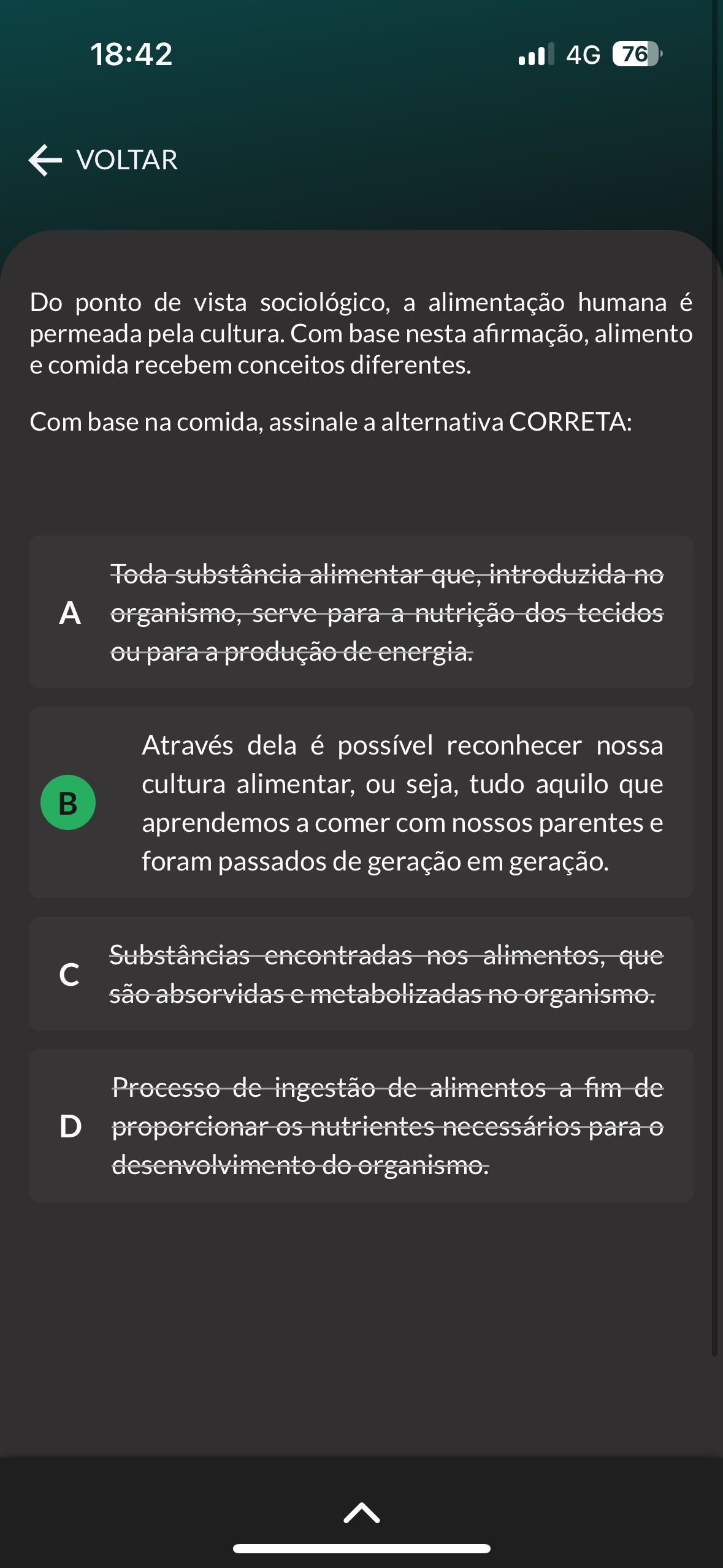18:42 4G 76 VOLTAR Do ponto de vista sociológico, a alimentação humana é permeada pela cultura. Com base nesta afirmação, alimento e comida recebem conceitos diferentes. Com base na comida, assinale a alternativa CORRETA: Toda substância alimentar que, introduzida no A organismo, serve para a nutrição dos tecidos ou para a produção de energia. Através dela é possível reconhecer nossa cultura alimentar, ou seja, tudo aquilo que aprendemos a comer com nossos parentes e foram passados de geração em geração. Substâncias encontradas nos alimentos, que c são absorvidas e metabolizadas no organismo. Processo de ingestão de alimentos a fim de D proporcionar nutrientes necessários para desenvolvimento do organismo.