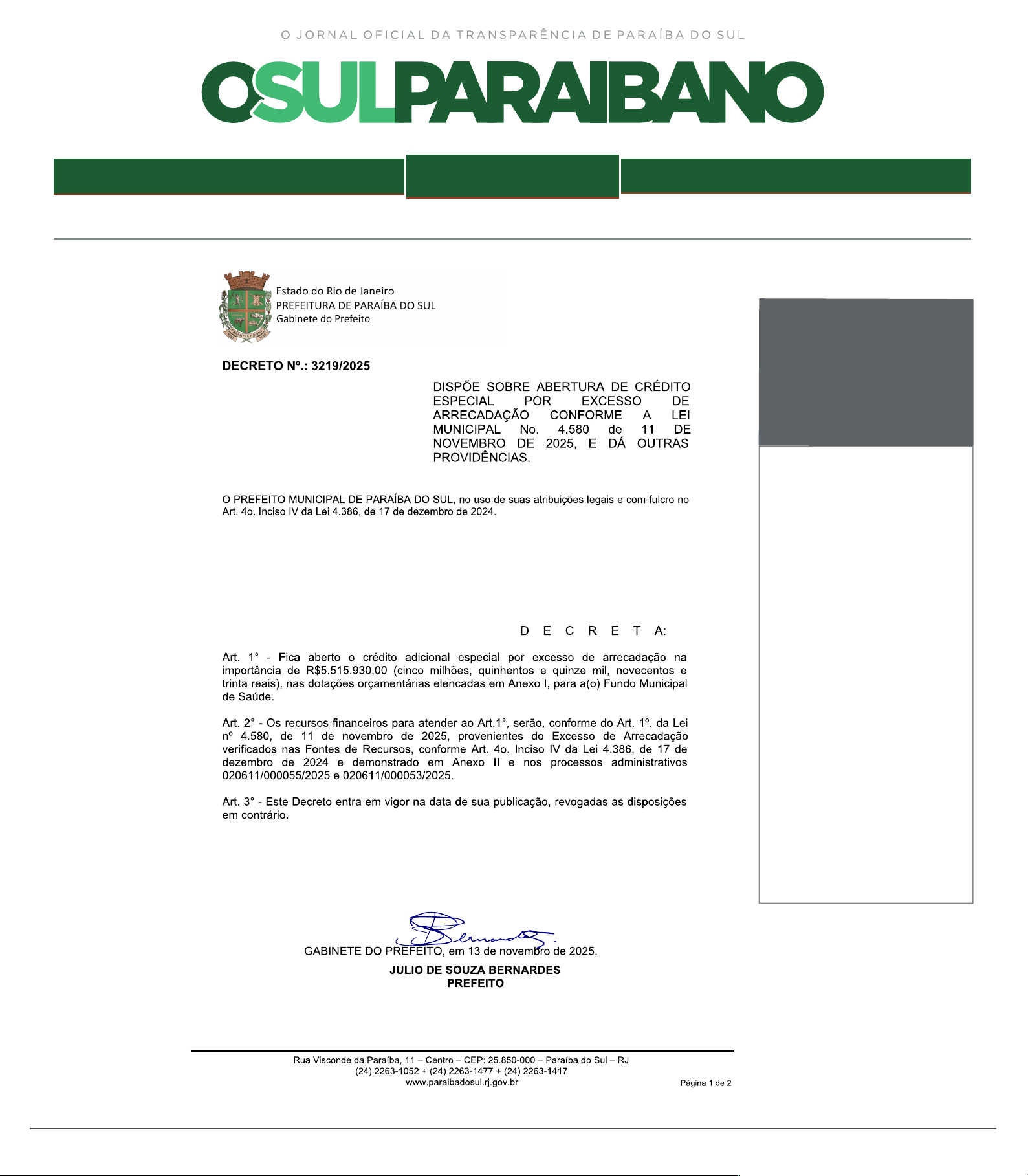 O SUL PARAIBANO EXPEDIENTE Júlio de Souza Bernardes Prefeito Gilberto José da Silva Leal Vice Prefeito Rua Visconde de Paraíba, 11 Centro - Paraíba do Sul-RJ CEP 25850-000 Tels.: (24) 2263-1052 / 1477 / 1417 www.paraibadosul.rj.gov.br www.facebook.com/prefeitu raparaibadosul ATOS DO GOVERNO Órgão da Imprensa oficial do Município de Paraíba do Sul-RJ Lei 3.337 de 24 de Fevereiro de 2017 Ano 9 • Edição 1614 • 14 de novembro de 2025 DECRETO REPUBLICADO POR INCORREÇÃO Página 1 Ano 9 • Edição 1614 • 14 de novembro de 2025 Página 2 Ano 9 • Edição 1614 • 14 de novembro de 2025 Página 3 Ano 9 • Edição 1614 • 14 de novembro de 2025 PUBLICADO POR OMISSÃO Página 4 Ano 9 • Edição 1614 • 14 de novembro de 2025 Página 5 Ano 9 • Edição 1614 • 14 de novembro de 2025 Ano 9 • Edição 1614 • 14 de novembro de 2025Página 6 Ano 9 • Edição 1614 • 14 de novembro de 2025Página 7 EXTRATO Praça Garcia, 96 – Centro Paraíba do Sul – RJ CNPJ: 27.963.040/0001-95 Tel.: (24) 2263-7436 / 2263-7400 EXTRATO DE CONTRATO PARA PUBLICAÇÃO CÂMARA MUNICIPAL DE PARAIBA DO SUL Processo n°: 2025/2271 Número de Contrato: 033/2025 Objeto: Contratação de empresa especializada em trabalhos de MDF para montagem de móveis planejados para a recepção da Câmara Municipal. Empresa Contratada: ESSENCIA MOVEIS PLANEJADOS LTDA CNPJ da Contratada: 26.279.128/0001-20 Valor: 9.600,00 (nove mil e seiscentos reais) Data da Assinatura do contrato: 31/10/2025 Ano 9 • Edição 1614 • 14 de novembro de 2025Página 8 PUBLICAÇÃO Prefeitura Municipal de Paraíba do Sul Rua Visconde da Paraíba, 11 – Centro, Paraíba do Sul – RJ – 25850-000 CONVOCAÇÃO 17 - EDITAL 01/2025 PROCESSO SELETIVO SIMPLIFICADO - SECRETARIA MUNICIPAL DE SAÚDE Tendo em vista a exoneração de Juliana Cristina Lavinas Faria e a solicitação da Secretaria de Saúde através do memorando nº 118/2025, fica a candidata abaixo discriminada convocada a comparecer ao Setor de Gestão Pública, telefone (24) 2263-3496, situado na Rua Visconde da Paraíba, 11 – Centro – Paraíba do Sul/RJ – Prefeitura Municipal, no dia 25 de novembro de 2025, terça-feira, de 9 às 16 horas, munida dos seguintes DOCUMENTOS (ORIGINAIS E CÓPIAS). DOCUMENTOS EXIGIDOS • RG • CPF • Certidão de Nascimento ou Casamento • Título de eleitor (frente e verso) • Carteira de trabalho (foto e qualificação civil) • Número do PIS/PASEP • Certidão de Nascimento e CPF dos filhos menores de 14 anos • Comprovante de residência recente (água, luz ou telefone) • Comprovante de escolaridade exigido para o cargo • 01 foto 3x4 • Certidão Negativa da Justiça Estadual – Ações Cíveis (solicitar presencialmente no FORUM DA CIDADE ONDE RESIDE ou em www.tjrj.jus.br ) • Certidão Negativa da Justiça Estadual – Ações Criminais (solicitar presencialmente no FORUM DA CIDADE ONDE RESIDE ou em www.tjrj.jus.br ) • Comprovante de registro no conselho de classe e anuidade em dia • Comprovante de vacinação antitetânica e hepatite B em dia EXAMES SOLICITADOS (PARA APRESENTAÇÃO NA PERÍCIA MÉDICA) • HEMOGRAMA COMPLETO, GLICOSE JEJUM, CREATININA, URÉIA • RX DE TÓRAX PA COM LAUDO • COMPROVANTE DE VACINAÇÃO ANTITETÂNICA E HEPATITE B EM DIA • ECG (para candidatos com mais de 35 anos - com laudo) CANDIDATA CONVOCADA: ENFERMEIRO II PCD Pâmela Borges Mello Tibaes Paraíba do Sul, 14 de novembro de 2025. Fernanda Braga Calixto Setor de Gestão Pública Página 9 Ano 9 • Edição 1614 • 14 de novembro de 2025 Página 10 Ano 9 • Edição 1614 • 14 de novembro de 2025 Página 11 Ano 9 • Edição 1614 • 14 de novembro de 2025 Página 12 Ano 9 • Edição 1614 • 14 de novembro de 2025 Página 13 Ano 9 • Edição 1614 • 14 de novembro de 2025 Página 14 Ano 9 • Edição 1614 • 14 de novembro de 2025 Página 15 Ano 9 • Edição 1614 • 14 de novembro de 2025 EXTRATO DE ADESÃO À ATA DE REGISTRO DE PREÇOS O Secretário Municipal de Saúde, considerando as demandas municipais, autoriza a adesão à Ata de Registro de Preços nº 43/2025 do Município de Itaboraí, conforme descrito abaixo: Órgão cedente: SECRETARIA MUNICIPAL DE SAÚDE DO MUNICÍPIO DE ITABORAÍ. Órgão aderente: FUNDO MUNICIPAL DE SAÚDE DE PARAÍBA DO SUL - RJ. Itens Aderidos: ITEM DESCRIÇÃO QUANTIDADE UNIDADE 01 Reagente para diagnóstico clínico 5, tipo de análise; quantitativo de glicose características adicionais: capilar; apresentação: tira fita para determinação de glicemia (hgt). TIRAS REAGENTES PARATESTE DE GLICEMIA QUE FAÇAM AMOSTRA EM SANGUETOTAL COM ACESSO CAPILAR, VENOSO E ARTERIAL, PARAUSO EM PACIENTES ADULTOS, CRIANÇAS, GESTANTES ENEONATOS, POR METODOLOGIA DE BIOSSENSORAMPEROMÉTRICO, COM COLETA DE SANGUE PELA PARTESUPERIOR E POR ASPIRAÇÃO, EVITANDO A CONTAMINAÇÃOCRUZADA E FAIXA DE MEDIÇÃO DO APARELHO ENTRE 20 A600 MG/DL E "HI" ACIMA DE 600 MG/ DL, VOLUME DEVALIDADE DEVE SER DE NO MÍNIMO 12 MESES A CONTAR DAENTREGA É DE 24 MESES A CONTAR DA DATA DEFABRICAÇÃO. SER ACONDICIONADAS EM FRASCOS COM 50UNIDADES, TEMPO DE LEITURA EM ATÉ 5 SEGUNDOS, CONTENDO IDENTIFICAÇÃO, PROCEDÊNCIA, MARCA, DATADE VALIDADE, E REGISTRO NO MS, ESTUDO ISSO 1597/2023 ECERTIFICADO DE BOAS PRÁTICAS DE FABRICAÇÃO ANVISA-CX C/50 UNID- MARCA ON CALL PLUS. Comodato: DEVERÃO SER FORNECIDOS NA FORMA DECOMODATO, SEM CUSTO PARA O CONTRATANTE 500 APARELHOS GLICOSÍMETROS COM USO LÍTIO COM CAPACIDADE PARA 1000 MEDIÇÕES, GARANTIA DO PRODUTO DEVE SER DE 5 ANOS, COM BOLSA COM ZÍPER PARA TRANSPORTE, A EMPRESA DEVE 20.000 CAIXAS Página 16 Ano 9 • Edição 1614 • 14 de novembro de 2025 FORNECER CASO SOLICITADO, SOLUÇÃO CONTROLE COM 3 NÍVEIS DE CONTRAÇÃO, CONSTANDO NÚMERO DO REGISTRO, INDELÉVEL, NO MS – MARCA ON CALL PLUS. Totais da Adesão Valor total a aderir R$ 1.040.000,00 Percentual a aderir 22,22% Empresa: MEDSAUDE DISTRIBUIDORA DE MEDICAMENTOS LTDA. CNPJ: 27.844.493/0001-00. Proce