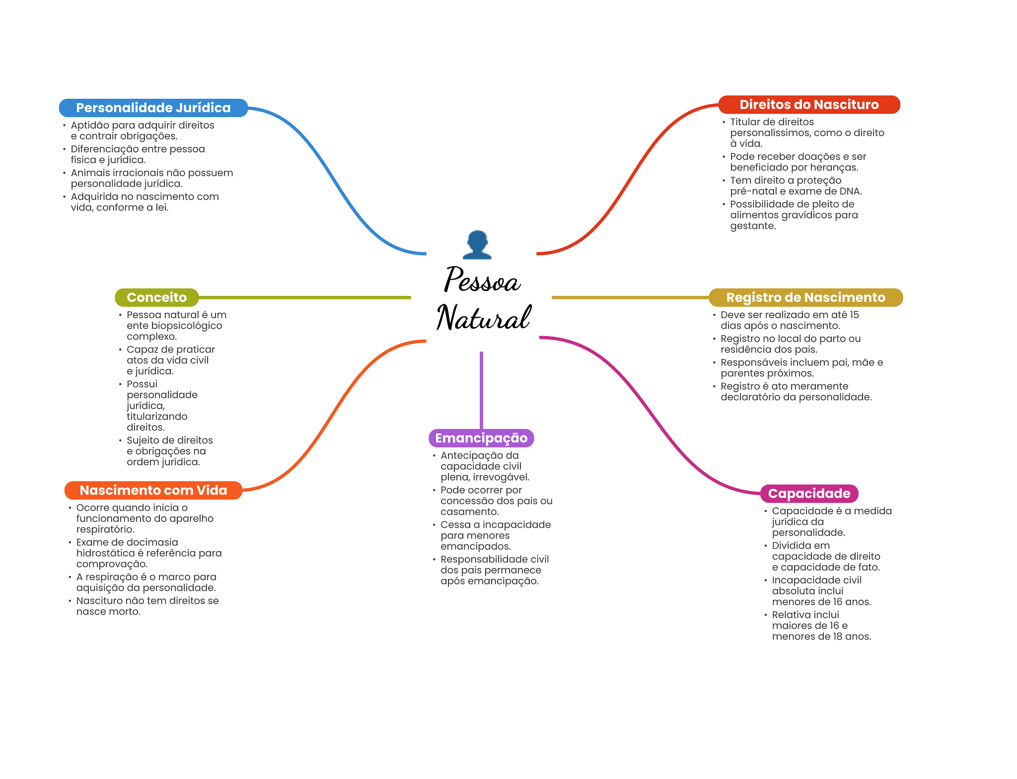 Personalidade Jurídica Direitos do Nascituro Aptidão para adquirir direitos Titular de direitos e contrair obrigações. como direito à vida. Diferenciação entre pessoa física e jurídica. Pode receber doações e ser Animais irracionais não possuem beneficiado por heranças. personalidade jurídica. Tem direito a proteção Adquirida no nascimento com pré-natal e exame de DNA. vida, conforme a lei. Possibilidade de pleito de alimentos gravídicos para gestante. Pessoa Conceito Registro de Nascimento Pessoa natural é um ente biopsicológico Natural Deve ser realizado em até 15 dias após nascimento. complexo. Registro no local do parto ou Capaz de praticar residência dos pais. atos da vida civil Responsáveis incluem pai, mãe e e jurídica. parentes próximos. Possui Registro é ato meramente personalidade declaratório da personalidade. jurídica, titularizando direitos. Sujeito de direitos Emancipação e obrigações na Antecipação da ordem jurídica. capacidade civil plena, irrevogável. Nascimento com Vida Pode ocorrer por Capacidade concessão dos pais ou Ocorre quando inicia casamento. Capacidade é a medida funcionamento do aparelho respiratório. Cessa a incapacidade jurídica da para menores personalidade. Exame de docimasia emancipados. Dividida em hidrostática é referência para Responsabilidade civil capacidade de direito comprovação. dos pais permanece e capacidade de fato. A respiração é marco para após emancipação. Incapacidade civil aquisição da personalidade. absoluta inclui Nascituro não tem direitos se menores de 16 anos. nasce morto. Relativa inclui maiores de 16 e menores de 18 anos.