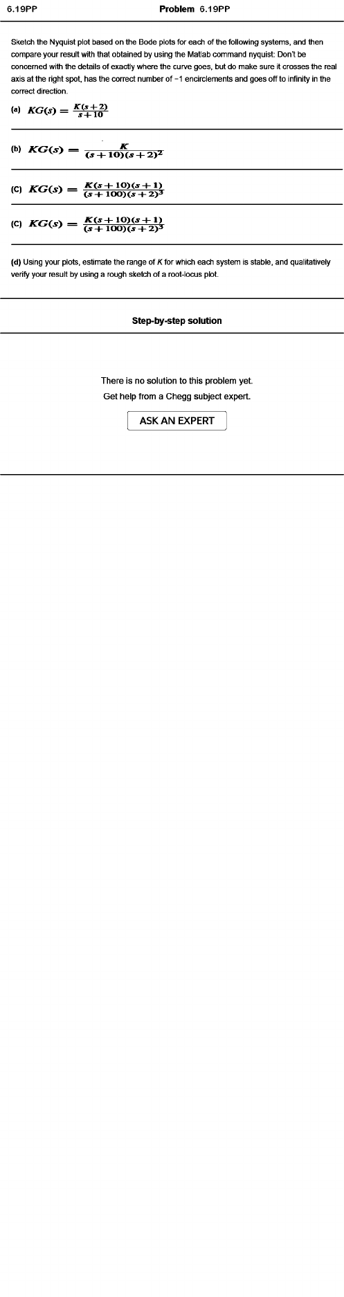Problem 6.19PP Sketch the Nyquist plot based on the Bode plots for each of the following systems, and then compare your result with that obtained by using the Matlab command nyquist; Don’t be concerned with the details of exactly where the curve goes, but do make sure it crosses the real axis at the right spot, has the correct number o f -1 encirclements and goes off to infinity in the correct direction. (a) X G (S ) = (b) K C ? ( s y = i s -+- 1 0 )C ^ + 2>2 + 1 0 ) ( j + 1 ) (C ) K C ^ i ^ s y — i f '\ + 1 0 ) ( j + 1 ) (C ) K C ^ i ^ s y — ( , _ j _ i o o ) ( ; 5 + 2 ) a (d) Using your plots, estimate the range of K for which each system is stable, and qualitatively verify your result by using a rough sketch of a root-locus plot. Step-by-step solution There is no solution to this problem yet. Get help from a Chegg subject expert. ASK AN EXPERT