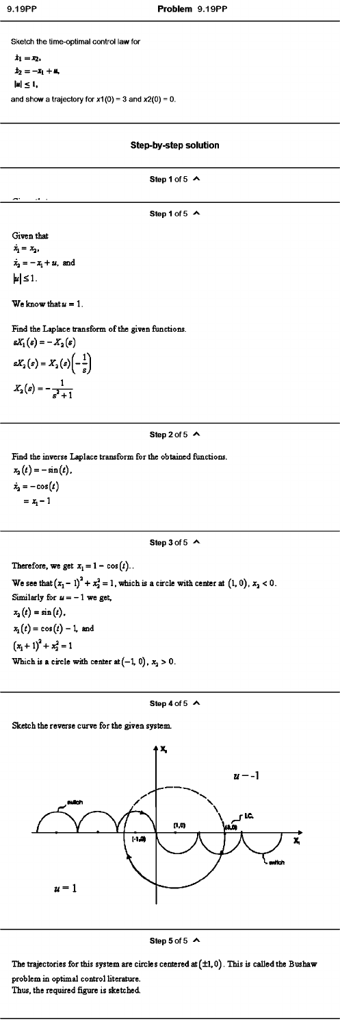 Problem 9.19PP Sketch the time-optimal control law for X I = X 2 , JC2=-Xl+U. IkI 0. Step 4 of 5 Sketch the reverse curve for the given system. Step 5 of 5 The trajectories for this system are circle s centered at (±1,0 ) . This is called the Bushaw problem in optimal control literature. Thus, the required figure is sketched.