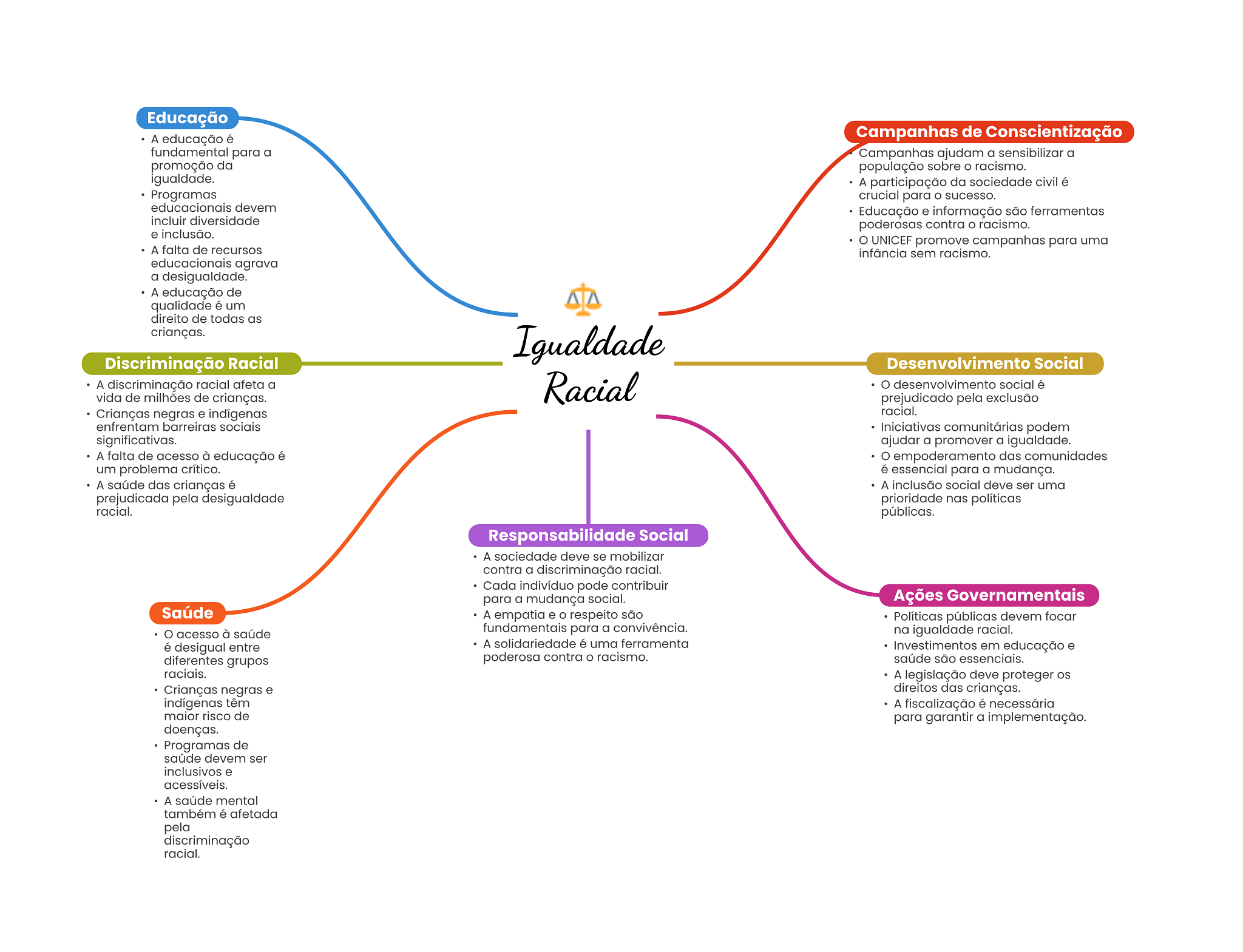 Educação A educação é Campanhas de Conscientização fundamental para a Campanhas ajudam a sensibilizar a promoção da população sobre racismo. igualdade. A participação da sociedade civil é Programas crucial para sucesso. educacionais devem Educação e informação são ferramentas incluir diversidade poderosas contra racismo. e inclusão. UNICEF promove campanhas para uma A falta de recursos infância sem racismo. educacionais agrava a desigualdade. A educação de qualidade é um direito de todas as crianças. Igualdade Discriminação Racial Desenvolvimento Social A discriminação racial afeta a vida de milhões de crianças. Racial desenvolvimento social é prejudicado pela exclusão Crianças negras e indígenas racial. enfrentam barreiras sociais Iniciativas comunitárias podem significativas. ajudar a promover a igualdade. A falta de acesso à educação é empoderamento das comunidades um problema crítico. é e essencial para a mudança. A saúde das crianças é A inclusão social deve ser uma prejudicada pela desigualdade prioridade nas políticas racial. públicas. Responsabilidade Social A sociedade deve se mobilizar contra a discriminação racial. Cada indivíduo pode contribuir para a mudança social. Ações Governamentais Saúde A empatia e O respeito são Políticas públicas devem focar acesso à saúde fundamentais para a convivência. na igualdade racial. é desigual entre A solidariedade é uma ferramenta Investimentos em educação e diferentes grupos poderosa contra racismo. saúde são essenciais. raciais. A legislação deve proteger OS Crianças negras e direitos das crianças. têm A fiscalização é necessária maior risco de para garantir a implementação. doenças. Programas de saúde devem ser inclusivos e acessíveis. A saúde mental também é afetada pela discriminação racial.