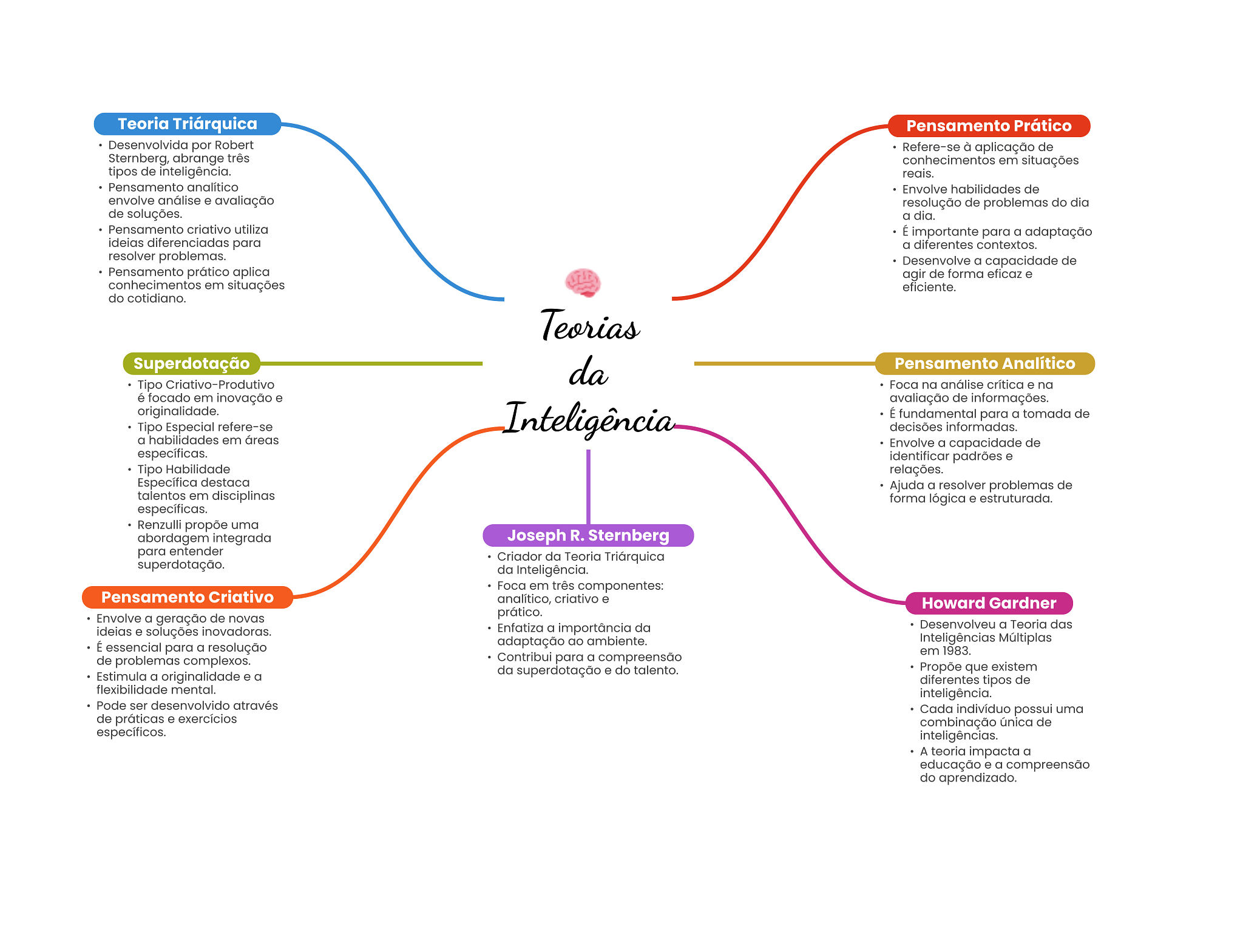 Teoria Triárquica Pensamento Prático Desenvolvida por Robert Refere-se à aplicação de Sternberg, abrange três conhecimentos em situações tipos de inteligência. reais. Pensamento analítico Envolve habilidades de envolve análise e avaliação resolução de problemas do dia de soluções. a dia. Pensamento criativo utiliza É importante para a adaptação ideias diferenciadas para a diferentes contextos. resolver problemas. Desenvolve a capacidade de Pensamento prático aplica agir de forma eficaz e conhecimentos em situações eficiente. do cotidiano. Teorias Superdotação da Pensamento Analítico Tipo Criativo-Produtivo Foca na análise crítica e na é focado em inovação e avaliação de informações. originalidade. Inteligência É fundamental para a tomada de Tipo Especial refere-se decisões informadas. a habilidades em áreas Envolve a capacidade de específicas. identificar padrões e Tipo Habilidade relações. Específica destaca Ajuda a resolver problemas de talentos em disciplinas forma lógica e estruturada. específicas. Renzulli propõe uma abordagem integrada Joseph R. Sternberg para entender Criador da Teoria Triárquica superdotação. da Inteligência. Foca em três componentes: Pensamento Criativo analítico, criativo e Howard Gardner Envolve a geração de novas prático. ideias e soluções inovadoras. Enfatiza a importância da Desenvolveu a Teoria das adaptação ao ambiente. Inteligências Múltiplas É essencial para a resolução em 1983. de problemas complexos. Contribui para a compreensão da superdotação e do talento. Propõe que existem Estimula a originalidade e a diferentes tipos de flexibilidade mental. inteligência. Pode ser desenvolvido através Cada indivíduo possui uma de práticas e exercícios combinação única de específicos. inteligências. A teoria impacta a educação e a compreensão do aprendizado.