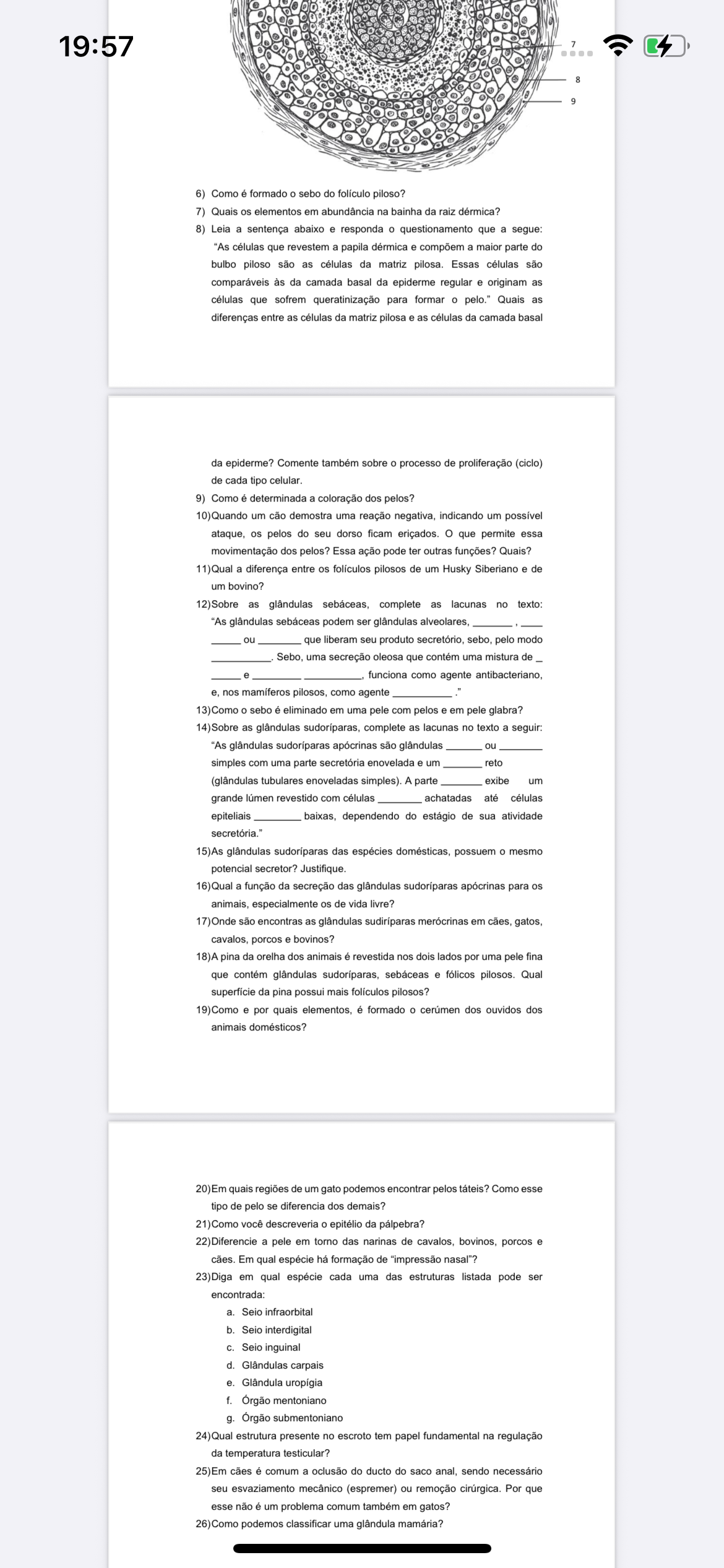 57 7 8 9 6) Como é formado O sebo do folículo piloso? 7) Quais elementos em abundância na bainha da raiz dérmica? 8) Leia a sentença abaixo e responda O questionamento que a segue: "As células que revestem a papila dérmica e compõem a maior parte do bulbo piloso são as células da matriz pilosa. Essas células são comparáveis às da camada basal da epiderme regular e originam as células que sofrem queratinização para formar pelo." Quais as diferenças entre as células da matriz pilosa e as células da camada basal da epiderme? Comente também sobre processo de proliferação (ciclo) de cada tipo celular. 9) Como é determinada a coloração dos pelos? 10) Quando um cão demostra uma reação negativa, indicando um possível ataque, os pelos do seu dorso ficam eriçados. que permite essa movimentação dos pelos? Essa ação pode ter outras funções? Quais? )Qual a diferença entre folículos pilosos de um Husky Siberiano e de um bovino? 12) Sobre as glândulas sebáceas, complete as lacunas no texto: "As glândulas sebáceas podem ser glândulas alveolares. ou que liberam seu produto secretório, sebo, pelo modo Sebo, uma secreção oleosa que contém uma mistura de e funciona como agente antibacteriano, e, nos mamíferos pilosos, como agente 13) Como O sebo é eliminado em uma pele com pelos e em pele glabra? 14) Sobre as glândulas complete as lacunas no texto a seguir: "As glândulas sudoríparas apócrinas são glândulas ou simples com uma parte secretória enovelada e um reto (glândulas tubulares enoveladas simples). A parte exibe um grande lúmen revestido com células achatadas até células epiteliais baixas, dependendo do estágio de sua atividade secretória." 15)As glândulas sudoríparas das espécies domésticas, possuem O mesmo potencial secretor? Justifique. 16)Qual a função da secreção das glândulas apócrinas para animais, especialmente de vida livre? 17) Onde são encontras as glândulas sudiríparas merócrinas em cães, gatos, cavalos, porcos e bovinos? 18)A pina da orelha dos animais é revestida nos dois lados por uma pele fina que contém glândulas sebáceas e fólicos pilosos. Qual da pina possui mais folículos pilosos? 19) Como e por quais elementos, é formado O cerúmen dos ouvidos dos animais domésticos? 20)Em quais regiões de um gato podemos encontrar pelos Como esse tipo de pelo se diferencia dos demais? 21) Como você descreveria epitélio da pálpebra? 22) Diferencie a pele em torno das narinas de cavalos, bovinos, porcos e cães. Em qual espécie há formação de "impressão nasal"? 23) Diga em qual espécie cada uma das estruturas listada pode ser encontrada: a. Seio infraorbital b. Seio interdigital C. Seio inguinal d. Glândulas carpais e. Glândula uropígia f. Órgão mentoniano g. Orgão submentoniano 24)Qual estrutura presente no escroto tem papel fundamental na regulação da temperatura testicular? 25) Em cães é comum a oclusão do ducto do saco anal, sendo necessário seu esvaziamento mecânico (espremer) ou remoção cirúrgica. Por que esse não é um problema comum também em gatos? 26) Como podemos classificar uma glândula mamária?