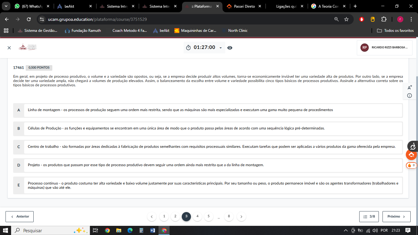 (67) WhatsA beAkt Sistema Inte Sistema Inte Plataforma Passei Direto Ligações qui A Teoria Con + X 0 Sistema de Gestão... Fundação Ramuth Coach Metodo 4 Fa... beAkt Maquininhas de Car... North Clinic Todos os favoritos X MENDES 01:27:00 RP RICARDO RIZZI BARBOSA 17461 0,500 PONTOS Em geral, em projeto de processo volume e a variedade são opostos, ou seja, se a empresa decide produzir altos torna-se economicamente inviável ter uma variedade alta de produtos. Por outro se a empresa decide ter uma variedade ampla, não chegara a volumes de produção elevados. balanceamento da escolha entre volume e variedade possibilita cinco tipos de processos produtivos. Assinale a alternativa correta sobre tipos básicos de processos produtivos. A Linha de montagem processos de produção seguem uma ordem mais sendo que as máquinas são mais especializadas e executam uma gama muito pequena de procedimentos B Células de Produção as funções e equipamentos se encontram em uma única área de modo que produto passa pelas áreas de acordo com uma sequência lógica pré-determinadas. C Centro de trabalho são formadas por áreas dedicadas à fabricação de produtos semelhantes com requisitos processuais similares. Executam tarefas que podem ser aplicadas a vários produtos da gama oferecida pela empresa. D Projeto os produtos que passam por esse tipo de processo produtivo devem seguir uma ordem ainda mais restrita que a da linha de montagem. 0 E Processo contínuo produto costuma ter alta variedade e baixo volume justamente por suas características principais. Por seu tamanho ou peso, produto permanece e são os agentes transformadores (trabalhadores e máquinas) que vão até ele. 3/8 Proximo > Pesquisar POR 21:23