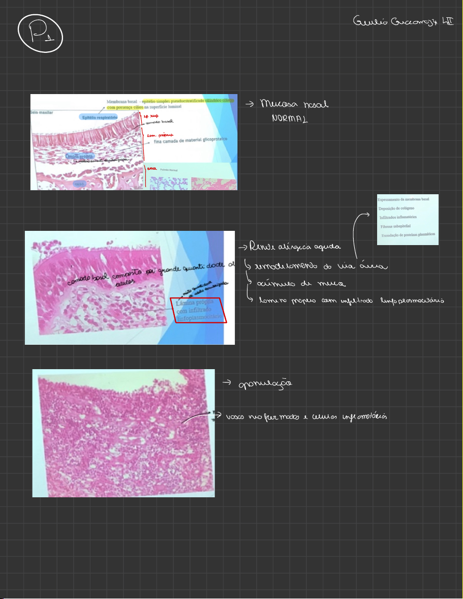 Muroso nosal NORMAL Gerlio Guacomaz LI Pr -> Mucosa nosal Yep. resp NORMAL I com Monria youe -> Rene alérgica aguda ↑ ↳ remodelamento do via áva ↳ aúmulo de mua ↳ lomeno propero com infiltrado Infoplasmocitária -> granulação -> voos no permodas e cura inflamatória Fase aguda inflamatória: congestão de vasos, aumento da celularidade, camada basal hiperplásica/espessa por aumento do número de células normais Fase crônica inflamatória: troca de epitélio (metaplasia escamosa), ciliado → estratificado pavimentoso e perde função ciliar. Fibrose e metaplasia Além da fibrose, há congestão de vasos, hemorragia, celularidade, metaplasia escamosa, espessamento de camada basal = agudização da cronica. - wi m - 08 GO & 6 -> infeticod infomatório 8 O ↳ area hemanopea Septo interalveolar é moderadamente espesso e vascularizado → quando ha um processo inflamatório = aumento de celularidade e congestão de vasos = ele se distende e pode se romper Ruptura por pressão por mal funcionamento alveolar (problemas congenitos - deficiencia de alfa1-antitripsina pelo fígado - , hábitos de vida, patologias - rinite) Ruptura de septo interalveolar formando grandes cavidades preenchidas de ar = ENFISEMA -> Enfesemo Pulmonar ↳ rupturo do repto interalveolar # Chuestais P1 : a) Enfesemo Pulmonar b) Rupturo dos septas interalmalares a) Renis alírgua aguda b) ↳ cómeno proprio o infiltrado linfopromocitário 4 & p metaplasia excomosa perudoestratifundo -> estraisfrad hundred pormentasa Enfisema é a ruptura do septo interalveolar no contexto de uma resposta inflamatória. Essa resposta inflamatória pode tambem se acumular na musculatura lisa do bronquíolo e gerar a sua ruptura = distensão irreversível = bronquiectasia Pa Branquecasia 2 E - Na luz há exsudato = não entra ar = compacta o pulmão → compactação de todo lobo pulmonar = hepatização Exsudato seroso → tem restos de células, celula integra, hemacia, celula inflamatoria, neutrofilo, linfocito Serofibrinoso → tem um pouco de fibrose também Mucopurulento → tem bacteria também Brancophumonia ⑳ Game * Sempre ao redor de colonia de bacterias há muita fibrose (libera toxinas e destroi celularidade adjacente) → a destruição forma nova cavidade = ABCESSO (base dele é a fibrose) Abscesso que advem de ação bacteriana = preenchido por exsudato mucopurulento Abscesso é mais comum em fases mais avançadas de processo inflamatório → devido ao agrupamento do microrganismo no espaço intersticial Pode ter formação de abcesso em qualquer tipo de pneumonia → exsudato comprime estrutura do septo alveolar = nova cavidade, destruição de celularidade e preenche com exsudato * Nutroflas malignezos em torna de val hipermeados ↳mu ente O Christais Pa : Alem dessa resposta especifica do processo tuberculoso (formação granulomatosa), tem tambem toda aquela resposta inflamatória → congestão de vasos, aumento de celularidade, aumento de espessura de septos interalveolares, presença de exsudato em luz alveolar (exsudato vem da alteração da permeabilidade da parede do vaso → vaso congesto extravaza celulas inflamatorias e sanguineas que compoe o exsudato) Pr Tuberculose · tentativo de esala um microorganismo que o carpo não combateu · composição : tudo Infarde, gegantocitos e celuras epetibai · quanto maisontigo mais fitas Gugentacita de Longhons f so ↳ nucleos em ferrodura no periferic A formação granulomatosa no caso da TB apresenta necrose caseosa central = peculiaridade do processo tuberculoso. Necrose caseosa central é onde está isolado o bacilo, área de densa celularidade isolando o bacilo Formação do granuloma na fase inicial: nao é bem delimitado → vai progredindo de forma gradual = fica mais delimitado + presença de resposta inflamatória gerada pelo bacilo = exsudato seroso/seromucoso D D ↳ degodão moquenvo e - erreversul dos tr . lesados G Granuloma em processo de cura - - - Ps Tuberculase ↳ Gegentárias de corpo estranho & & O ↳ ballos do tuberculose ↳ inponação conuramotosa Chuestais P3/P5 * S p A-necrose cososa B exudoto entro almalar -> formaco do granuloma encoptuladas C-almalas livres ↑ Talvez Pu Ca não pequeno células (80-15% - Ca ul exanasa - Adenocacinoma - Ca grandes clula Ca pequenos culas (10-15 %) - Ca pequenas alues - Ca clulas examasas oneceso e Nh mue nun come Aderocaunomas : Ca de grandes élula Chuestais PT :