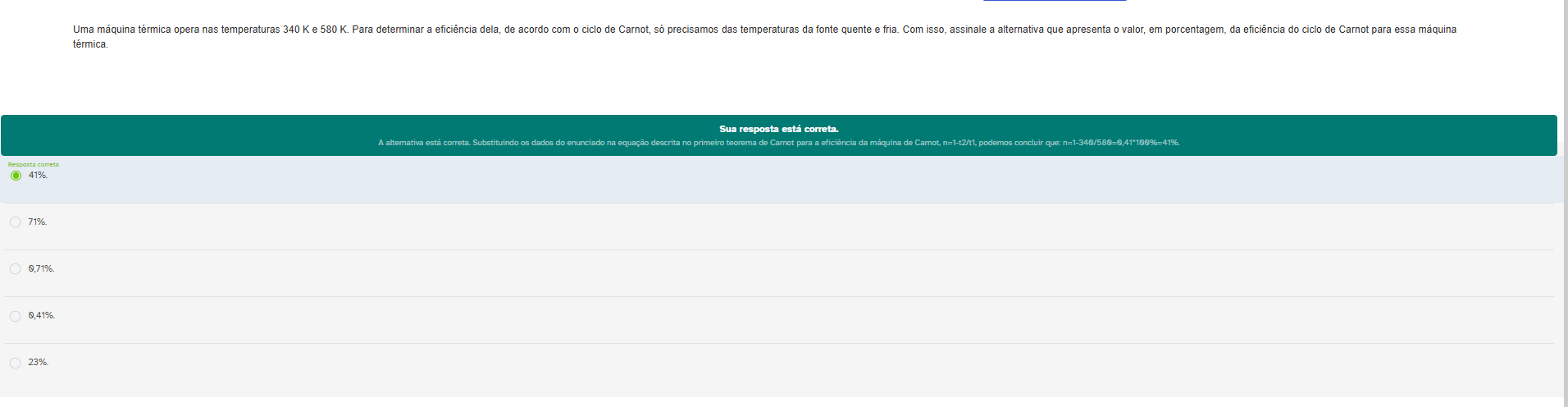 Uma máquina térmica opera nas temperaturas 340 Ke 580 K. Para determinar a eficiência dela, de acordo com 0 ciclo de Carnot, precisamos das temperaturas da fonte quente e fria. Com isso, assinale a alternativa que apresenta 0 valor, em porcentagem, da eficiência do ciclo de Carnot para essa máquina térmica. Sua resposta está correta. A alternativa está correta. Substituindo os dados do enunciado na equação descrita no primeiro teorema de Carnot para a da maquina de n=1-t2/t1, podemos concluir Resposta correta 71% 0,41%