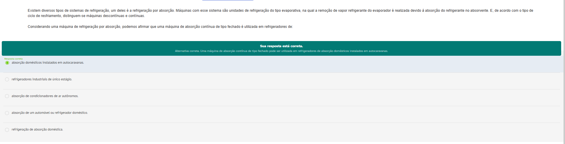 Existem diversos tipos de sistemas de refrigeração, um deles é a refrigeração por absorção. Máquinas com esse sistema são unidades de refrigeração do tipo evaporativa, na qual a remoção de vapor refrigerante do evaporador é realizada devido à absorção do refrigerante no absorvente. E, de acordo com 0 tipo de ciclo de resfriamento, distinguem-se máquinas e Considerando uma máquina de refrigeração por absorção, podemos afirmar que uma máquina de absorção contínua de tipo fechado é utilizada em refrigeradores de: Sua resposta está correta. Alternativa correta. Uma máquina de absorção continua de tipo fechado pode ser utilizada em refrigeradores de absorção domésticos instalados em autocaravanas. Resposta correta absorção domésticos instalados em refrigeradores industriais de único estágio. absorção de condicionadores de ar absorção de um automovel ou refrigerador doméstico. refrigeração de absorção