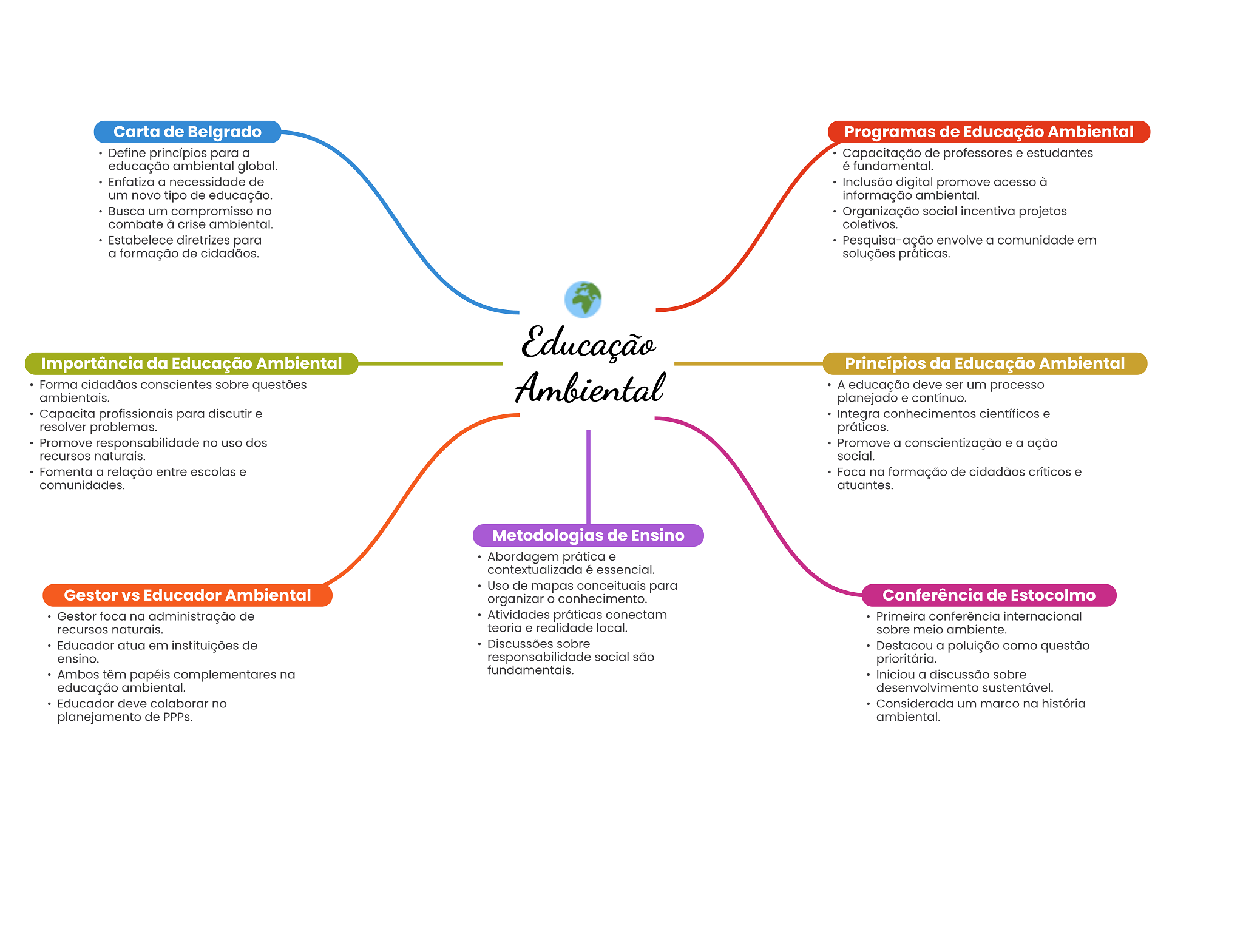 Carta de Belgrado Programas de Educação Ambiental Define princípios para a Capacitação de professores e estudantes educação ambiental global. é fundamental. Enfatiza a necessidade de Inclusão digital promove acesso à um novo tipo de educação. informação ambiental. Busca um compromisso no Organização social incentiva projetos combate à crise ambiental. coletivos. Estabelece diretrizes para Pesquisa-ação envolve a comunidade em a formação de cidadãos. soluções práticas. Educação Importância da Educação Ambiental Princípios da Educação Ambiental Forma cidadãos conscientes sobre questões Ambiental A educação deve ser um processo ambientais. planejado e contínuo. Capacita profissionais para discutir e Integra conhecimentos científicos e resolver problemas. práticos. Promove responsabilidade no uso dos Promove a conscientização e a ação recursos naturais. social. Fomenta a relação entre escolas e Foca na formação de cidadãos críticos e comunidades. atuantes. Metodologias de Ensino Abordagem prática e contextualizada é essencial. Uso de mapas conceituais para Gestor vs Educador Ambiental organizar conhecimento. Conferência de Estocolmo Gestor foca na administração de Atividades práticas conectam Primeira conferência internacional recursos naturais. teoria e realidade local. sobre meio ambiente. Educador atua em instituições de Discussões sobre Destacou a poluição como questão ensino. responsabilidade social são prioritária. Ambos têm papéis complementares na fundamentais. Iniciou a discussão sobre educação ambiental. desenvolvimento sustentável. Educador deve colaborar no Considerada um marco na história planejamento de PPPs. ambiental.
