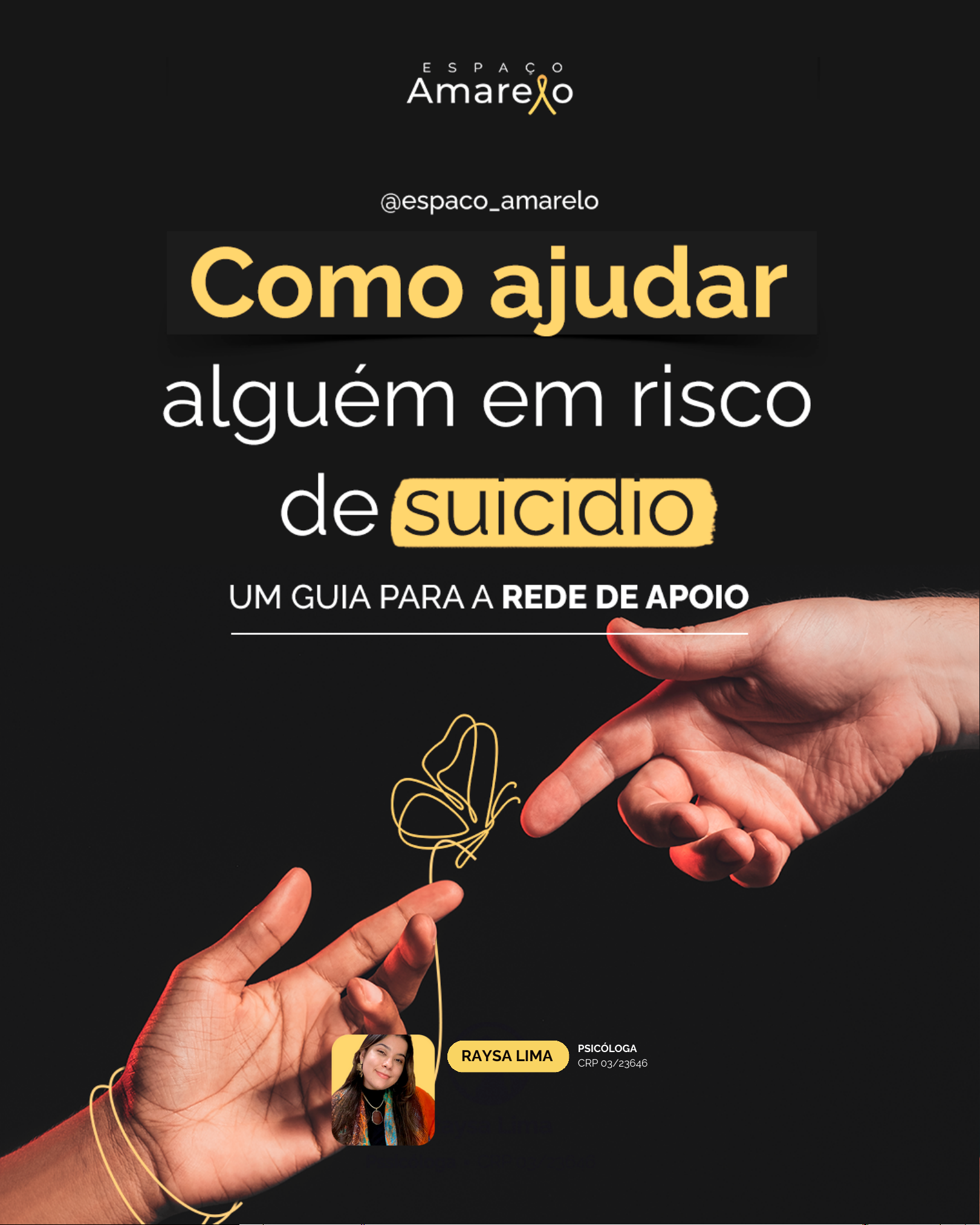 ESPECIALISTA EM PREVENÇÃO DO SUICÍDIO E INTERVENÇÃO E CRISE RAYSA LIMA PSICÓLOGA CRP 03/23646 2023 Espaço Amarelo. Todos os direitos reservados. A reprodução do todo ou parte desse documento é permitida - mas somente para uso não-comercial e mediante atribuição da fonte (instagram @espaco_amarelo). Todo o conteúdo aqui descrito foi produzido com o intuito de promoção de saúde mental em prevenção do suicídio, podendo ser amplamente utilizado em discussões e incorporado em palestras, por exemplo - desde que devidamente referenciado. Atenção: os sinais nem sempre são claros e, por vezes, sequer aparecem. Quais os sinais de que alguém pode estar em risco de suicídio? Desânimo e falta de prazer nas atividades; Autodepreciação; Descuido com a higiene pessoal; Mudança no padrão alimentar; Irritabilidade; Afastamento dos amigos/família/ trabalho; Abuso de substâncias; Realização de rituais de despedidas; Autolesão; E quando a pessoa fala, de fato, em suicídio - dentre outros. É importante saber que, por conta das emoções, da proximidade e mesmo do tabu em relação ao suicídio, os sinais podem passar despercebidos. Muitas pessoas se culpam por não terem percebido - e não é culpa delas. Queria acabar com tudo." "Perdi a vontade de viver." "O mundo seria melhor sem mim." Diante de alguém em profundo sofrimento, o que não falar? E o que falar? Cuidados necessários: como lidar com alguém em profundo sofrimento NADA que julgue ou minimize o sofrimento (é preguiça, é para chamar a atenção, é falta de Deus, etc); NADA de injeções de ânimo (”a vida é bela, pense positivo, veja pelo lado bom”, etc); NADA de tentar “mostrar o lado bom” (”você tem tudo, você é tão bonito/a, você é tão jovem”, etc). “Como você se sente? Como eu posso te ajudar pelo menos um pouco a aliviar essa angústia?” “Eu estou do seu lado, mesmo que você não queira ajuda, nem queira conversar.” “Posso te dar um abraço/te fazer companhia?” “Se você aceitar tentar ir a um profissional, eu posso ir te acompanhar... Você não precisa passar por tudo sozinho(a).” E, mais importante do que falar, é saber escutar (sem interromper ou tentar convencer do contrário). O que fazer quando alguém avisa que vai se suicidar? COMO AJUDAR ALGUÉM EM RISCO DE SUICÍDIO - UM GUIA PARA A REDE DE APOIO Além do passo-a-passo listado nas páginas anteriores, ao encaminhar essa pessoa para algum profissional que possa acompanhá-la, idealmente busque por aqueles que tenham experiência em prevenção ao suicídio e se ofereça para ir com ela até o local no início do acompanhamento (caso ela aceite e necessite desse suporte). Se ela não aceitar no momento, e não aceitar encontrar te pessoalmente para uma conversa, peça para ela pensar e te dar uma resposta até o dia seguinte; peça para que espere por mais um dia para decidir e diga que vai aguardar pela resposta. Observação: Caso seja preciso acionar alguém próximo a essa pessoa, busque alguém que seja da confiança dela e tenha uma relação saudável com ela. @espaco_amarelo http://instagram.com/espaco_amarelo O que fazer diante de uma tentativa de suicídio? COMO AJUDAR ALGUÉM EM RISCO DE SUICÍDIO - UM GUIA PARA A REDE DE APOIO O que fazer quando há uma tentativa de suicídio? Em caso de tentativa: como conduzir? SAMU Bombeiros Compartilhe essas orientações para ter certeza de que a pessoa também saiba o que fazer. ESPECIALISTA EM PREVENÇÃO DO SUICÍDIO E INTERVENÇÃO E CRISE RAYSA LIMA PSICÓLOGA CRP 03/23646 Sobre o Espaço Amarelo O Espaço Amarelo se dedica à Capacitação de profissionais de saúde, educação e afins para com a Prevenção e Posvenção ao Suicídio. O propósito é o de possibilitar que pessoas em profundo sofrimento possam ter um tratamento adequado, por meio do exercício de uma Psicologia mais humanizada e tecnicamente preparada para atender casos graves. No Espaço, você encontrará reflexões, debates e informações sobre a Prevenção e Posvenção do Suicídio, desmitificando equívocos, quebrando os tabus e construindo caminhos - apostando no amanhã. http://instagram.com/espaco_amarelo Se você é profissional da saúde, educação e áreas afins, o Espaço Amarelo oferta o curso de Capacitação Completa em Prevenção do Suicídio. Um curso de introdução à suicidologia, avaliação e manejo. Clique para se inscrever. Quer saber mais? Toque na informação destacada para ser redirecionado. https://espacoamarelo.anoamarelo.com/capacitacaoemprevencaodosuicidio https://espacoamarelo.anoamarelo.com/capacitacaoemprevencaodosuicidio https://espacoamarelo.anoamarelo.com/capacitacaoemprevencaodosuicidio Entre em contato! @ E S P A C O _ A M A R E L O R A Y S A L I M A @ A N O A M A R E L O . C O M ( 7 1 ) 9 9 9 9 6 - 9 1 9 1 Toque nos ícones/informações para ser redirecionado(a). http://instagram.com/espaco_amarelo mailto:RAYSALIMA@ANOAMARELO.COM http://wa.me/5571999792345 http://instagram.com/espaco_amarelo mailto:RAYSALIMA@ANOAMARELO.COM http://wa.me/5571999969191