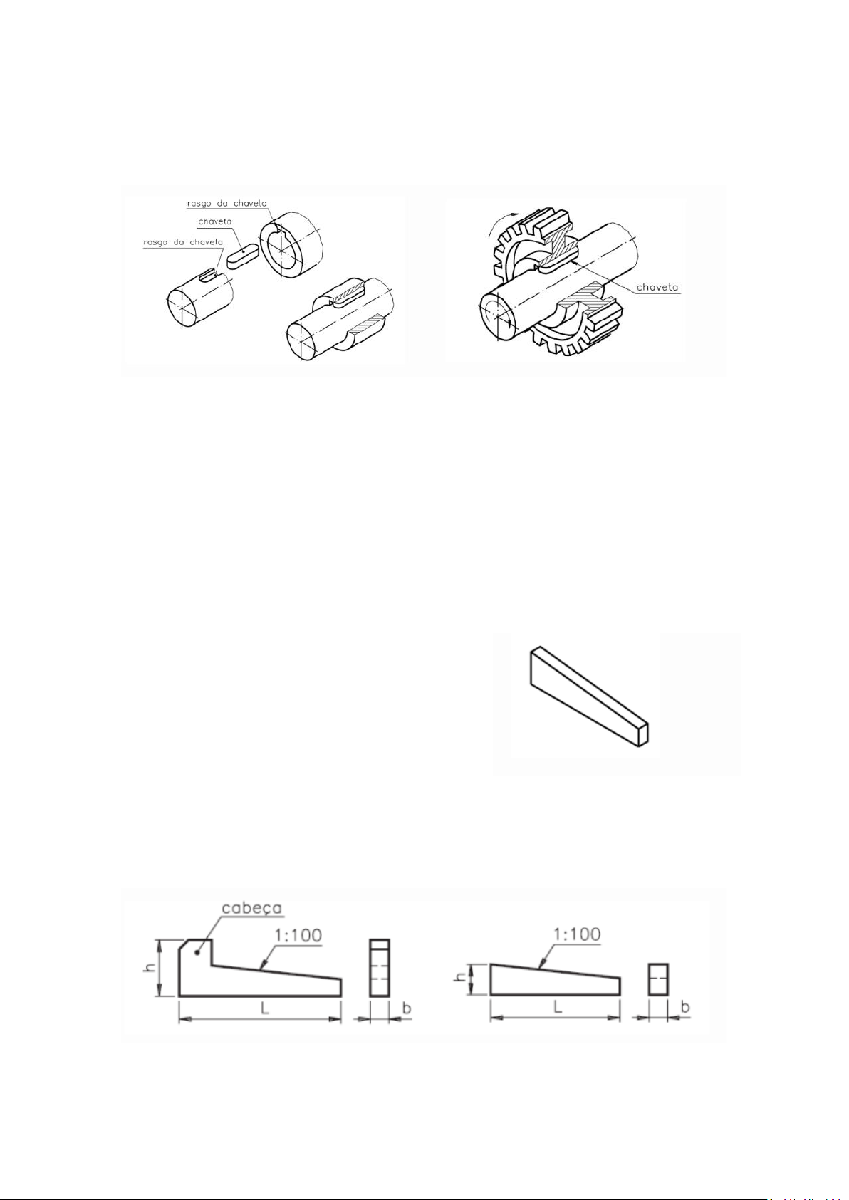 Chaveta É um elemento fabricado em aço. Sua forma geral, em geral, é retangular ou semicircular. A chaveta se interpõe numa cavidade de um eixo e de uma peça A chaveta tem por finalidade ligar dois elementos mecânicos. Classificação: As chavetas se classificam em: • Chavetas de cunha; • Chavetas paralelas; • Chavetas de disco. As chavetas de cunha tem esse nome porque são parecidas com uma cunha. Uma das faces é inclinada, para facilitar a união de peças. Tipos: • Chavetas longitudinais; • Chavetas transversais. Chavetas longitudinais: São colocadas na extensão do eixo para unir roldanas, rodas, volantes etc. Podem ser com ou sem cabeça e são de fácil montagem e desmontagem. Principais características: • Altura; • Comprimento; • Largura. Agora vamos ver os 4 tipos de longitudinais : Chaves encaixadas: São muito usadas. Sua forma corresponde à do tipo mais simples da chaveta de cunha. Para possibilitar seu emprego, o rasgo do eixo é sempre mais comprido que a chaveta Chaveta meia-cana: Sua base é côncava (com mesmo raio do eixo), com ou sem cabeça. Não é necessário rasgo na árvore, pois a chaveta transmite o movimento por efeito do atrito. Desta forma, quando o esforço no elemento conduzido for muito grande, a chaveta desliza sobre a árvore. Chaveta plana: Sua forma é similar à da chaveta encaixada, porém, para sua montagem não se abre rasgo no eixo. É feito um rebaixo plano. Chaveta embutida: Essas chavetas têm os extremos arredondados, conforme se observa na vista superior ao lado. O rasgo para seu alojamento no eixo possui o mesmo comprimento da chaveta. As chavetas embutidas nunca têm cabeça. AGORA CHEGAMOS NAS TRANVERSAIS: Aplicações: São aplicadas em união de peças que transmitem movimentos rotativos e retilíneos alternativos. Quando as chavetas transversais são empregadas em uniões permanentes, sua inclinação varia entre 1:25 e 1:50. Se a união se submete a montagem e desmontagem frequentes, a inclinação pode ser de 1:6 a 1:15. AGORA VAMOS PARA AS CHAVETAS PARALELAS CHAVETAS PARALELAS Características: Essas chavetas têm as faces paralelas, portanto, não têm inclinação. A transmissão do movimento é feita pelo ajuste de suas faces laterais às laterais do rasgo da chaveta. Fica uma pequena folga entre o ponto mais alto da chaveta e o fundo do rasgo do elemento conduzido. Características: As chavetas paralelas não possuem cabeça. Quanto à forma de seus extremos, eles podem ser retos ou arredondados. Podem, ainda, ter parafusos para fixarem a chaveta ao eixo. CHAVETAS DE DISCO (MEIA-LUA) Características: É uma variante da chaveta paralela. Recebe esse nome porque sua forma corresponde a um segmento circular. É comumente empregada em eixos cônicos por facilitar a montagem e se adaptar à conicidade do fundo do rasgo do elemento externo.