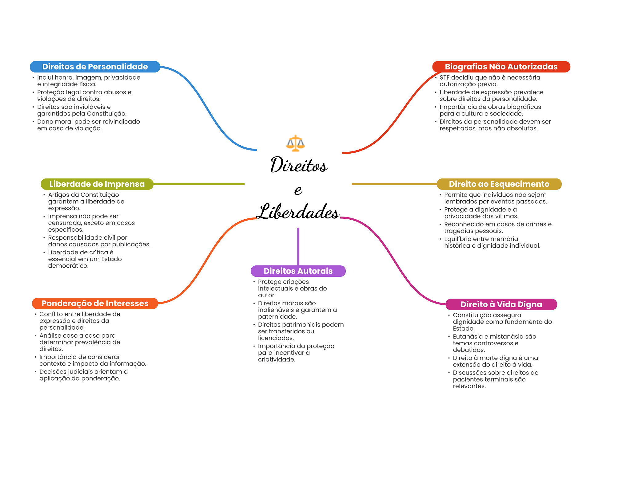 Direitos de Personalidade Biografias Não Autorizadas Inclui honra, imagem, privacidade STF decidiu que não é necessária e integridade física. autorização prévia. Proteção legal contra abusos e Liberdade de expressão prevalece violações de direitos. sobre direitos da personalidade. Direitos são invioláveis e Importância de obras biográficas garantidos pela Constituição. para a cultura e sociedade. Dano moral pode ser reivindicado Direitos da personalidade devem ser em caso de violação. respeitados, mas não absolutos. Direitos Liberdade de Imprensa Direito ao Esquecimento Artigos da Constituição e Permite que indivíduos não sejam garantem a liberdade de lembrados por eventos passados. expressão. Liberdades Protege a dignidade e a Imprensa não pode ser privacidade das vítimas. censurada, exceto em casos Reconhecido em casos de crimes e específicos. tragédias pessoais. Responsabilidade civil por Equilíbrio entre memória danos causados por publicações. histórica e dignidade individual. Liberdade de crítica é essencial em um Estado democrático. Direitos Autorais Protege criações intelectuais e obras do autor. Ponderação de Interesses Direitos morais são Direito à Vida Digna inalienáveis e garantem a Conflito entre liberdade de paternidade. Constituição assegura expressão e direitos da personalidade. Direitos patrimoniais podem dignidade como fundamento do ser transferidos ou Estado. Análise caso a caso para licenciados. Eutanásia e mistanásia são determinar prevalência de temas controversos e direitos. Importância da proteção debatidos. para incentivar a Importância de considerar criatividade. Direito à morte digna é uma contexto e impacto da informação. extensão do direito à vida. Decisões judiciais orientam a Discussões sobre direitos de aplicação da ponderação. pacientes terminais são relevantes.