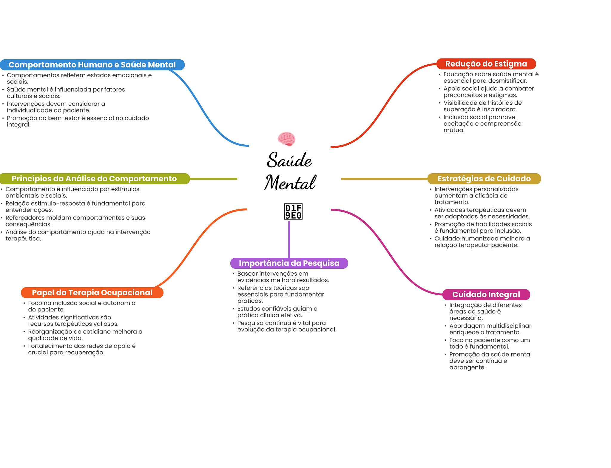 Comportamento Humano e Saúde Mental Redução do Estigma Comportamentos refletem estados emocionais e Educação sobre saúde mental é sociais. essencial para desmistificar. Saúde mental é influenciada por fatores Apoio social ajuda a combater culturais e sociais. preconceitos e estigmas. Intervenções devem considerar a Visibilidade de histórias de individualidade do paciente. superação é inspiradora. Promoção do bem-estar é essencial no cuidado Inclusão social promove integral. aceitação e compreensão mútua. Saúde Princípios da Análise do Comportamento Mental Estratégias de Cuidado Comportamento é influenciado por estímulos Intervenções personalizadas ambientais e sociais. aumentam a eficácia do Relação estímulo-resposta é fundamental para tratamento. entender ações. 01F Atividades terapêuticas devem Reforçadores moldam comportamentos e suas 9E0 ser adaptadas às necessidades. consequências. Promoção de habilidades sociais Análise do comportamento ajuda na intervenção é fundamental para inclusão. terapêutica. Cuidado humanizado melhora a relação terapeuta-paciente. Importância da Pesquisa Basear intervenções em evidências melhora resultados. Referências teóricas são Papel da Terapia Ocupacional essenciais para fundamentar Cuidado Integral Foco na inclusão social e autonomia práticas. Integração de diferentes do paciente. Estudos confiáveis guiam a áreas da saúde é Atividades significativas são prática clínica efetiva. necessária. recursos terapêuticos valiosos. Pesquisa contínua é vital para Abordagem multidisciplinar Reorganização do cotidiano melhora a evolução da terapia ocupacional. enriquece O tratamento. qualidade de vida. Foco no paciente como um Fortalecimento das redes de apoio é todo é fundamental. crucial para recuperação. Promoção da saúde mental deve ser contínua e abrangente.