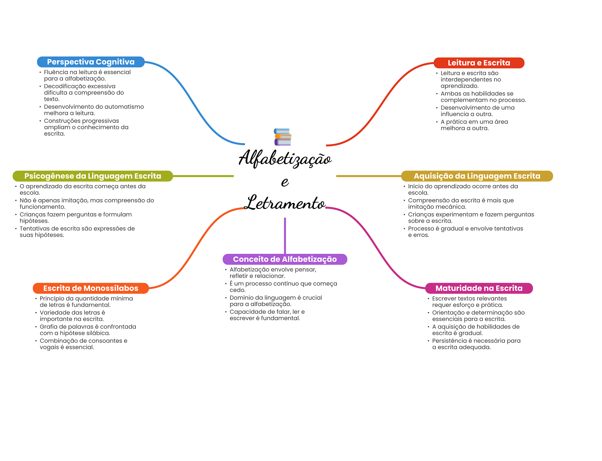 Perspectiva Cognitiva Leitura e Escrita Fluência na leitura é essencial Leitura e escrita são para a alfabetização. interdependentes no Decodificação excessiva aprendizado. dificulta a compreensão do Ambas as habilidades se texto. complementam no processo. Desenvolvimento do automatismo Desenvolvimento de uma melhora a leitura. influencia a outra. Construções progressivas A prática em uma área ampliam conhecimento da melhora a outra. escrita. Alfabetização Psicogênese da Linguagem Escrita Aquisição da Linguagem Escrita aprendizado da escrita começa antes da e Início do aprendizado ocorre antes da escola. escola. Não é apenas imitação, mas compreensão do funcionamento. Letramento Compreensão da escrita é mais que imitação mecânica. Crianças fazem perguntas e formulam Crianças experimentam e fazem perguntas hipóteses. sobre a escrita. Tentativas de escrita são expressões de Processo é gradual e envolve tentativas suas hipóteses. e erros. Conceito de Alfabetização Alfabetização envolve pensar, refletir e relacionar. É um processo contínuo que começa Escrita de Monossílabos cedo. Maturidade na Escrita Princípio da quantidade mínima Domínio da linguagem é crucial Escrever textos relevantes de letras é fundamental. para a alfabetização. requer esforço e prática. Variedade das letras é Capacidade de falar, ler e Orientação e determinação são importante na escrita. escrever é fundamental. essenciais para a escrita. Grafia de palavras é confrontada A aquisição de habilidades de com a hipótese silábica. escrita é gradual. Combinação de consoantes e Persistência é necessária para vogais é essencial. a escrita adequada.