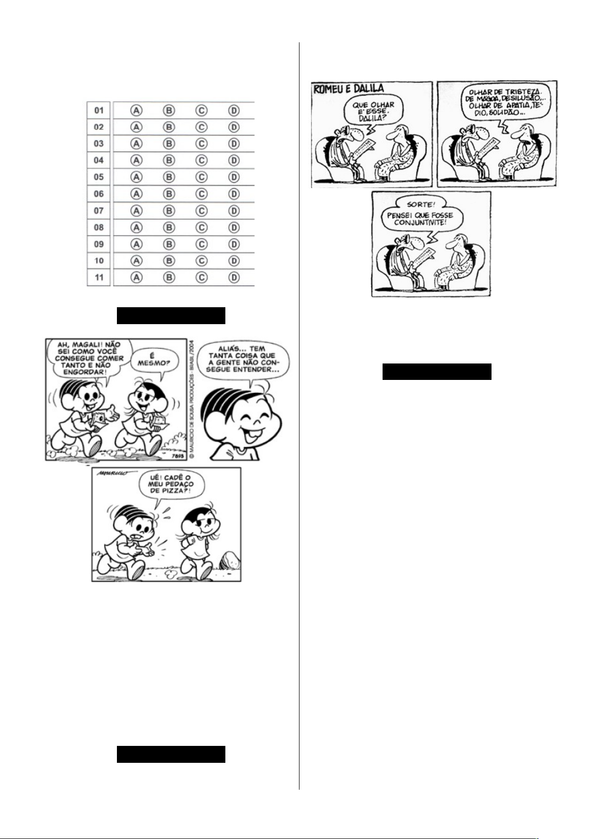 E E Coripheu de Azevedo Marques Prof Sandra Regina Ribeiro- OE- 3° Bimestre Nome__________________n°__7° ANO B D ––––––––– QUESTÃO 01 –––––––––– Leia o texto abaixo. No último quadrinho, o que a Mônica não entendeu? (A) Onde foi que seu pedaço de pizza caiu. (B) O que aconteceu com seu pedaço de pizza. (C) Como a Magali consegue ser tão magrinha. (D) Porque a Magali come muito e não engorda. D ––––––––– QUESTÃO 02 –––––––––– Leia o texto abaixo. A integração de imagens e palavras contribui para a formação de novos sentidos do texto. Observe: A atitude de Romeu em relação a Dalila revela (A) compaixão. (B) companheirismo. (C) insensibilidade. (D) revolta. D ––––––––– QUESTÃO 03 –––––––––– Leia o texto abaixo. De acordo com o poema abaixo: Quadras populares Você me mandou cantar Pensando que eu não sabia Pois eu sou que nem cigarra Canto sempre todo dia. **** Já fui galo, já cantei Já fui dono do terreiro Não me importo que outras cantem Onde eu já cantei primeiro. (AZEVEDO, Ricardo. Bazar do Folclore. São Paulo: Ed. Ática. 2002). Os dois poemas falam: (A) da arte de cantar. (B) de quem canta desolado. (C) de quem não sabia cantar. (D) do galo cantor dono do terreiro. (SAERS). Leia o texto e responda as questão 04, 05 e 06. O socorro Ele foi cavando, cavando, cavando, pois sua profissão – coveiro – era cavar. Mas, de repente, na distração do ofício que amava, percebeu que cavara demais. Tentou sair da cova e não conseguiu. Levantou o olhar para cima e viu que, sozinho, não conseguiria sair. Gritou. Ninguém atendeu. Gritou mais forte. Ninguém veio. Enrouqueceu de gritar, cansou de esbravejar, desistiu com a noite. Sentou-se no fundo da cova, desesperado. A noite chegou, subiu, fez-se o silêncio das horas tardias. Bateu o frio da madrugada e, na noite escura, não se ouvia um som humano, embora o cemitério estivesse cheio de pipilos e coaxares naturais dos matos. Só pouco depois da meia-noite é que lá vieram uns passos. Deitado no fundo da cova o coveiro gritou. Os passos se aproximaram. Uma cabeça ébria apareceu lá em cima, perguntou o que havia: ― “O que é que há?”. O coveiro então gritou desesperado: ―Tire-me daqui, por favor. Estou com um frio terrível!”. ― Mas, coitado!” condoeu-se o bêbado ―Tem toda razão de estar com frio. Alguém tirou a terra de cima de você, meu pobre mortinho!” E pegando a pá, encheu-a de terra e pôs-se a cobri-lo cuidadosamente. Moral: Nos momentos graves é preciso verificar muito bem a quem se apela. FERNANDES, Millôr. Disponível em http://citador.weblog.com.pt/arquivo/109176.html D13 ––––––––– QUESTÃO 04 –––––––––– O que faz esse texto ficar engraçado? A) O bêbado ter imaginado que o coveiro era um morto e jogar terra para cobri-lo. B) O coveiro ficar cavando e sentir frio durante a madrugada. C) O homem ficar sentado no fundo enrouquecido de tanto gritar. D) O homem ter cavado demais e ficar preso no buraco. D8 ––––––––– QUESTÃO 05 –––––––––– O coveiro ficou desesperado por que A) ficou preso no buraco e já era noite. B) ouviu uns passos chegando perto do buraco. C) sentiu medo de ficar sozinho no cemitério. D) viu que um bêbado tinha chegado para ajudá-lo. D10 ––––––––– QUESTÃO 06 –––––––––– “O que é que há?” Quem fez essa pergunta foi: A) O mortinho. B) A cabeça ébria. C) O coveiro. D) O narrador. D5 ––––––––– QUESTÃO 07 –––––––––– Na história, a mulher passa a perseguir o lobisomem. Isto aconteceu por que: A) o lobisomem não queria mais perseguir a mulher. B) o lobisomem se transformou num homem. C) a mulher não tem medo de lobisomem. D) a mulher gosta de perseguir lobisomem. D9 ––––––––– QUESTÃO 08 –––––––––– O objetivo do texto é A) mostrar a importância dos livros. B) divulgar uma feira de livros C) explicar como são feitos os livros. D) indicar locais onde se vendem livros. D11 ––––––––– QUESTÃO 09 –––––––––– (PROEB). Leia o texto abaixo. Esopo O Lobo e a Ovelha Um lobo, muito ferido devido a várias mordidas de cachorros, descansava doente e bastante alquebrado em sua toca. Como estava com fome, ele chamou uma ovelha que passava ali perto, e pediu-lhe para trazer um pouco da água de um riacho que corria ao lado dela. Assim, falou o lobo: ― “se você me trouxer água, eu ficarei em condições de conseguir meu próprio alimento.” ― “Claro!” respondeu a ovelha. ― “Se eu levar água para você, sem dúvida eu serei esse alimento.” http://cantinhodasfabulas.vilabol.uol.com.br/oloboeaove lha.html Qual é a frase que apresenta uma opinião de um dos personagens do texto? A) ― “Como estava com fome, ele chamou uma ovelha que ia passando”. B) O lobo pediu que a ovelha trouxesse água para ele. C) “Se eu levar água para você, sem dúvida eu serei esse alimento”. D) Um lobo repousava doente e bastante debilitado. D4 ––––––––– QUESTÃO 10 –––––––––– Leia o texto abaixo. A fala do personagem no segundo quadrinho indica que ele quer: A) ficar meditando sobre seu trabalho. B) ganhar tempo até começar a trabalhar. C) saborear o almoço que lhe foi servido. D) trabalhar depois do almoço. Leia o texto abaixo e responda da questão 11 Elevador cai do 4º andar e fere 8 em São Carlos – SP Um elevador despencou ontem do 4º. Andar de um edifício em São Carlos, no interior paulista, com 11 pessoas dentro. O Corpo de Bombeiros socorreu dez vítimas do acidente, sendo que cinco foram levadas à Santa Casa da cidade, mas apenas com ferimentos leves. Outras três pessoas tiveram escoriações. ― “O elevador, que tinha saído do 7º. andar, tem capacidade pa