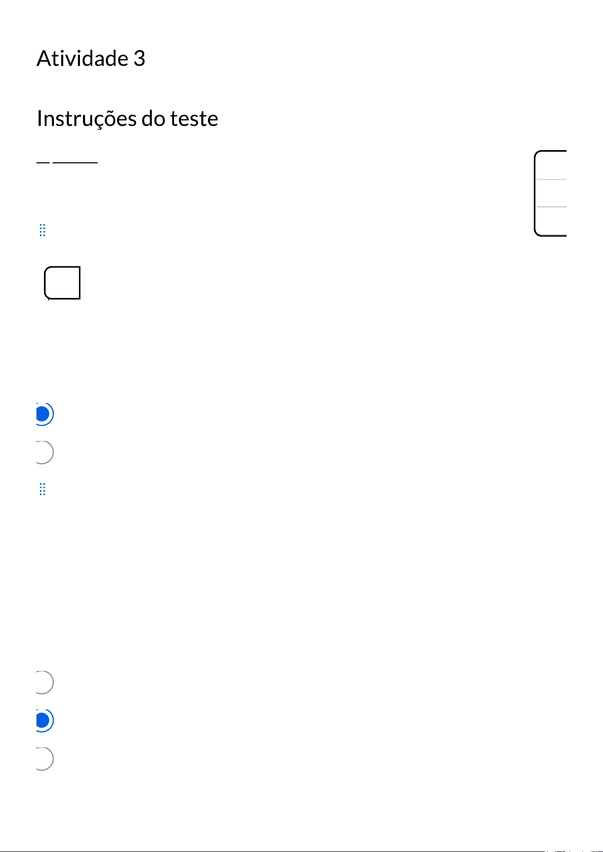 Iniciado: 20 nov em 18:43 Pergunta 1 0,2 pts Pergunta 2 0,2 pts Importante: Caso você esteja realizando a atividade através do aplicativo "Canvas Student", é necessário que você clique em "FAZER O QUESTIONÁRIO", no final da página. Contextualização: "Os modelos de dados são fundamentais para estruturar, organizar e representar informações de forma eficiente, garantindo que os dados possam ser facilmente acessados, manipulados e analisados, seja em sistemas relacionais ou NoSQL." Sobre modelos de dados, assinale verdade ou falso: Modelos de dados relacionais organizam os dados em tabelas com linhas e colunas, e as relações entre os dados são representadas por chaves primárias e chaves estrangeiras. Verdadeiro Falso Contextualização: Sistemas de recomendação são ferramentas utilizadas para sugerir itens relevantes aos usuários com base em seus comportamentos, preferências ou características. Esses sistemas são amplamente utilizados em várias indústrias, como e-commerce, streaming de música e vídeo, redes sociais, entre outras. O principal objetivo de um sistema de recomendação é fornecer uma experiência personalizada, ajudando os usuários a descobrir produtos ou conteúdos que provavelmente irão gostar, sem a necessidade de procurar ativamente. Qual das opções a seguir é uma característica fundamental de um sistema de recomendação? Ele não coleta ou utiliza dados de comportamento dos usuários. Ele utiliza dados históricos de usuários e produtos para sugerir itens que possam ser de interesse. Ele apenas recomenda produtos com base no preço mais baixo. A+ A A- Teste: Atividade 3 https://famonline.instructure.com/courses/48571/quizzes/233597/take 1 of 3 20/11/2025, 18:52 Pergunta 3 0,2 pts Pergunta 4 0,2 pts Ele não utiliza dados históricos de usuários e produtos para sugerir itens que possam ser de interesse. Ele realiza análise de sentimentos em tempo real sobre as opiniões dos usuários.r text provided. Contextualização: "Os bancos de dados NoSQL são projetados para lidar com grandes volumes de dados não estruturados e semi-estruturados, oferecendo flexibilidade, escalabilidade e desempenho, sendo ideais para aplicações modernas que exigem alta disponibilidade e fácil distribuição de dados em ambientes dinâmicos." Qual das alternativas abaixo descreve corretamente uma característica de bancos de dados NoSQL? Bancos de dados NoSQL são baseados em um modelo relacional e utilizam tabelas e chaves primárias para organizar dados, assim como os bancos de dados SQL. Bancos de dados NoSQL são ideais para aplicações que exigem alta consistência, transações complexas e estruturas rígidas de dados. Bancos de dados NoSQL são projetados para armazenar dados não estruturados e semi-estruturados, utilizando modelos como chave-valor, documentos, colunas e grafos. Bancos de dados NoSQL não são escaláveis e, portanto, não são adequados para lidar com grandes volumes de dados. Bancos de dados NoSQL são igual aos bancos de dados SQL. Contextualização: "O Processamento de Transações On-line (OLTP) é fundamental para sistemas que requerem a execução rápida e segura de transações em tempo real, como bancos, e-commerce e sistemas de reservas, garantindo a integridade e a consistência dos dados com alta frequência e baixo tempo de resposta." Qual das seguintes afirmativas sobre o processamento de transações on-line (OLTP) é verdadeira? O OLTP é otimizado somente para processar um número pequeno e limitado de transações simples e rápidas, como compras online, transferências bancárias e atualizações de inventário em tempo real. A+ A A- Teste: Atividade 3 https://famonline.instructure.com/courses/48571/quizzes/233597/take 2 of 3 20/11/2025, 18:52 Pergunta 5 0,2 pts Salvo em 18:52 O OLTP é otimizado para processar um grande número de transações simples e rápidas, como compras online, transferências bancárias e atualizações de inventário em tempo real. O OLTP não requer alta consistência e integridade, pois os dados podem ser alterados de forma inconsistente sem afetar a precisão das transações. O OLTP é projetado para realizar grandes análises de dados históricos, geralmente utilizado para grandes consultas analíticas em vez de processar transações em tempo real. O OLTP geralmente lida com dados não estruturados, como vídeos e imagens, e não é adequado para dados transacionais estruturados. Contextualização: "Os bancos de dados orientados a colunas são ideais para ambientes de análise de grandes volumes de dados, onde consultas rápidas e eficientes em grandes conjuntos de dados de uma única coluna são necessárias, sendo amplamente utilizados em sistemas de BI (Business Intelligence) e Big Data." Qual das afirmações a seguir sobre bancos de dados orientados a colunas é verdadeira? Bancos de dados orientados a colunas não são ideais para análises de grandes volumes de dados em operações OLAP (Online Analytical Processing), devido à sua baixa capacidade de acessar rapidamente grandes volumes de dados de uma única coluna. Bancos de dados orientados a colunas são ideais para análises de grandes volumes de dados em operações OLAP (Online Analytical Processing), devido à sua capacidade de acessar rapidamente grandes volumes de dados de uma única coluna. Bancos de dados orientados a colunas são mais adequados para aplicações OLTP (Online Transaction Processing), que exigem a rápida inserção e atualização de grandes volumes de dados transacionais. Bancos de dados orientados a colunas não oferecem suporte à escalabilidade horizontal e, portanto, são limitados em ambientes com grandes volumes de dados. Em um banco de dados orientado a colunas, os dados são armazenados linha por linha, o que facilita a consulta a registros completos em vez de colunas específicas. A+ A A- Teste: Atividade 3 https://famonline.instructure.com/courses/48571/quizzes/233597/take 3 of 3 20/