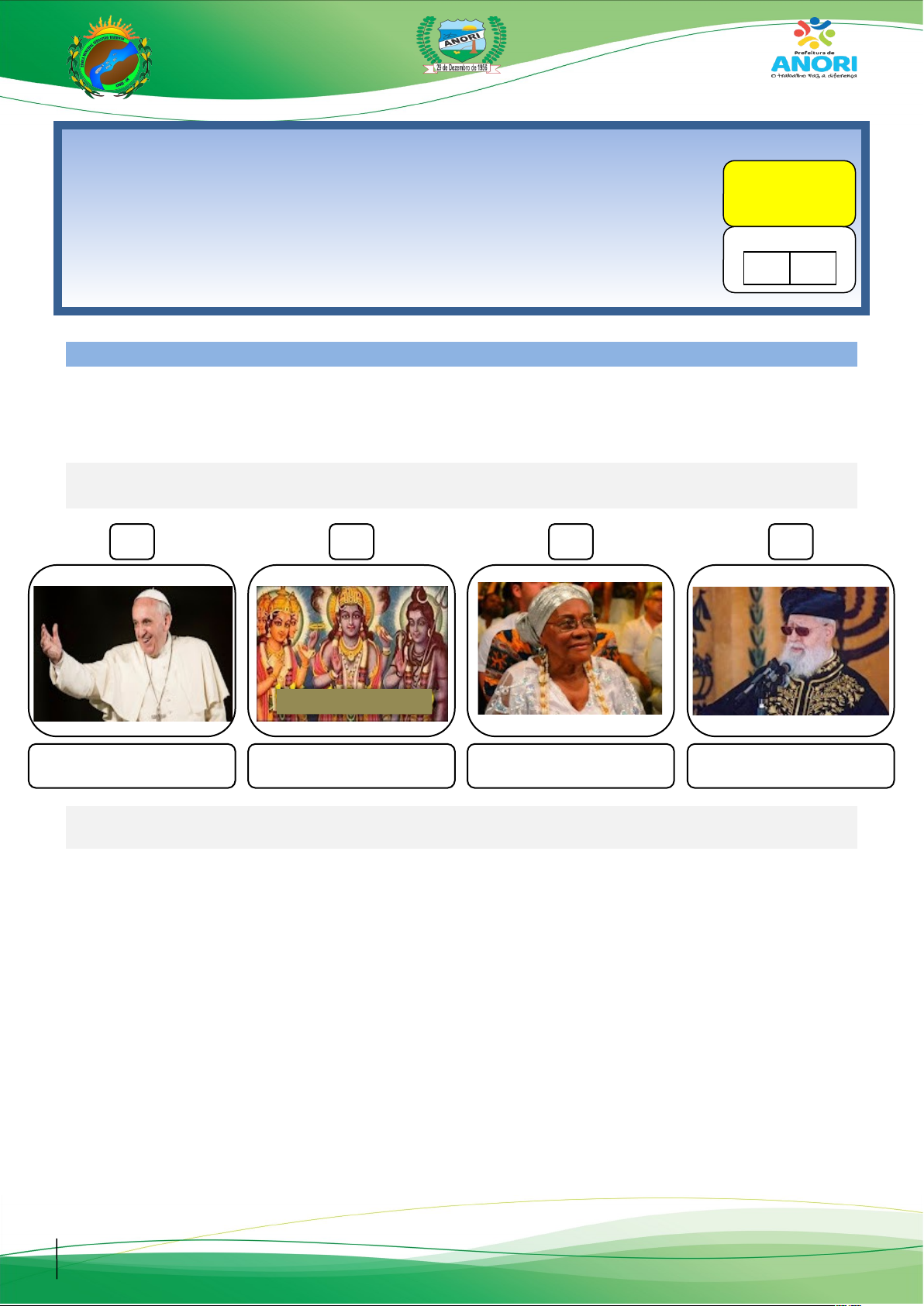 PREFEITURA MUNICIPAL DE ANORI SECRETARIA MUNICIPAL DE EDUCAÇÃO Educação Integral: Diversidade, Qualidade, Equidade, Compromisso de Todos. AVALIAÇÃO SUBJETIVA, DISCURSIVA E OBJETIVA - 4º BIMESTRE Escola Municipal: _________________________________________________________ Coordenador: _______________________________________________________________ Professor(a): _____________________________________________________________ Nome: __________________________________________________________Nº______ Série: ______ano Turma: __________________ Turno: _________________ Data:________/________/2025 Valor da avaliação: 4,0 pontos Nota alcançada ENSINO RELIGIOSO – 6º ao 7º ANO Com base no que foi estudado sobre os tipos de líderes religiosos, sua importância e função, responda aos itens da prova. Item 01. Observe a imagens de alguns líderes religiosos e escreva o nome da religião a qual cada um pertence. (1,6 décimos: 0,4 escrita correta) c) a) b) d) Item 02. Escreva um texto contando a história de um líder religioso que você conhece. Relatando o que ele faz, como agi, como ajuda a humanidade. (1,3 ponto: ortografia, organização, texto coerente e coeso) _____________________________________________________________________________________ _____________________________________________________________________________________ _____________________________________________________________________________________ _____________________________________________________________________________________ _____________________________________________________________________________________ _____________________________________________________________________________________ _____________________________________________________________________________________ __________________________________________________________________________________________________________________________________________________________________________ _____________________________________________________________________________________ _____________________________________________________________________________________ _____________________________________________________________________________________ _____________________________________________________________________________________ _____________________________________________________________________________________ _____________________________________________________________________________________ Item 03. Descreva qual é a importância e função do líder religioso. (0,5 décimos) _____________________________________________________________________________________ _____________________________________________________________________________________ _____________________________________________________________________________________ Item 04. Quem foi Moisés para a religiões cristãs? (0,5 décimos) _____________________________________________________________________________________ _____________________________________________________________________________________ _____________________________________________________________________________________ Item 05. Ainda de acordo com o texto anterior enumere a segunda coluna de acordo com a primeira, referente ao seu líder: (0,5 décimos) (1) Candomblé ( ) Pai de Santo e Mãe de Santo (2) Cristianismo ( ) Sadhus (3) Islamismo ( ) Antigamente Moisés e atualmente Rabino (4) Hinduísmo ( ) Muhammad (Maomé) (5) Judaísmo ( ) Jesus Cristo Item 06. A Liderança é um serviço que todos nós exercemos diariamente na nossa vida. Algumas pessoas se destacam mais e assumem com mais responsabilidade esse papel de liderar. Assim complete a frase que segue: (0,6 décimos) O bom líder é aquele que atua em favor do ________________. Integra as pessoas, motivando-as a desenvolver suas _______________________, não apenas em favor de si, mas também ________________________. Qual das alternativas completa corretamente os espaços da frase acima: A) Bem comum, dificuldades, dos outros. B) Benefício próprio, capacidades intelectuais, dos animais. C) Bem do povo, potencialidades, dos que são individualistas. D) Bem pessoal, ideias, dos mais necessitados. E) Bem comum, capacidades e habilidades, dos outros. Tenha uma ótima avaliação!!! Comunidade: Menino Jesus e São Sebastião II Localidade: Paranã do São Tomé Anori – Amazonas CEP: 69440-000 image2.jpeg image3.jpeg image4.png image1.jpeg image5.png image6.png image7.png image8.png image9.png