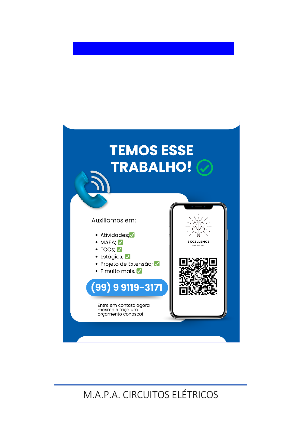 RESPOSTA: (99) 99119 - 3171 MAPA - CIRCUITOS ELÉTRICOS - 54_2025 MAPA - CIRCUITOS ELÉTRICOS - 54_2025 Este M.A.P.A. estará dividido em fases, contextualizadas em diferentes seguimentos da área elétrica, onde você será estimulado a responder às perguntas feitas baseando-se na observação e prática, sempre contando com o embasamento teórico feito durante as aulas. As suas tarefas neste M.A.P.A. serão: EXTENSÔMETRO E PONTE DE WHEATSTONE Os extensômetros, também conhecidos como strain gauges, são usados para medir deformações em diferentes tipos de corpos e estruturas. Estes dispositivos variam a sua resistência elétrica à medida que sofrem deformações mecânicas e por meio de um circuito elétrico é possível mensurar esta (variação de) resistência e associá-la à variação de deformação. Sistemas de medição à strain gauge são aplicados em diversas áreas da instrumentação e controle como medidores de força e torque de uma máquina, transdutores de aceleração (acelerômetros), de vibração, de pressão, células de carga, de deformação em estruturas de concretos, práticas médias e cirúrgicas. O extensômetro é composto de uma finíssima camada de material condutor depositado sobre um composto isolante, que por sua vez é colado sobre a estrutura em teste a partir de adesivos epóxi. Os formatos do strain gauge podem variar de acordo com a aplicação, assim como a quantidade de sensores e posição na peça. As deformações que ocorrem na estrutura alteram os valores dimensionais do strain gauge e a sua resistência altera conforme a equação (1) da Unidade 2: R=ρl/A onde ρ representa a resistividade do material, l é o comprimento, A é a área da seção do condutor. Para ser possível mensurar a variação da resistência, é utilizado um circuito chamado Ponte de Wheatstone, mostrado na Figura 2. O circuito idealizado por Charles Wheatstone em 1843 mostrou-se capaz de medir, com precisão, as resistências elétricas, sendo utilizado para determinar o valor absoluto da resistência por comparação com outras resistências conhecidas e para calcular a variação relativa da resistência elétrica. Analisando a ponte: O circuito é formado por 4 resistências e alimentado por uma fonte de tensão cc entre os nós a e b. O valor de tensão medido entre os pontos c e d será utilizado para calcular o valor da resistência do extensômetro. Atividade 1.1) Considerando que: R1=2 kΩ R2=15 kΩ R3=3 kΩ RSG=9 kΩ Onde RSG é a resistência do strain gauge e V=12 V, calcule a tensão entre os pontos c e d aplicando: 1.1.a) Divisores de tensão. 1.1.b) Divisores de corrente. 1.1.c) Análise Nodal, considerando como GND o nó b. Atividade 1.2) Considere uma segunda situação em que iremos aplicar o strain gauge para medir a força aplicada a uma célula de carga de uma balança. Neste caso, a resistência do Strain Gauge é desconhecida e a partir do cálculo de seu valor, será possível determinar a força aplicada. A Figura 4 mostra a configuração da ponte de Wheatstone com RSG entre os pontos a e b da ponte e 4 resistores com valores conhecidos, R1 a R4. A variação da resistência elétrica do strain gauge é proporcional à variação da força aplicada na célula de carga. Logo, como vimos na Atividade 1.1 deste MAPA, uma vez que a resistência RSG sobre variação, todo o equacionamento deve ser refeito para encontrar o seu valor. Uma forma de simplificar um novo cálculo da resistência RSG a cada variação de força é utilizar o Teorema de Thévenin. Aplicando o Teorema de Thévenin, teremos um circuito simples associado à resistência de interesse, formado por uma fonte de tensão VTh e uma resistência equivalente RTh. Este circuito é mostrado na Figura 5. Desta forma, é possível calcular o novo valor de RSG de forma mais simples a cada novo valor de força aplicada. Agora, aplique o Teorema de Thévenin para simplificar o cálculo da força para o circuito com o strain gauge. 1.2.a) Calcule o valor da Resistência equivalente de Thévenin entre os pontos a e b no circuito da Figura 4 considerando: R1=2 kΩ, R2=15 kΩ, R3=3 kΩ, R4=10 kΩ. 1.2.b) Calcule o valor da tensão equivalente de Thévenin entre os pontos a e b para o circuito da Figura 4 considerando os valores de resistência do item 1.2a. 1.2.c) Qual seria o valor da resistência RSG se o valor da corrente medida entre os pontos a e b fosse de 0,2 mA? FATOR DE POTÊNCIA DE UMA INSTALAÇÃO ELÉTRICA INDUSTRIAL A energia necessária para o funcionamento de equipamentos como motores, transformadores, fornos é formada a partir das componentes: ativa (medida em kWh) e reativa (medida em kVArh). A energia ativa é aquela que realmente executa o trabalho, responsável pelo movimento, aquecimento, iluminação. A energia reativa é a componente que não realiza trabalho, porém é consumida pelos equipamentos com a finalidade de formar os campos eletromagnéticos que também são Alguns equipamentos como motores, transformadores, reatores de iluminação são as principais cargas de uma instalação elétrica responsáveis por consumir energia reativa. A relação entre a potência ativa, que é convertida em trabalho, e a potência total absorvida (potência aparente, em kVA) é chamado de Fator de Potência (FP). Este fator indica o quão eficaz o consumo de energia por parte da instalação ou de um equipamento em específico, sendo 1 o seu valor máximo, quando toda energia drenada da fonte é transformada em trabalho. A Agência Nacional de Energia Elétrica (ANEEL) regulamenta que o Fator de Potência de uma instalação elétrica deve ser mantido o mais próximo possível do valor unitário, mas permite que o valor mínimo seja de 0,92. Se o FP estiver abaixo do valor mínimo, a conta de energia sofrerá um ajuste em reais. Além do ajuste na conta de energia, o baixo fator de potência cria outras situações indesejadas: - Queda na capacidade dos alimentadores 